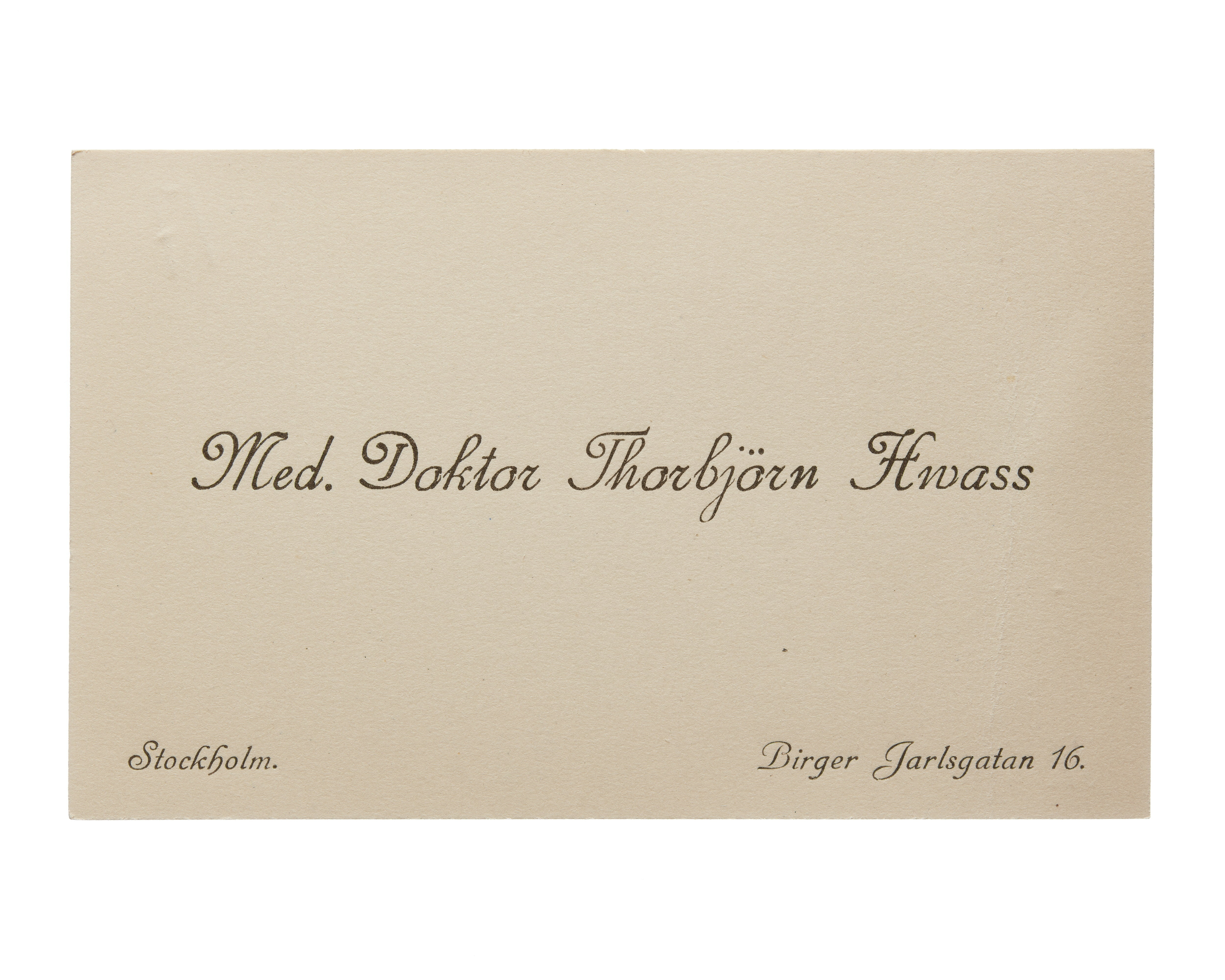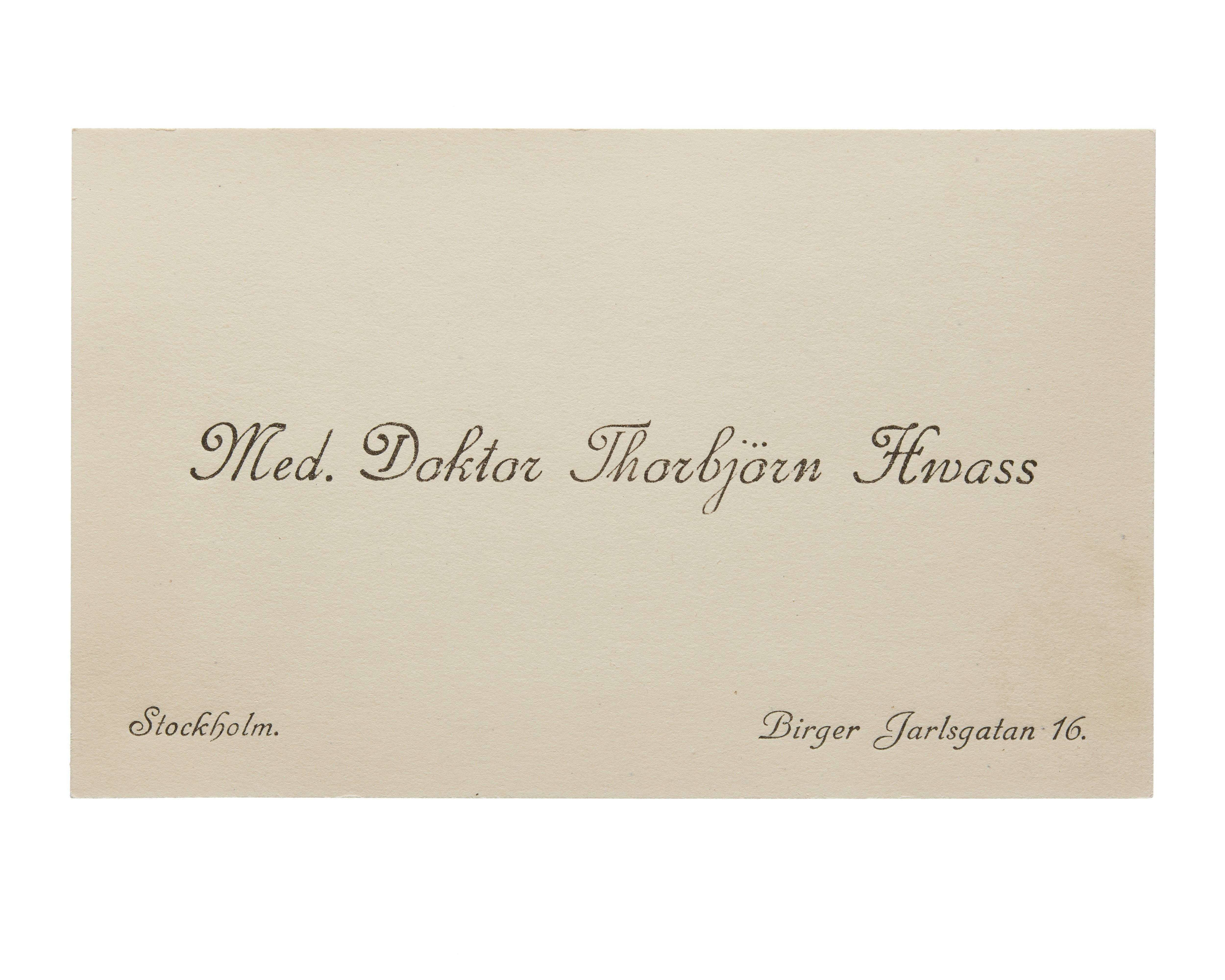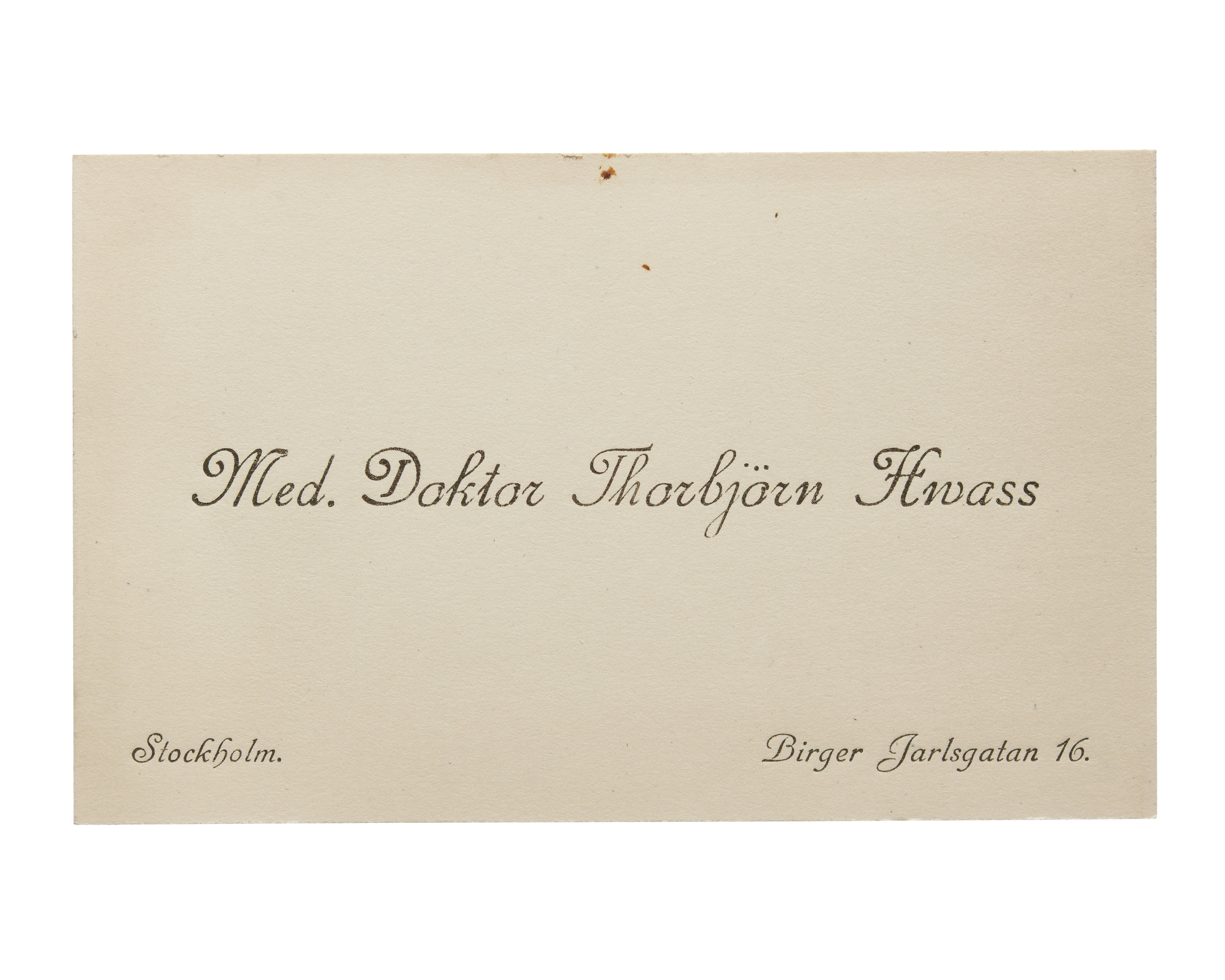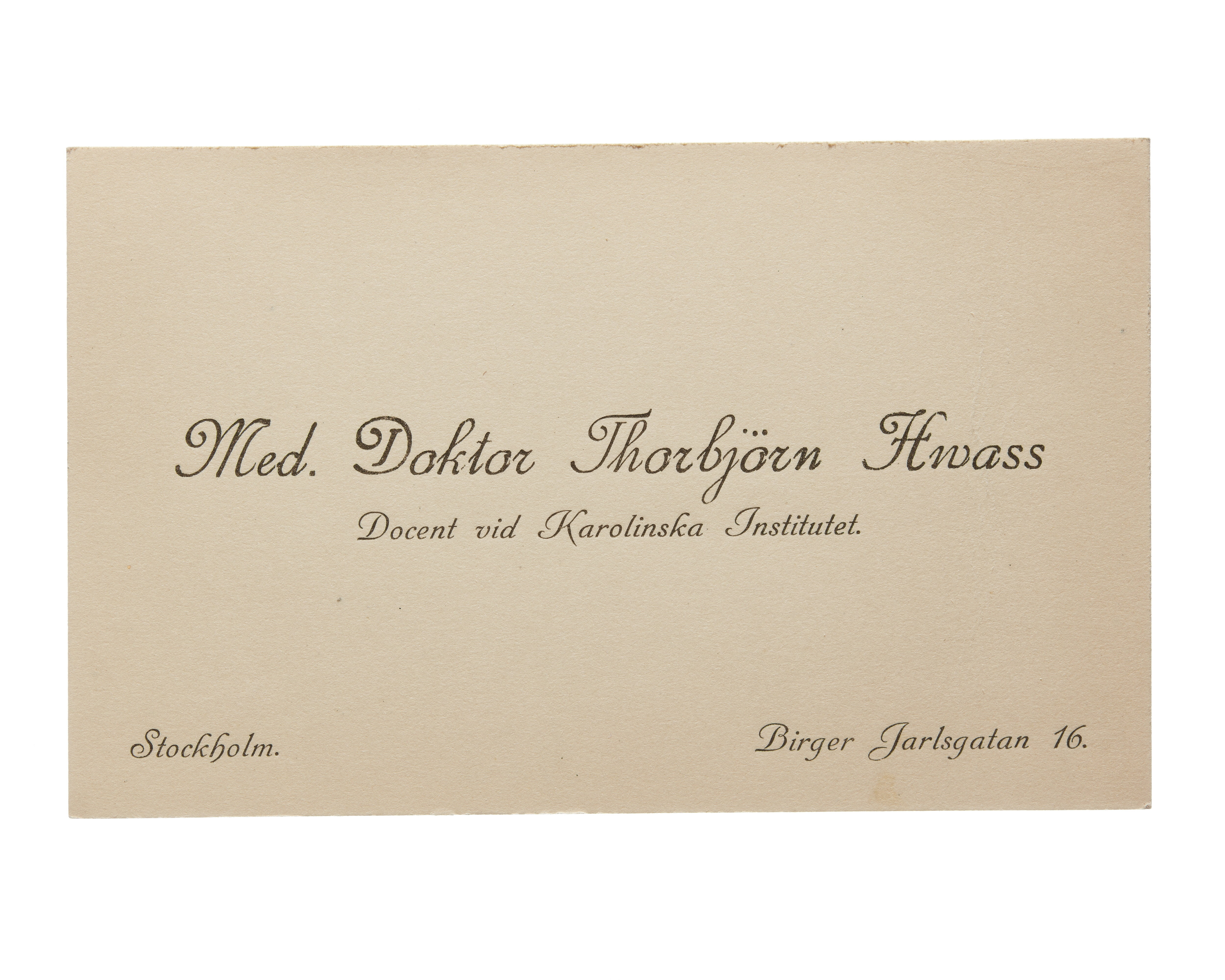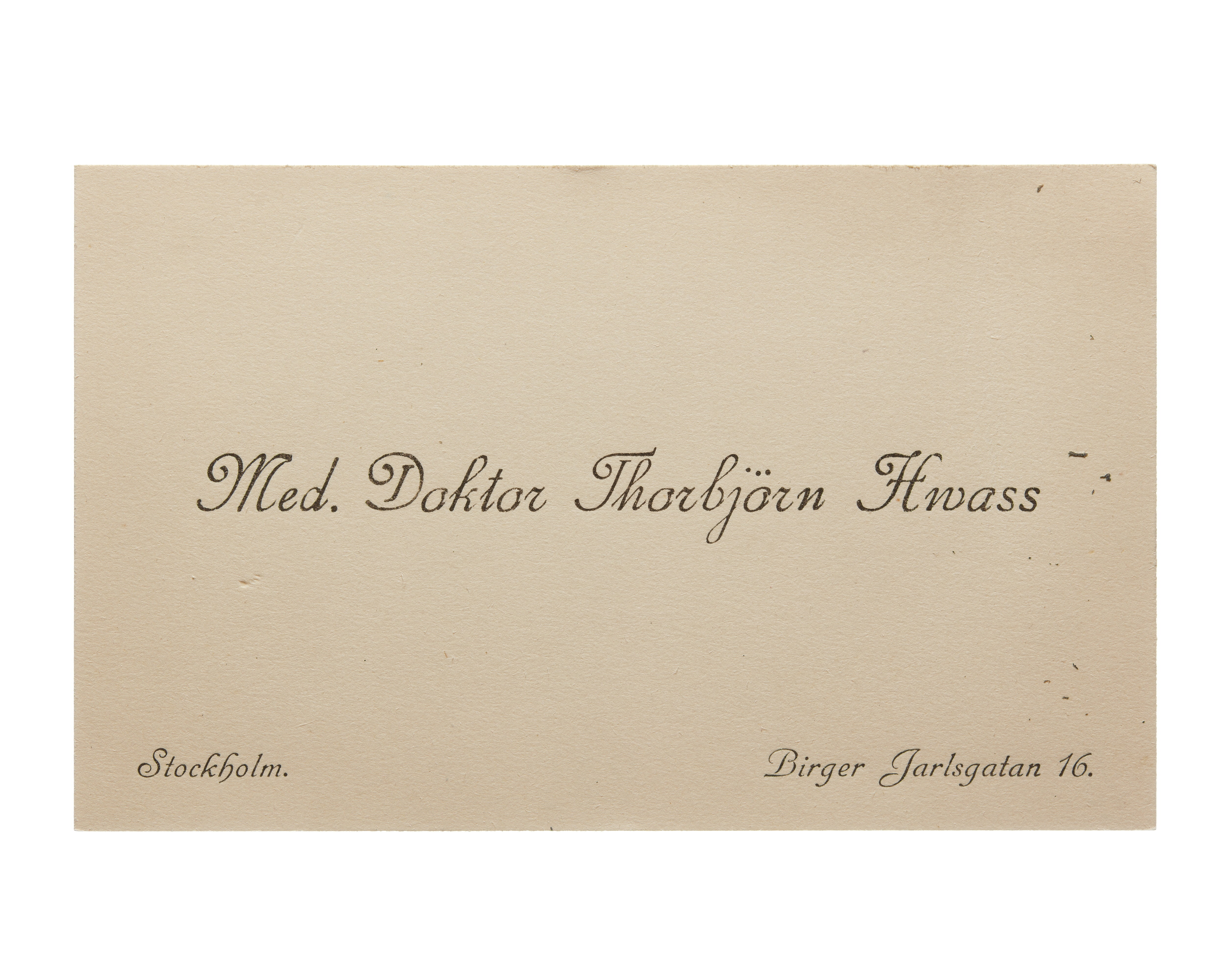 Visitkort från Med. Doktor Thorbjörn Hwass, Docent vid Karolinska Institutet.