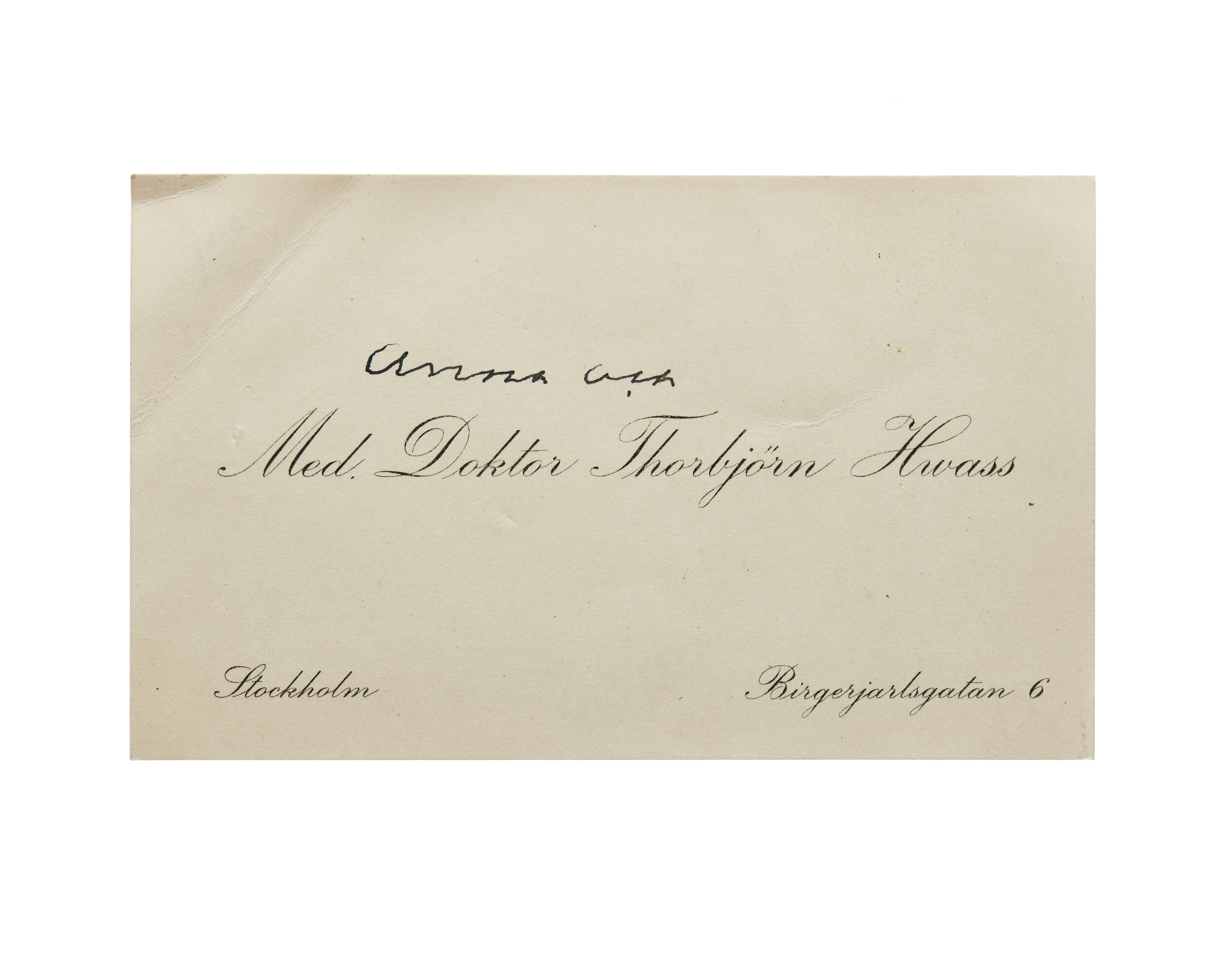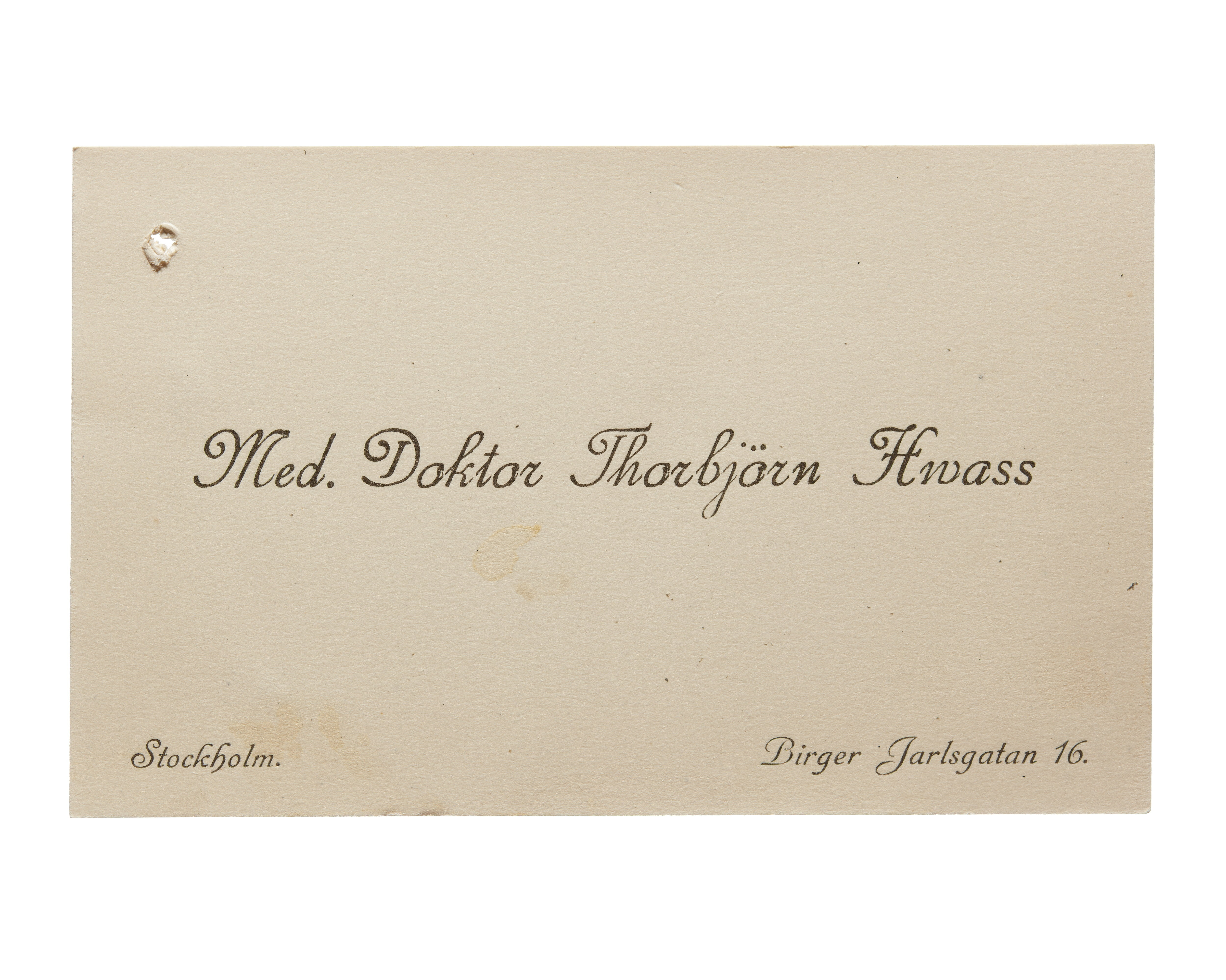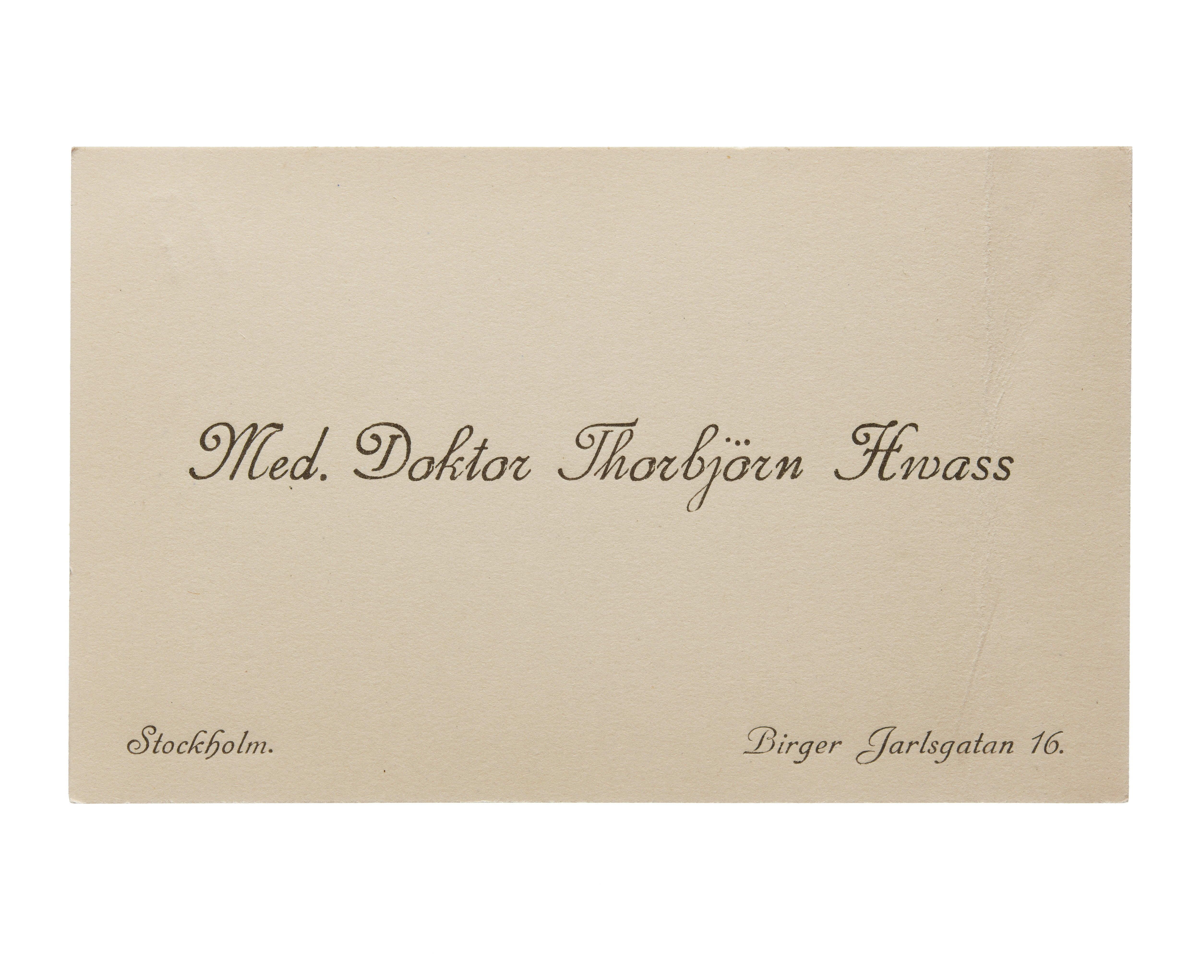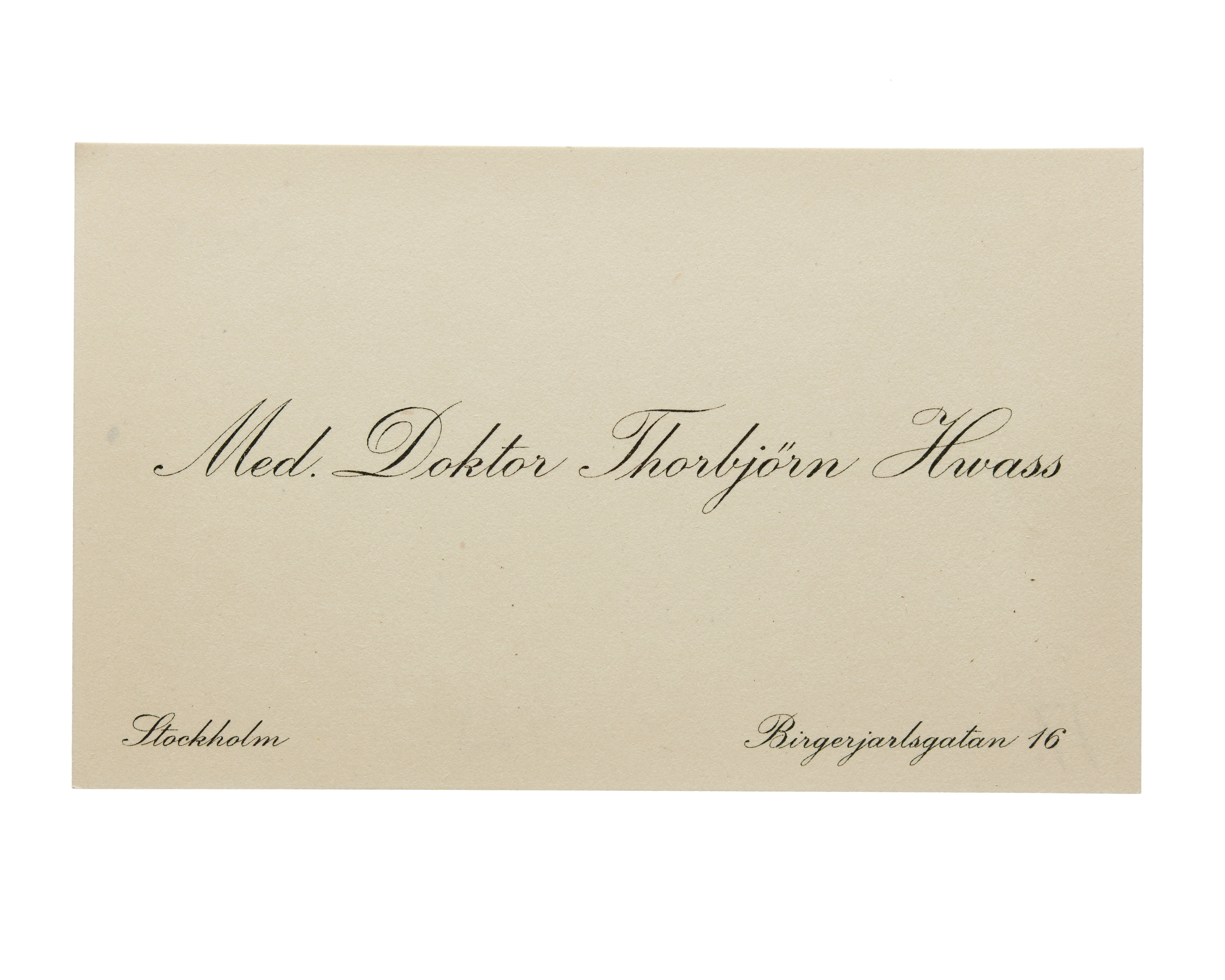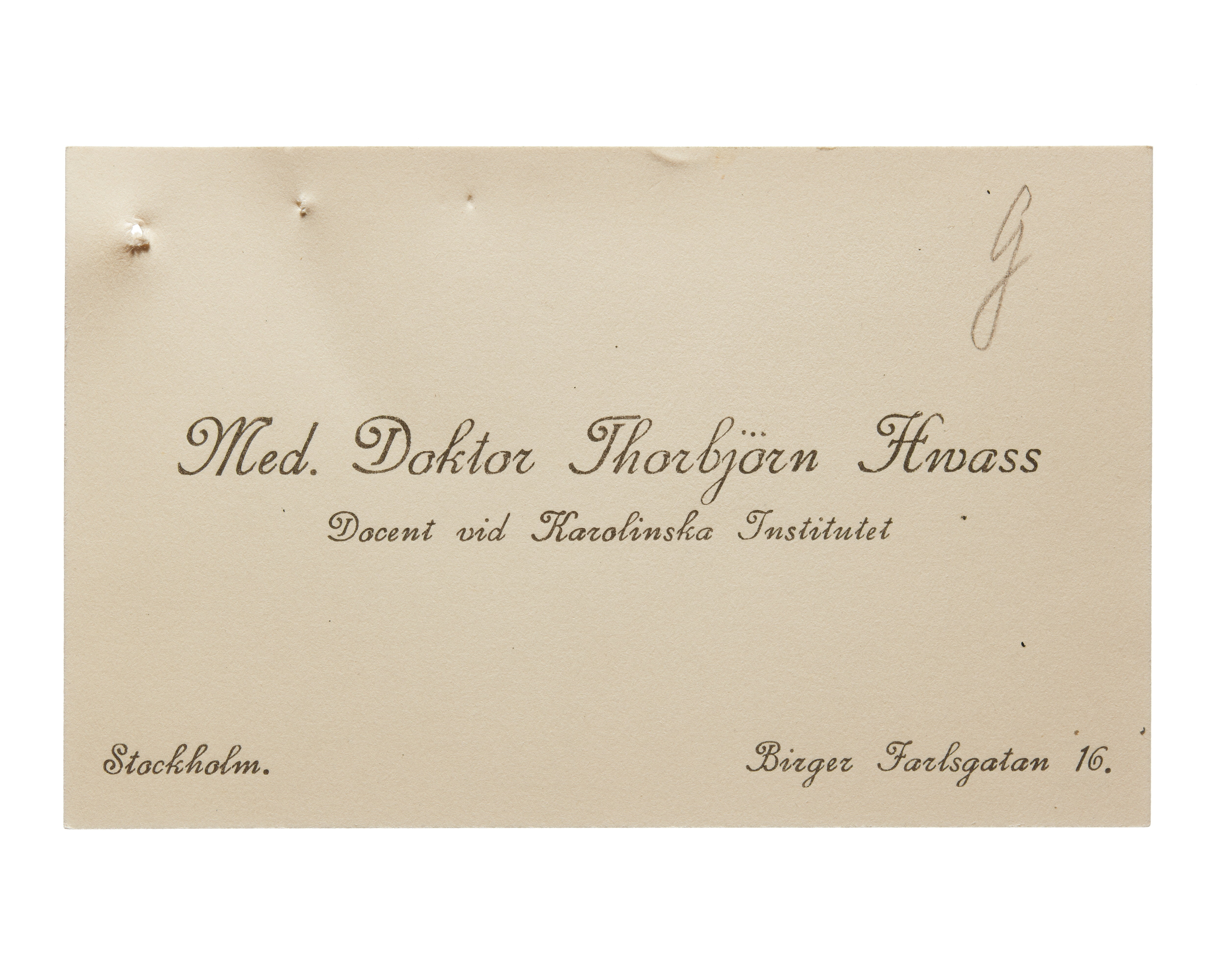 Visitkort från Med. Doktor Thorbjörn Hwass, Docent vid Karolinska Institutet.