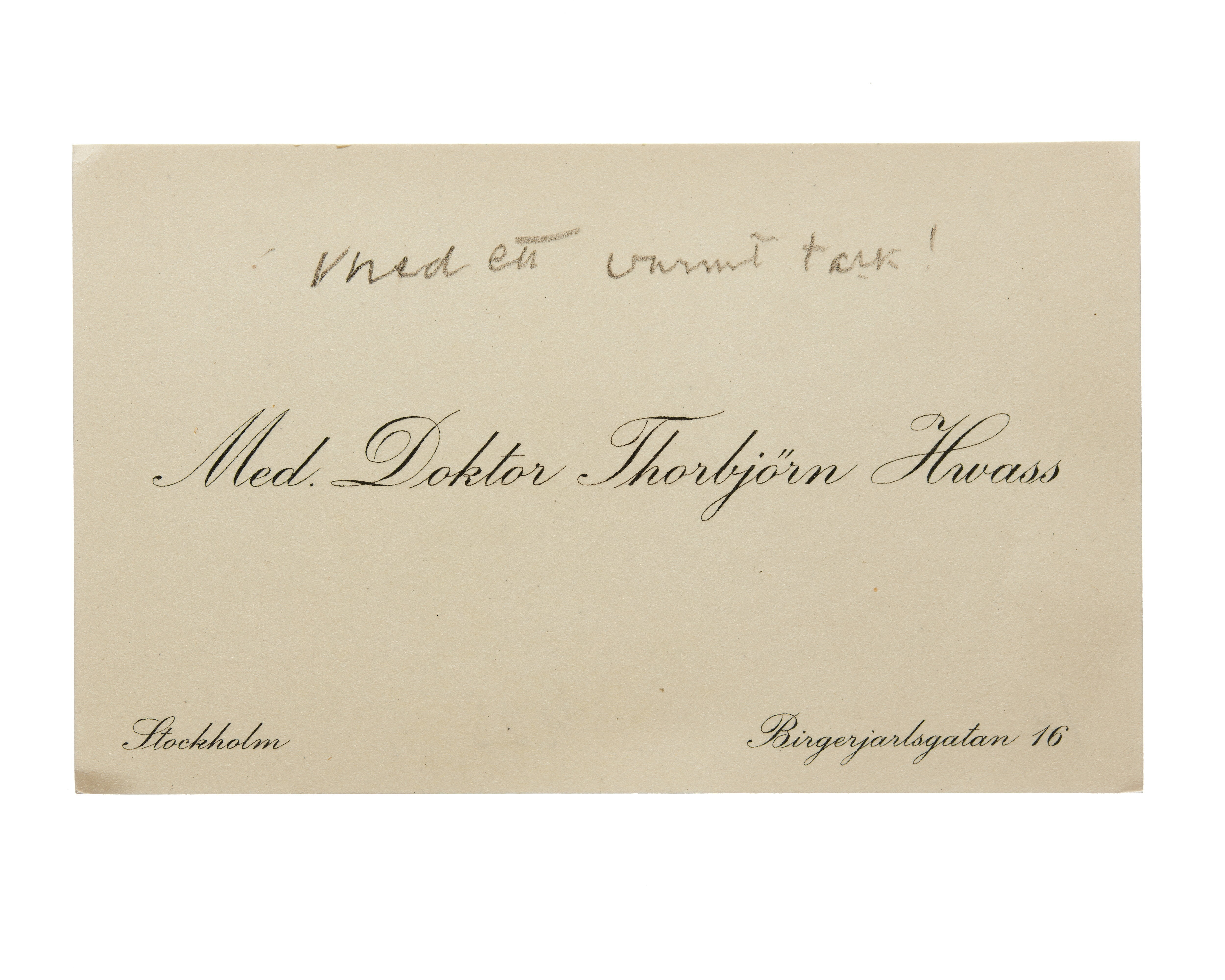 Tjugoen visitkort från Med. Doktor Thorbjörn Hwass, Docent vid Karolinska Institutet. Första kortet är utan datum, vikt i vänstra sidan. Adress (nedre vänstra hörnet) Birgerjarlsgatan 16, (nedre högra hörnet) Stockholm. Andra kortet är utan datum, vikt i vänstra sidan. Tredje kortet är utan datum, vikt i vänstra sidan. Fjärde kortet är utan datum, vikt i högra sidan. Femte kortet daterat 10.06.1915. Överlämnat i samband med guldbröllop, 1915. Sjätte kortet daterat 10.06.1915. Överlämnat i samband med guldbröllop, 1915. Sjunde kortet daterat 1915. Överlämnat i samband med Vilhelminas bilolycka i 1915. Åttonde kortet daterat 1916. Nionde kortet daterat 1916. Tionde kortet daterat 1917, vikt i högra sidan. Elfta kortet daterat 1917, vikt i högra sidan. Tolfte kortet daterat 1918, vikt i högra sidan. Trettonde kortet daterat 1918, vikt i högra sidan. Fjortonde kortet daterat 26.01.1919. Femtonde kortet daterat 1919, vikt i högra sidan. Sextonde kortet daterat 1919, vikt i högra sidan. Sjuttonde kortet daterat 1921, vikt i högra sidan. Artonde kortet daterat 1922, vikt i högra sidan. Handskrift "Med ett varmt tack!". Nionde kortet daterat 1922, vikt i högra sidan. Handskrift ".....". Tjugonde kortet daterat 1923, vikt i högra sidan. Tjugoförsta kortet daterat 1924, vikt i övre vänstra hörnet. Handskrift "Anna och".