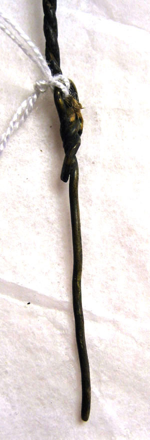 Rensnål av 1 mm tjock mässingstråd, upptill lindad till en ögla och fäst i kruttyget med en tvinnad vit-grön tråd av silkesgarn.