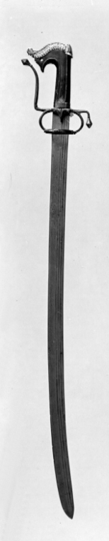 Bygelfäste med parerstänger av förgyllt stål med kantiga päronformiga ändar, böjda i rak vinkel, den bakre nedåt, den främre uppåt. Den senare förlängd som handbygel och något svängd. Två fingerbyglar vars ändar förenas av en parerring på utsidan. Krysset neddraget i en spets. Kaveln snidad av mörkt horn med ovalt tvärsnitt, upptill framåtböjt och konturerat, med genomgående hål. På ovansidan genombrutet beslag av silver med graverad dekor på vilket löper en rund ten av stål fäst i tången. Kaveln nedtill beslagen med niellerat och punsat silver. Klinga av stål, 32,5 mm bred, svagt böjt, eneggad till det 204 mm långa tvåeggade spetspartiet med tre hålkälar, två längre, en kortare längs ryggen. Klingan ornerad på starka delen på båda sidor med etsade orientaliska ornament och inskriptioner. På insidan stämpel med två motställda taggiga C-n omgivna av prickar.