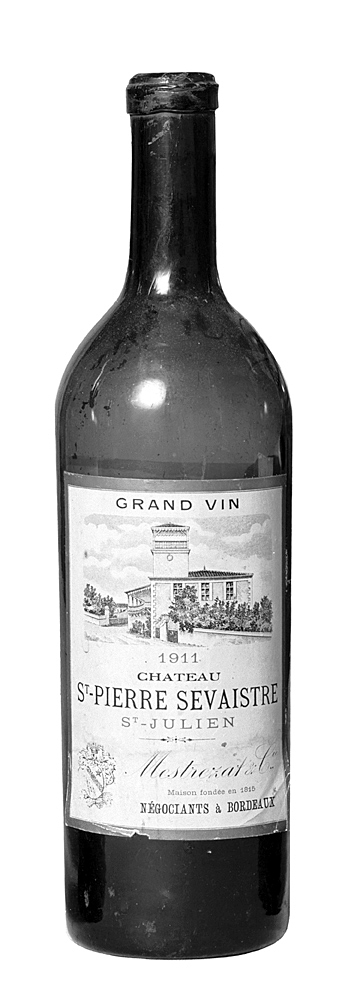 CHATEAU S:t PIERRE SEVAISTRE, S;t Julien, Grand Vin 1911, sex helbuteljer Av mörkgrönt glas. Cylindriska, med kupigt indragen skuldra och smal cylindrisk hals med stärkring; bottnen konisk, högt uppskjutande. Etikett vit, på denna slottet jämte text och ett vapen i svart, dessutom årtal och text i guld; kring kanterna en bård i guld. Höjd: 30 cm.; diameter: 8,3 cm.