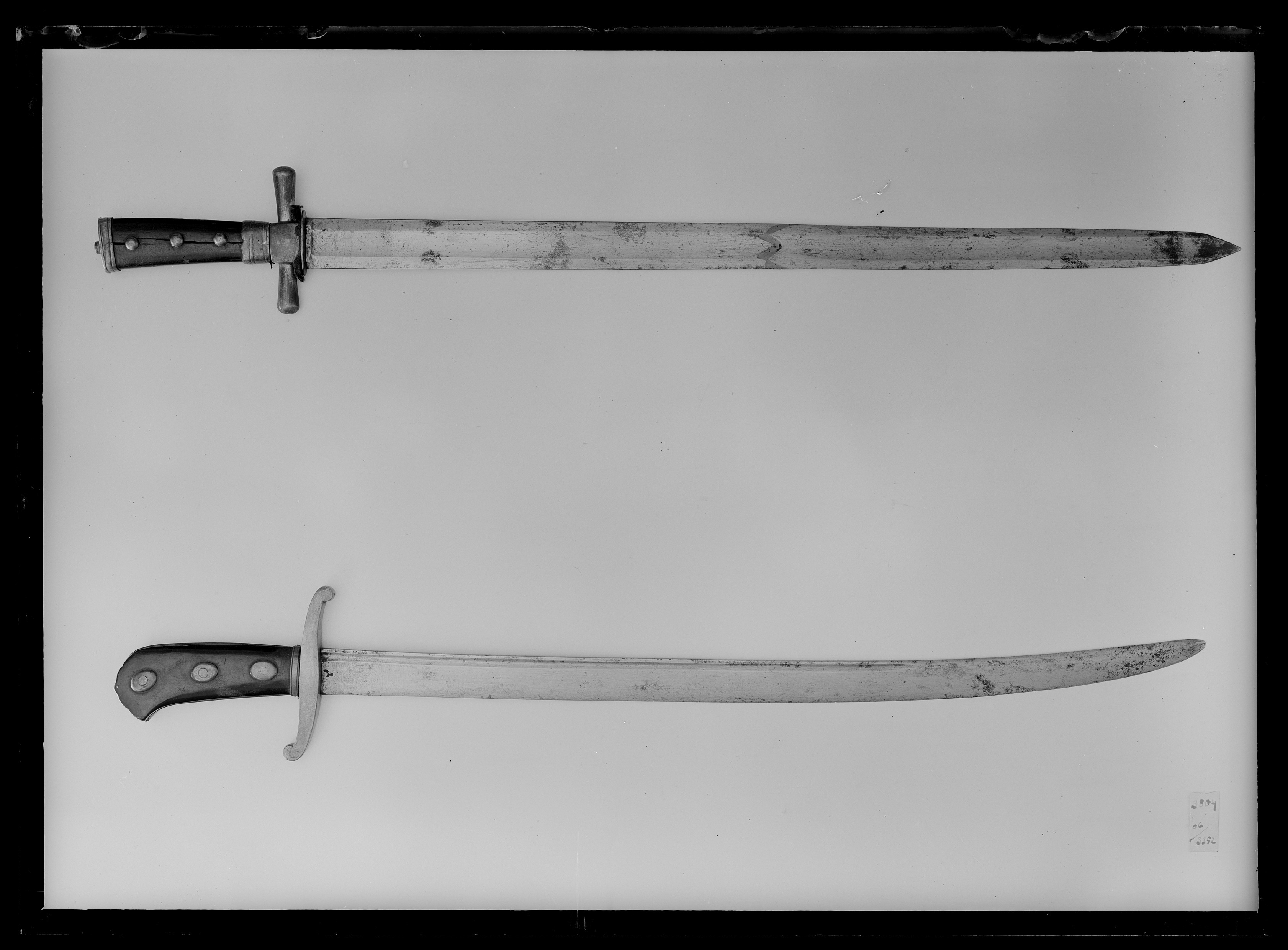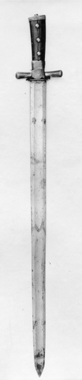 Fäste med beslag av mässing. Knapp låg med ovalt tvärsnitt, nitknapp rund och låg. Raka parerstänger med ovalt tvärsnitt. Kavel av trä med ringbeslag nedtill. Kaveln med tre nitar av mässing med runda huvuden. Tvåeggad klinga med jämnbreda mötande skär åtskilda av en bred grund hålkäl. Spetsen vinkelformigt tillslipad.