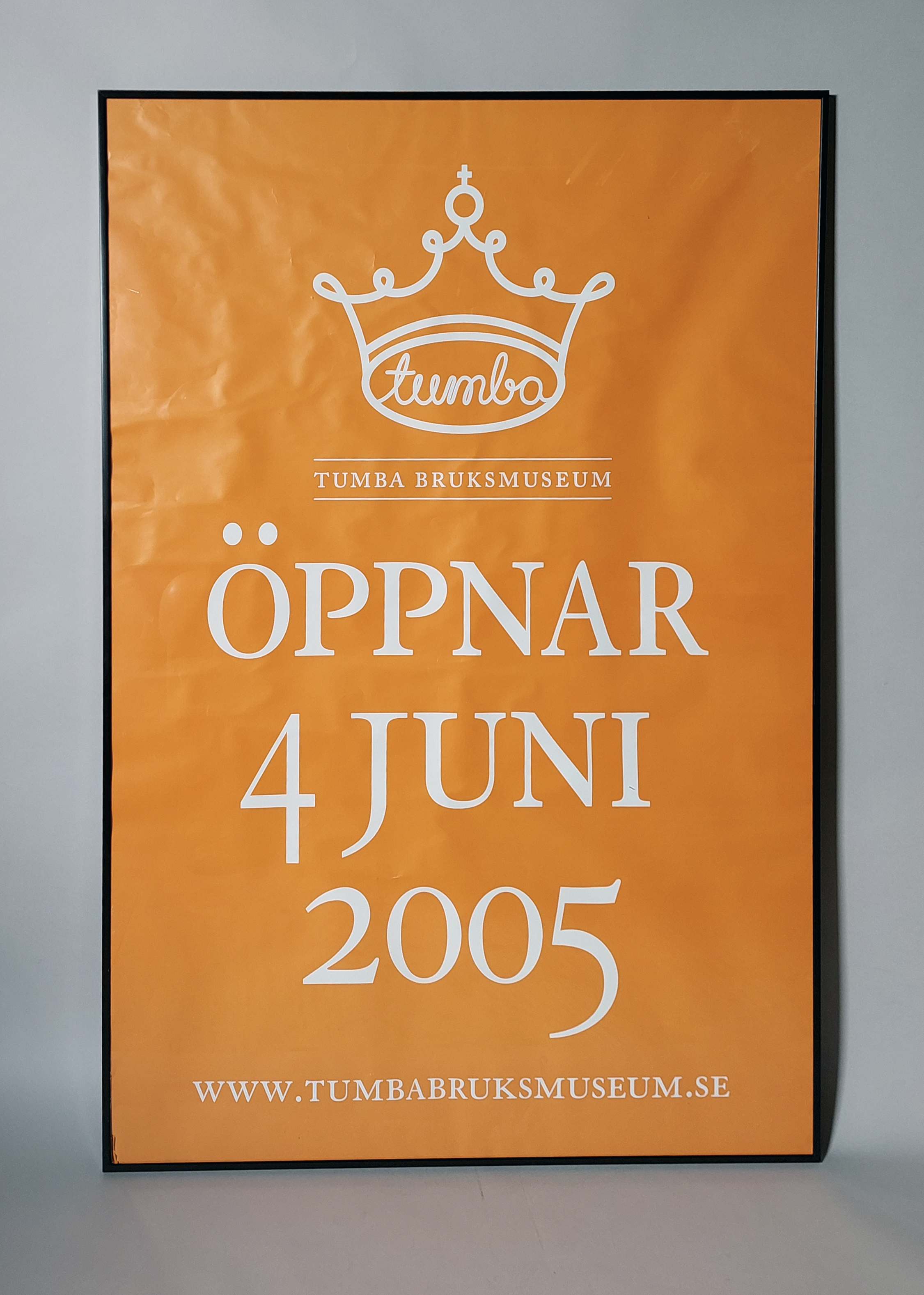Reklamaffisch framtagen inför invigningen av det nya Tumba bruksmuseum år 2005. Affischen fanns i ett flertal tämligen klara färger, bland annat denna variant i orange med vit text. Motivet är endast Tumba bruksmuseums logotyp samt texten "Öppnar 4 juni 2005" samt "www.tumbabruksmuseum.se" i nederkant.