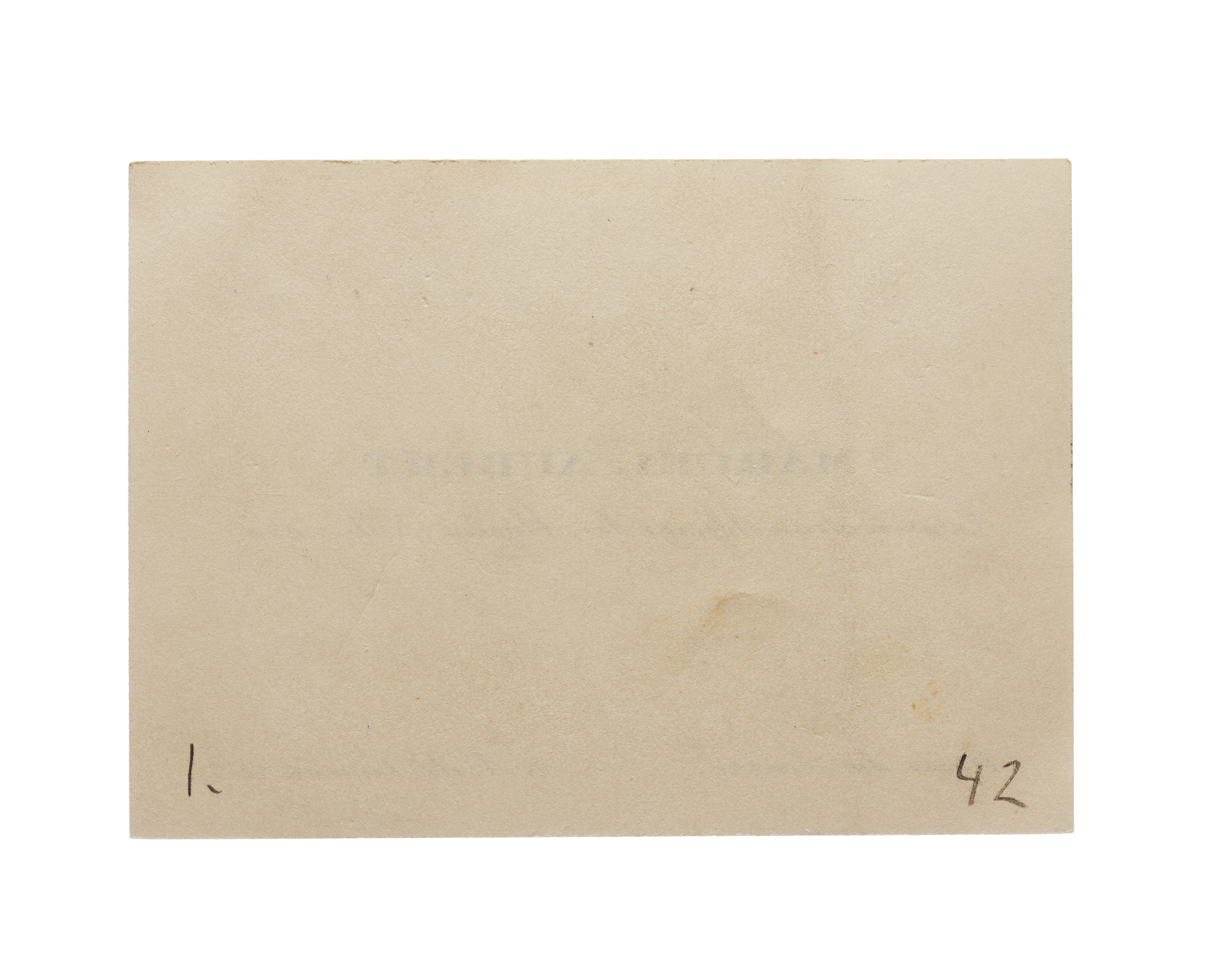 Ett visitkort från Marcel Aubert. Utan datum. Nedanför namnet står på franska "Conservateur-Adjoint des Museet Nationaux". På nedre vänstra hörnet står " Musee du Louvre", adress (nedre högra hörnet) 8. Cite Vaneau VII:e