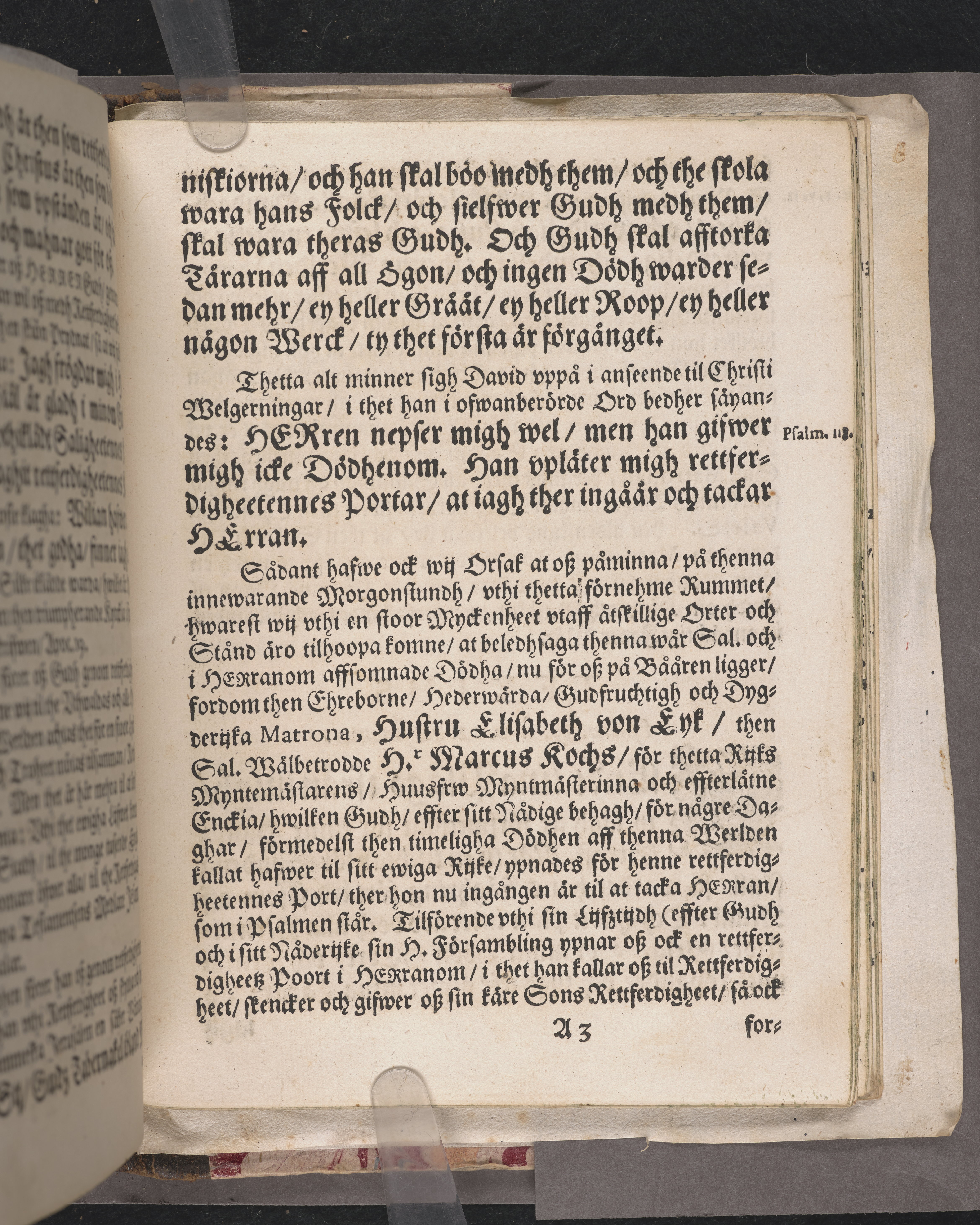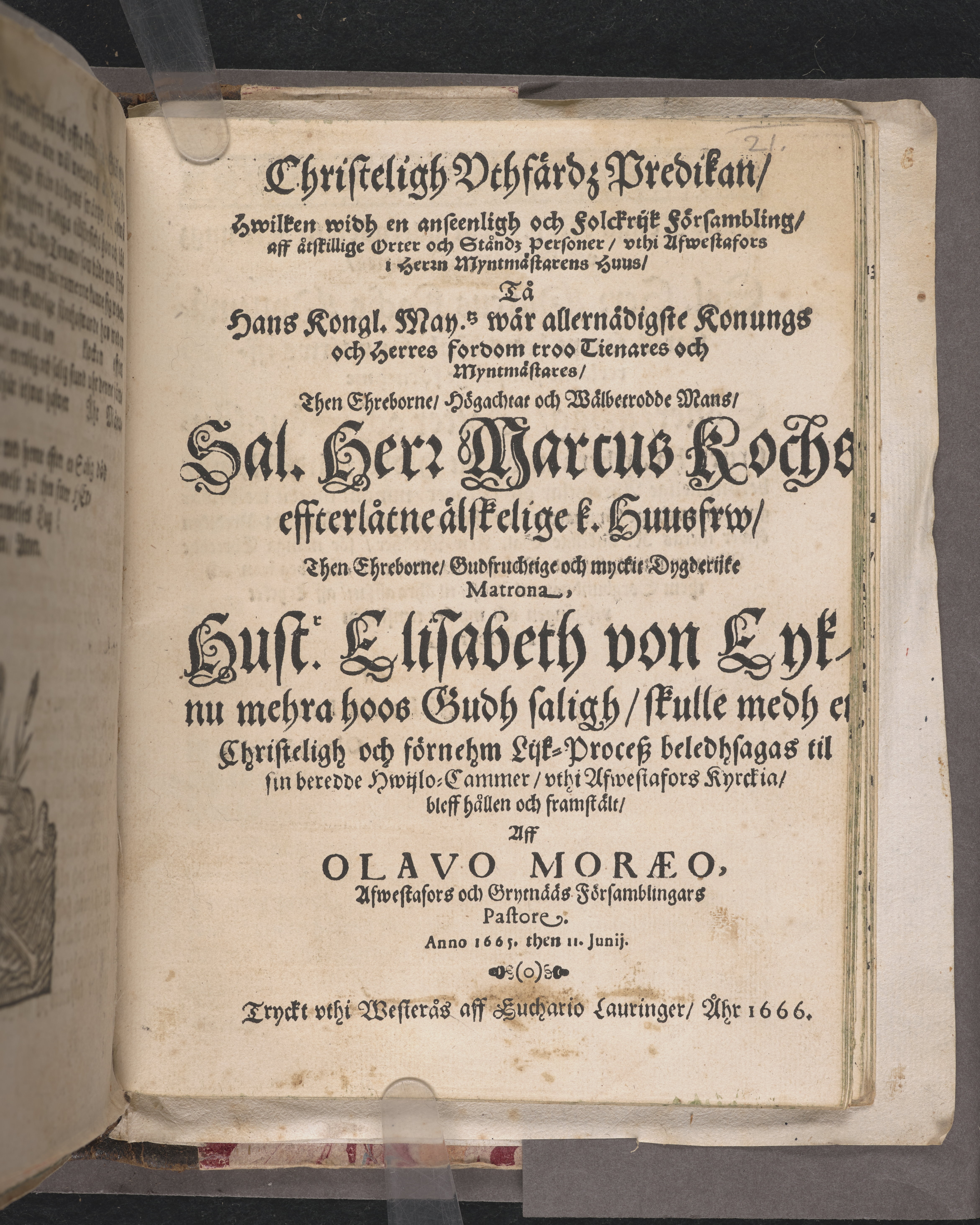 Christeligh vthfärdz predikan ... tå ... sal. Herr Marcus Kocks effterlåtne ... huusfrw ... Elisabeth von Eyk ... beledhsagas til sin ... hwijlo-cammer, vthi Afwestafors kyrckia ... framstält aff Olavo Moræo ... anno 1665. then 11 junij. Tryckt vthi Westerås aff Euchario Lauringer, åhr 1666.