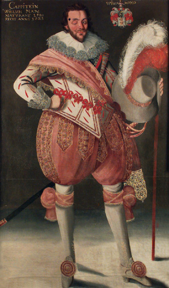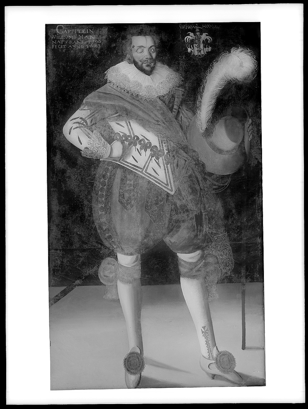 Helfigur , stående , fas höger. Höger hand i sidan, vänster hand håller plymagerad hatt. Vit tröja med skört och röda rosetter, röda pluderhosen med guldgaloner , röd axelbindel , värja. Enögd. Inskrift överst t.v : " CAPPITEIN WILLVM MAN NATVS ANo 1590 FECIT ANNO 1623 ". I övre högra hörnet vapensköld med stående , naken man.