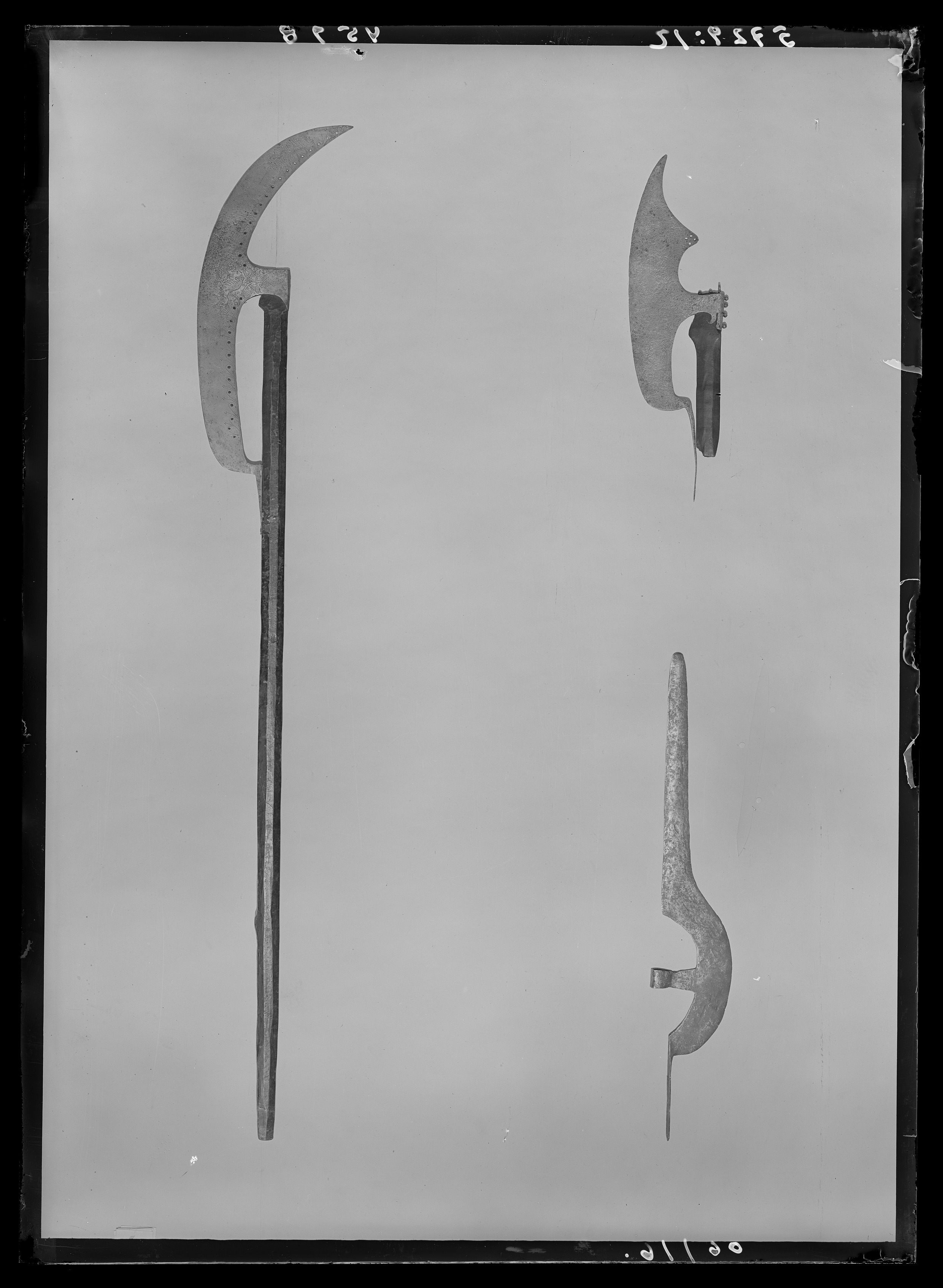 Blad av stål, brett med konvex, svagt böjd egg, nedtill utdragen i skena att fästa vid skaftet.Baksidan upptill utskjutande i flik med fyra små, runda hål. Holk l: 63 mm, vid nacken med fyra kulformiga nitar i vertikal rad. Holkens sidor konturerare medvolutformigt utskott. På holkens ovansida är beslag av stål med två kulformiga nitar, som fästerskaftet och en rund bygel. Skaft av mörkt trä, sexkantigt platt, något vidgat upptill, 275 mm kvar. Märkt 22976.