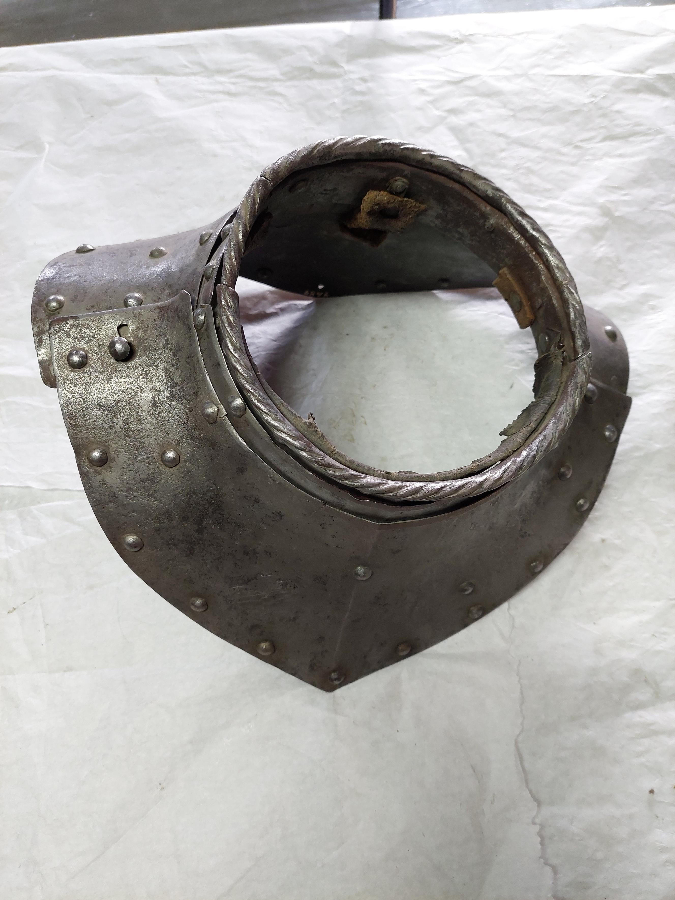KOMPLETTERANDE BESKRIVNNG Numera av blankt stål. Halskrage av sex delar av smitt stål med återanvända delar. Halsringen samt bakre lamellen av äldre 1500-talstyper.