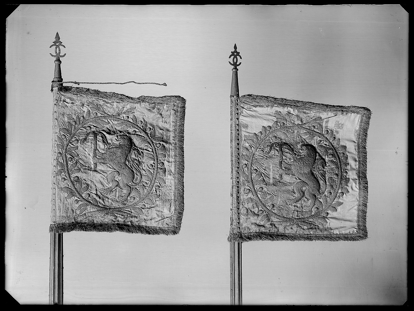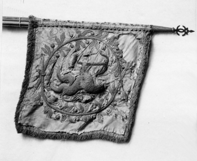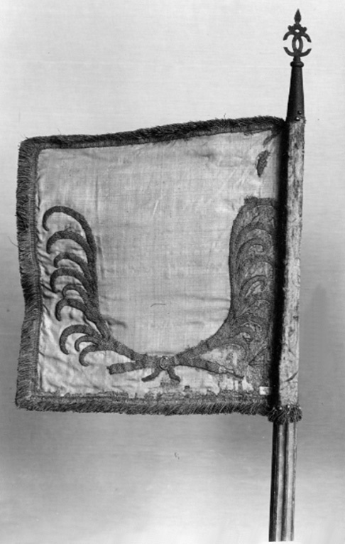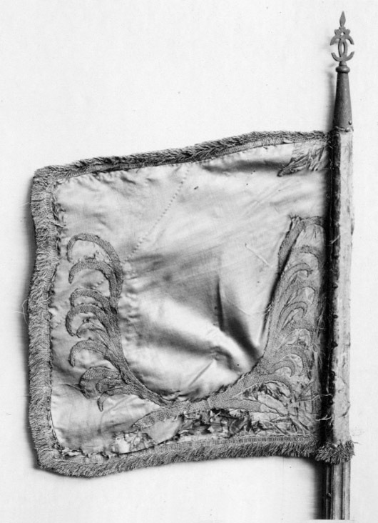 Duk av dubbel gul sidendamast, mycket fragmentarisk. Dekor: Broderad i reliefbroderi, läggsöm, huvudsakligen på dukens insida - Smålands lejon förande ett spänt armborst i en helt omslutande lagerkrans nedtill och upptill hopbunden, allt i guld (metalltråd), total höjd 440 mm (lejonet 255 mm); på utsidan två palmkvistar hopbundna nedtill (har förmodligen inneslutit ett dubbelt C); i inre, övre hörnet rester av en 6:a(?), i inre, nedre hörnet en 4:a. Frans: dubbel, av gult silke och metalltråd. Duken fäst vid stången med tre rader tättsittande tennlickor på gula band. Stång av trä, kannelerad, gulbrunmålad och avsågad nedtill; saknar ring och löparten; holk och spets av järn (defekt!).