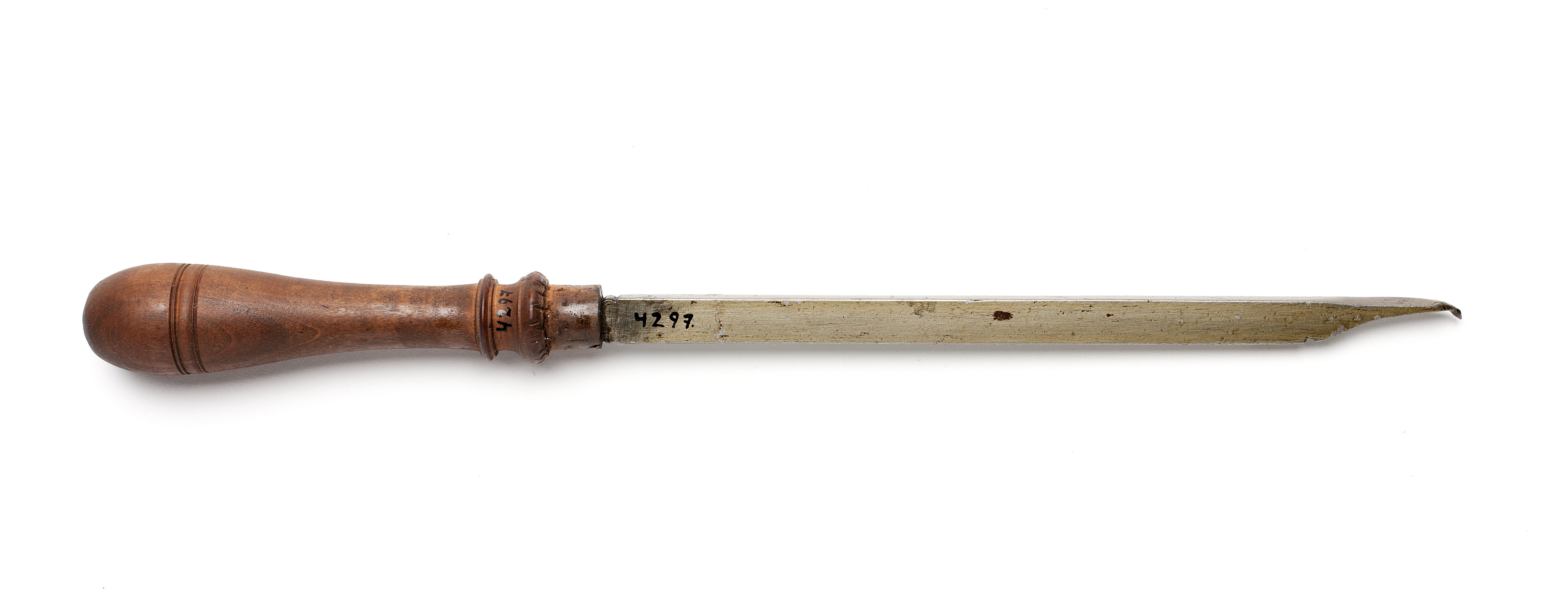 Klinga med rektangulär genomskärning. Stämplat på klingan: hjärta under kors. Profilerad hals och ände. Kort, spetsig egg i vinkel mot stålet. Svarvat skaft av päronträ med två vulster nedtill ("rydboholmstyp"). Stålet troligen avbrutet. Eggen omslipad. Skaftets mässingsring borta.
