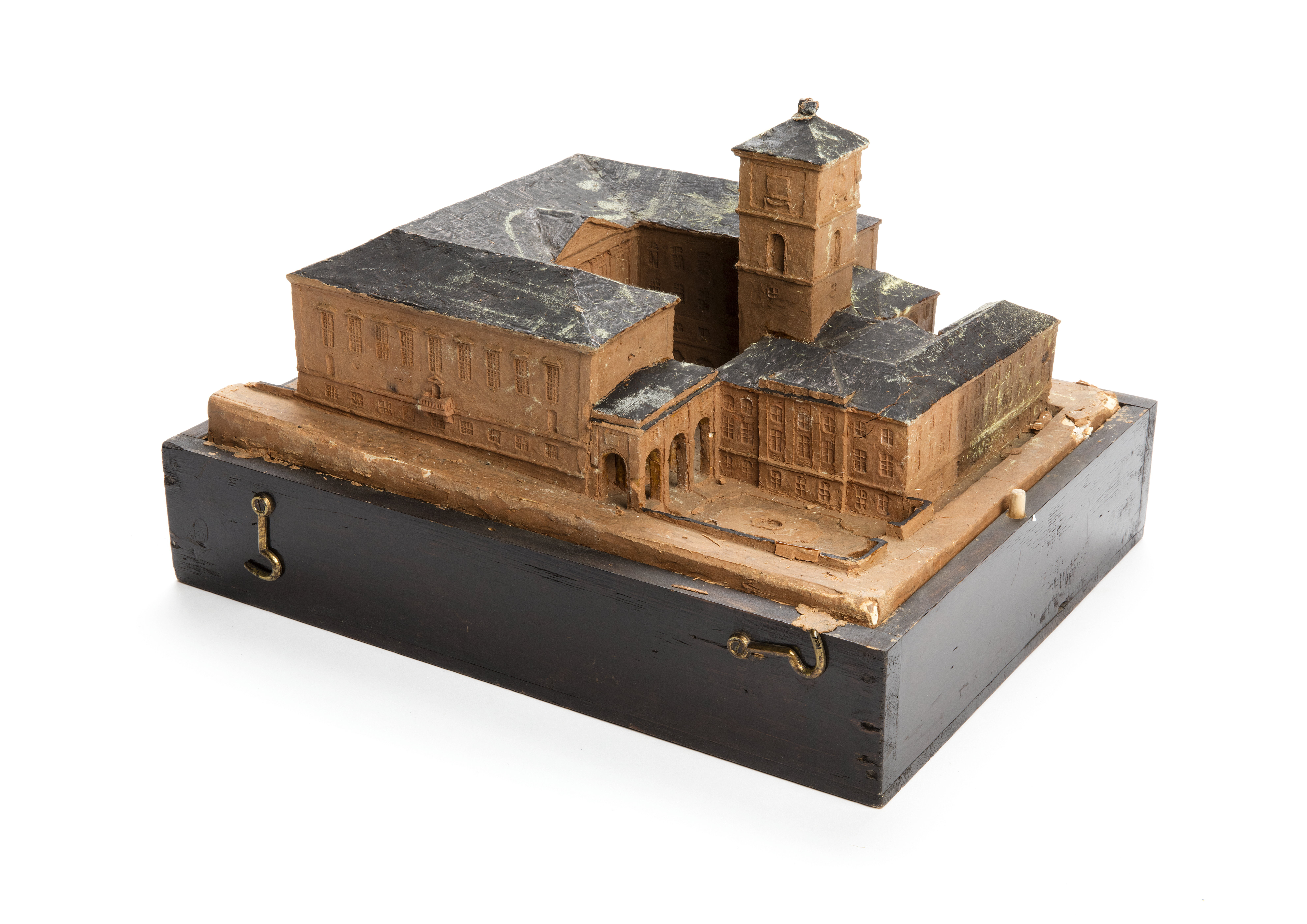 Förslag till om- och tillbyggnad av Fredrikshof, Stockholm för Kungl. Livrustkammaren, samhörande med låda nr 7031, cirka 1917. Modellen är fäst på en platta av trä med tre stöd under. På en kärna av gips är byggnaden utförd i brun modellera. Fönster och fasaddetaljer fint utarbetade. Tak och murkrön svartmålade. Tornet krönt med svart spira.