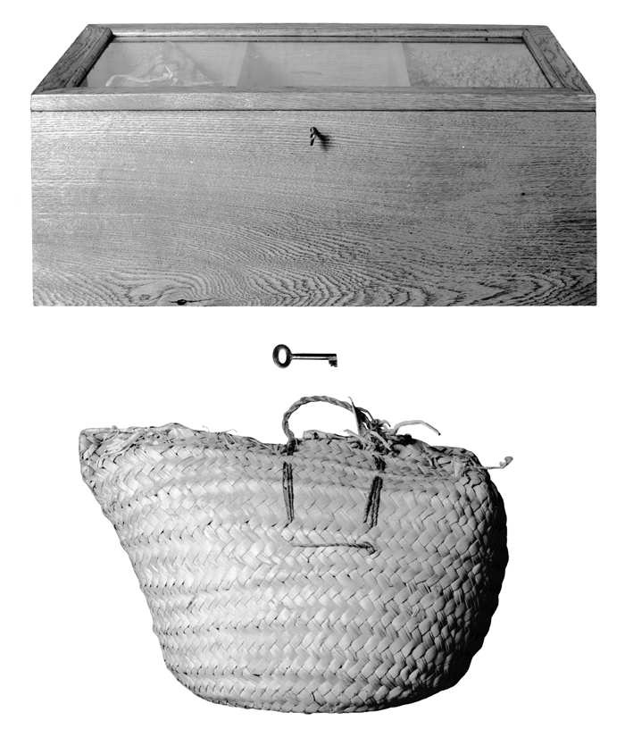 KAFFELÅDA med nyckel jämte kaffebönor Av ek, bonad. Rektangulär, med fällock. Lådan hopsinkad i hörnen med från långsidorna täckta tappar; i lådan tre tvärgående fack för de olika kaffesorterna. Locket utgörs av en smal glasram med glaset fäst i ramen medelst en på översidan liggande kvartstavig stiftlist. På framsidan ett instucket haklås. Höjd: 24 cm.; längd: 63 cm.; bredd: 39,3 cm. Nyckel (original): Av järn, med liggande oval, platt ögla; på pipan upptill flera tvärgående ringar. Längd: 4,7 cm.; bredd: 1,7 cm. Kaffesorter (bönorna orostade): 1 (i vänstra facket) moccakaffe, omrkring 4 kg, i orörd originalförpackning; 2 (i mellersta facket) moccakaffe, omkring 3 kg, i lös vikt; 3 (i högra facket) javakaffe, 5 kg 3 hg. Kafferostning försiggick i huset Hamngatan 4 i långpannor (se I:F.l.05.)