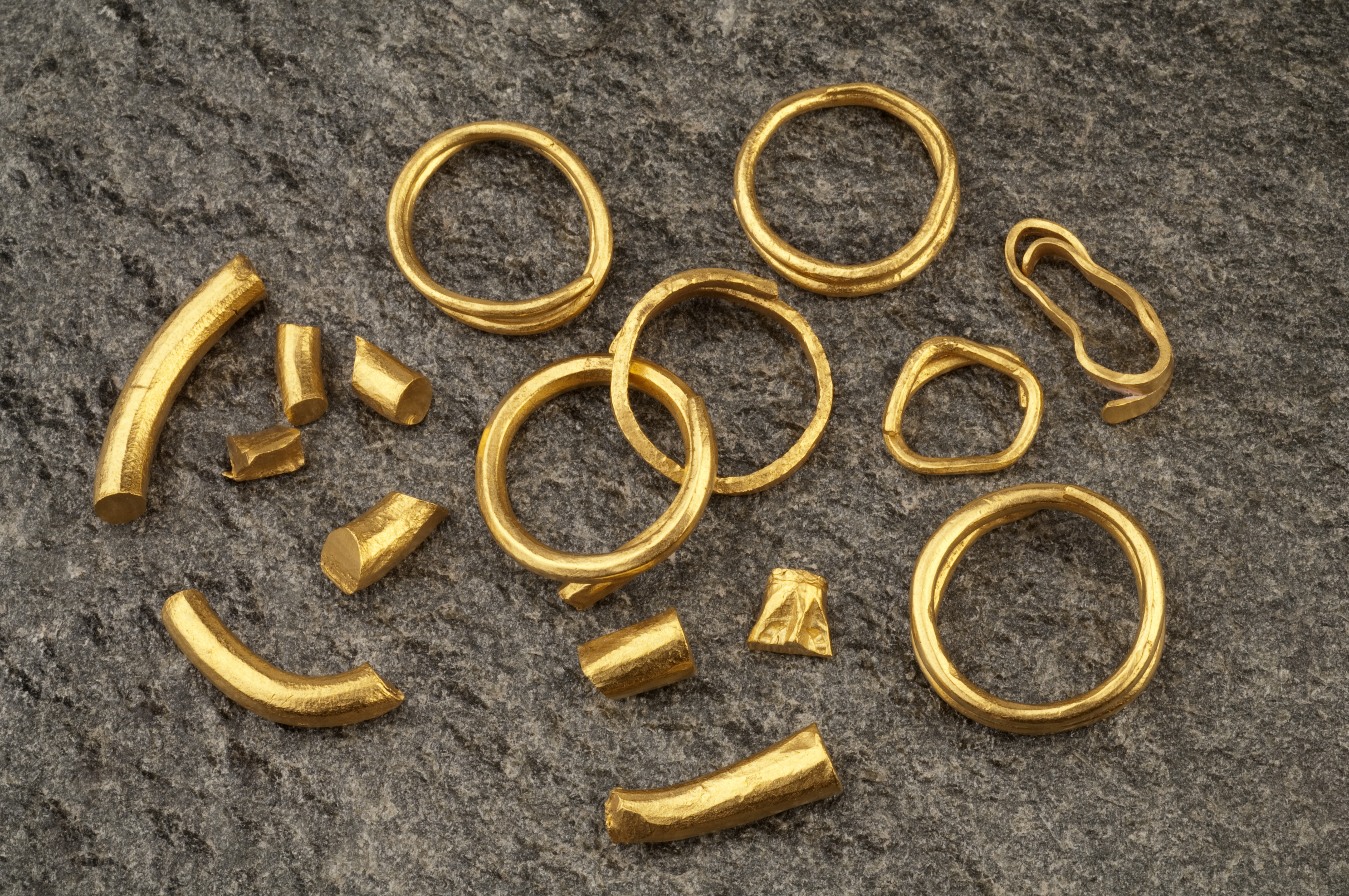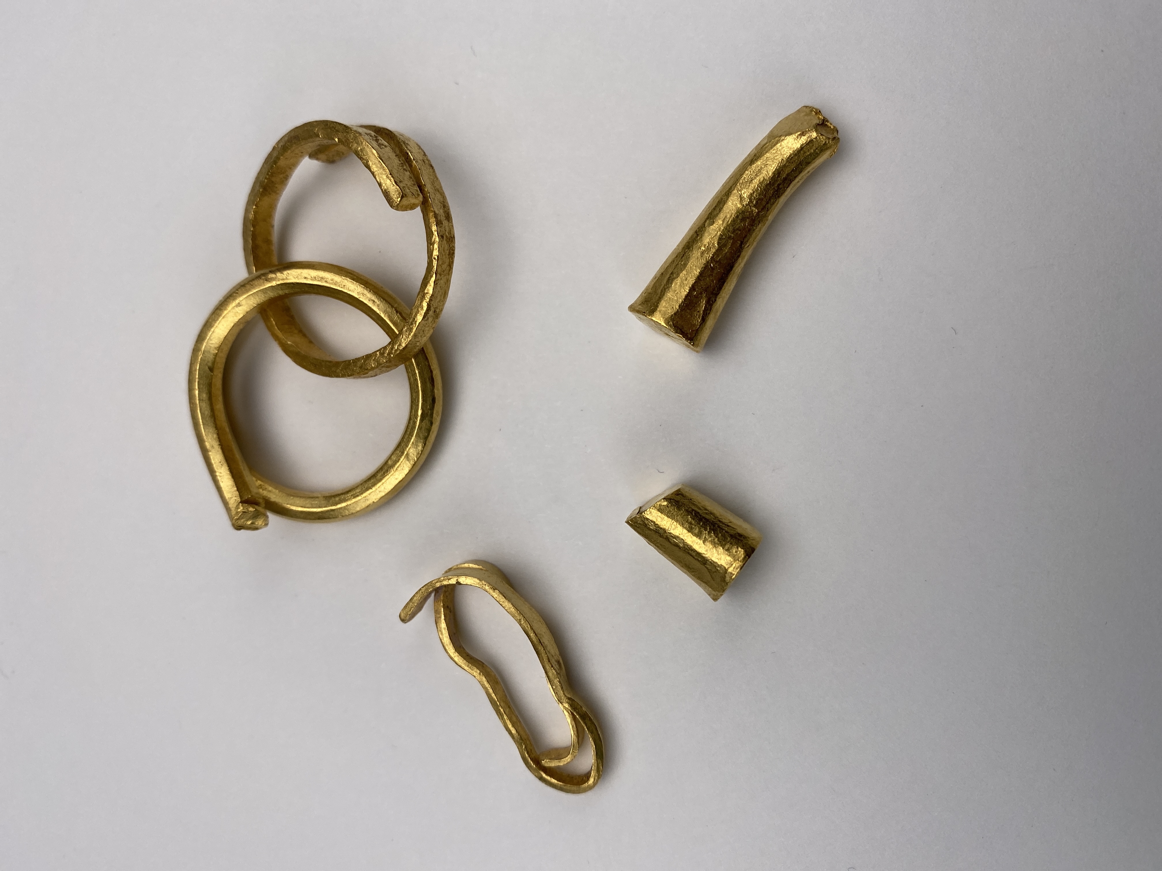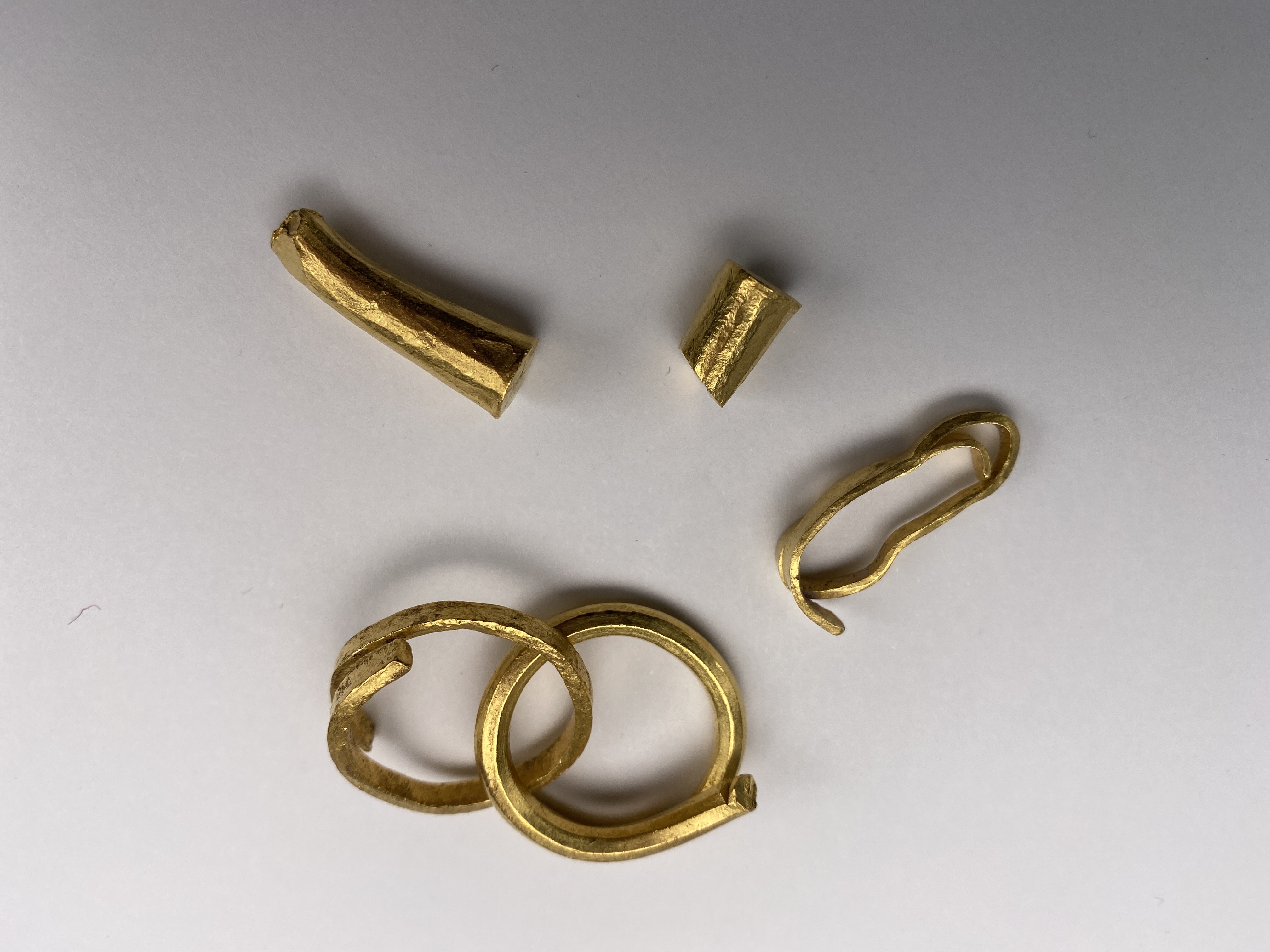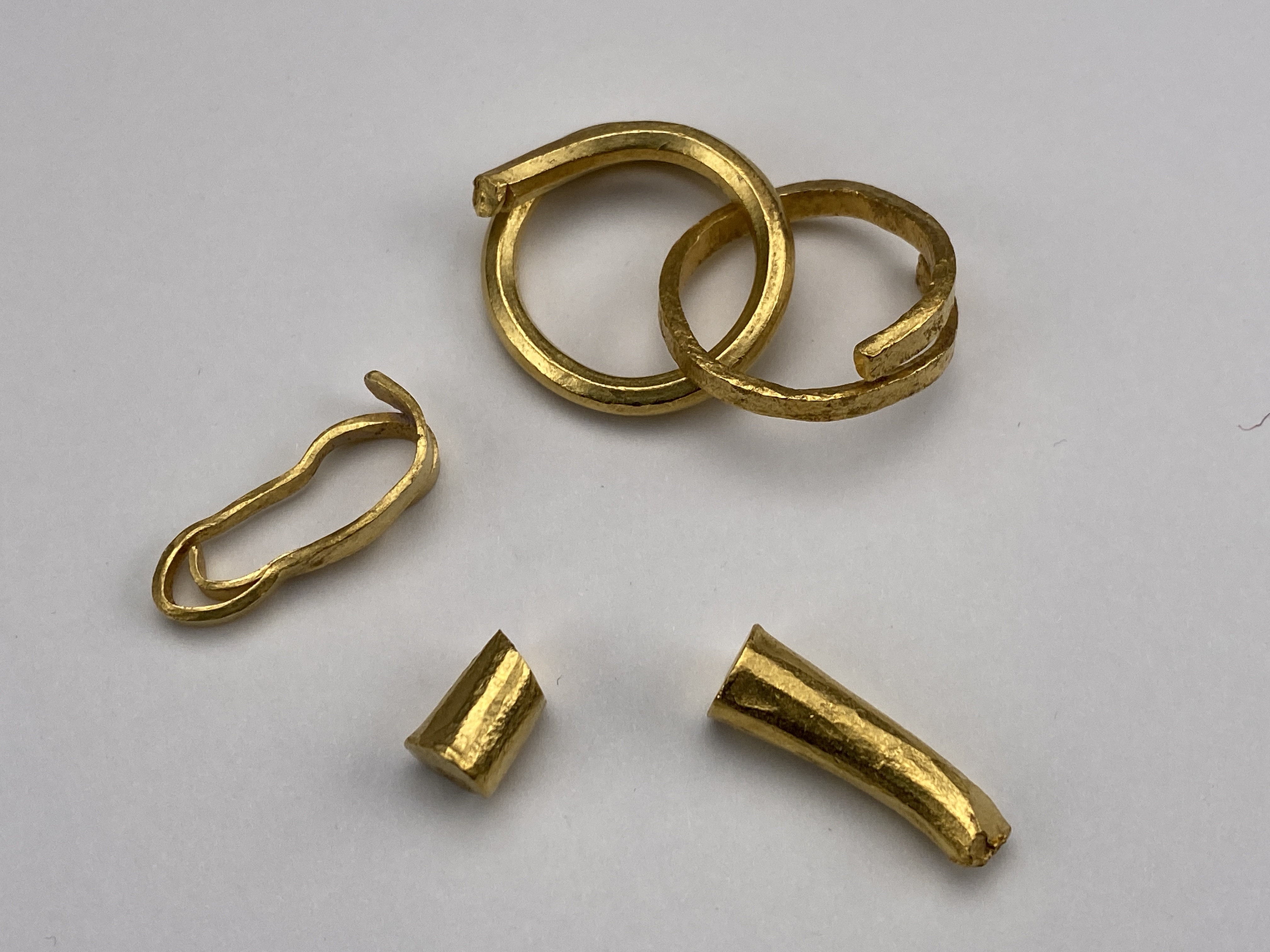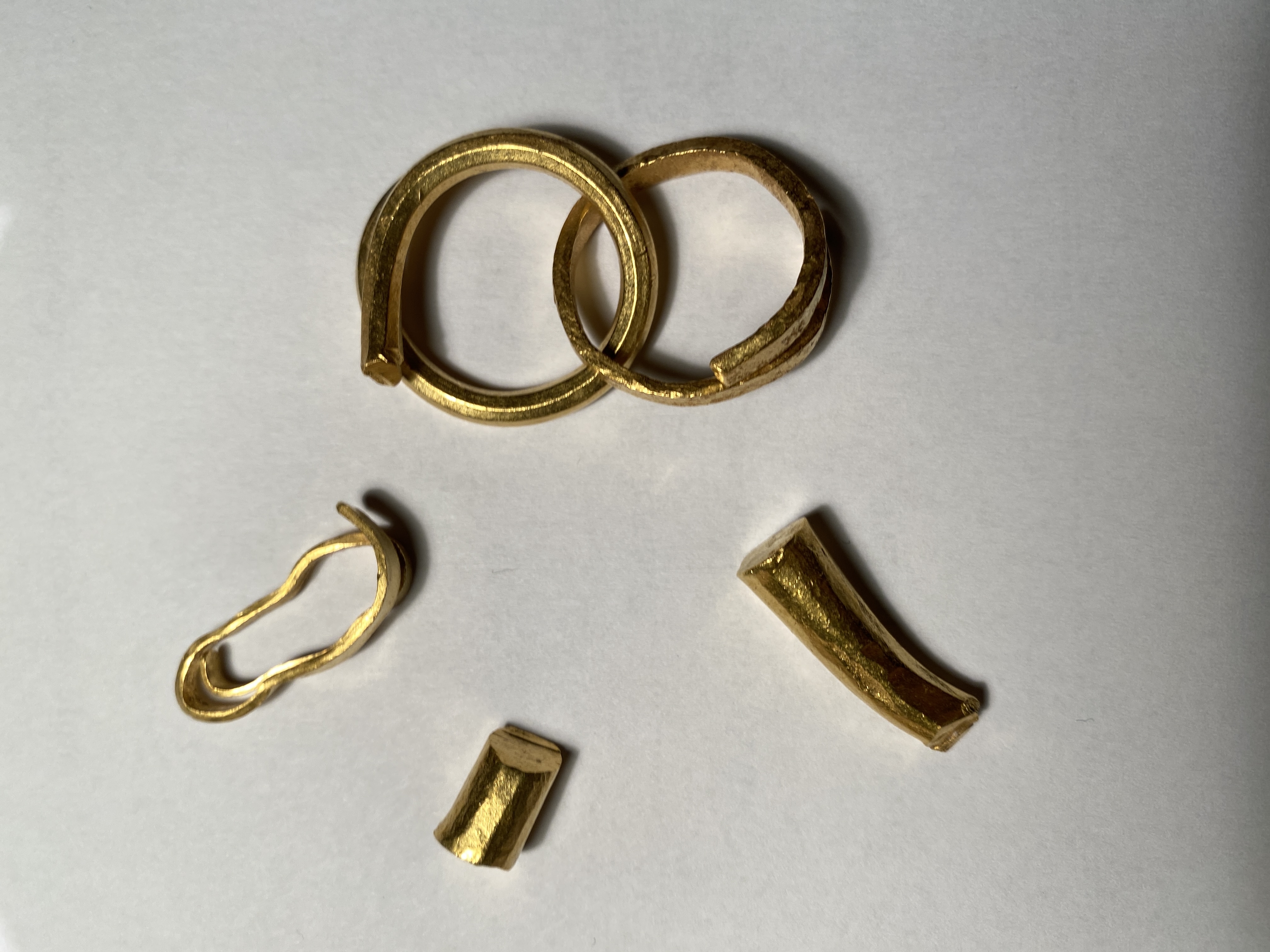 3 spiralringar varav 2 sammanlänkade, samt 2 fragment av tenar.