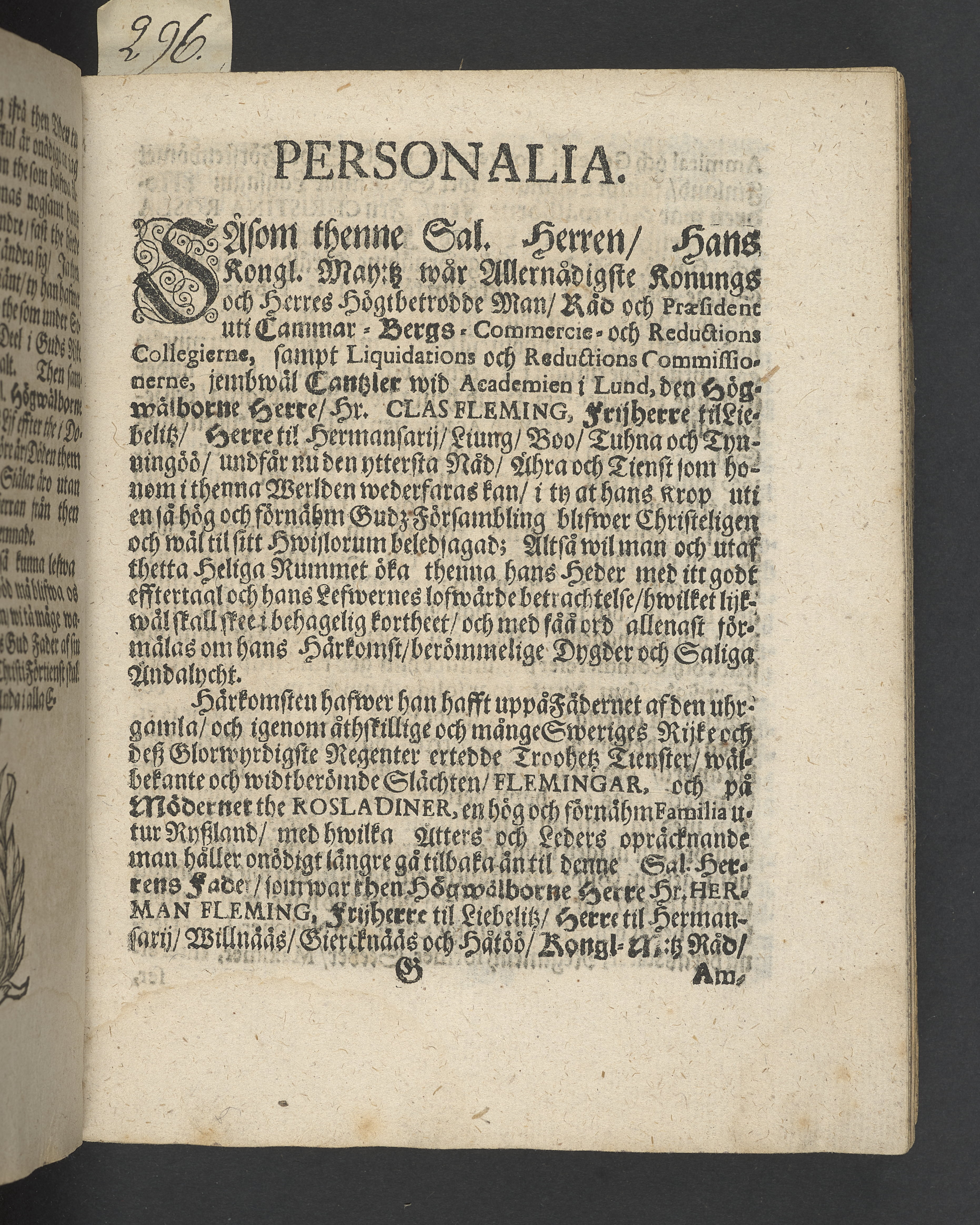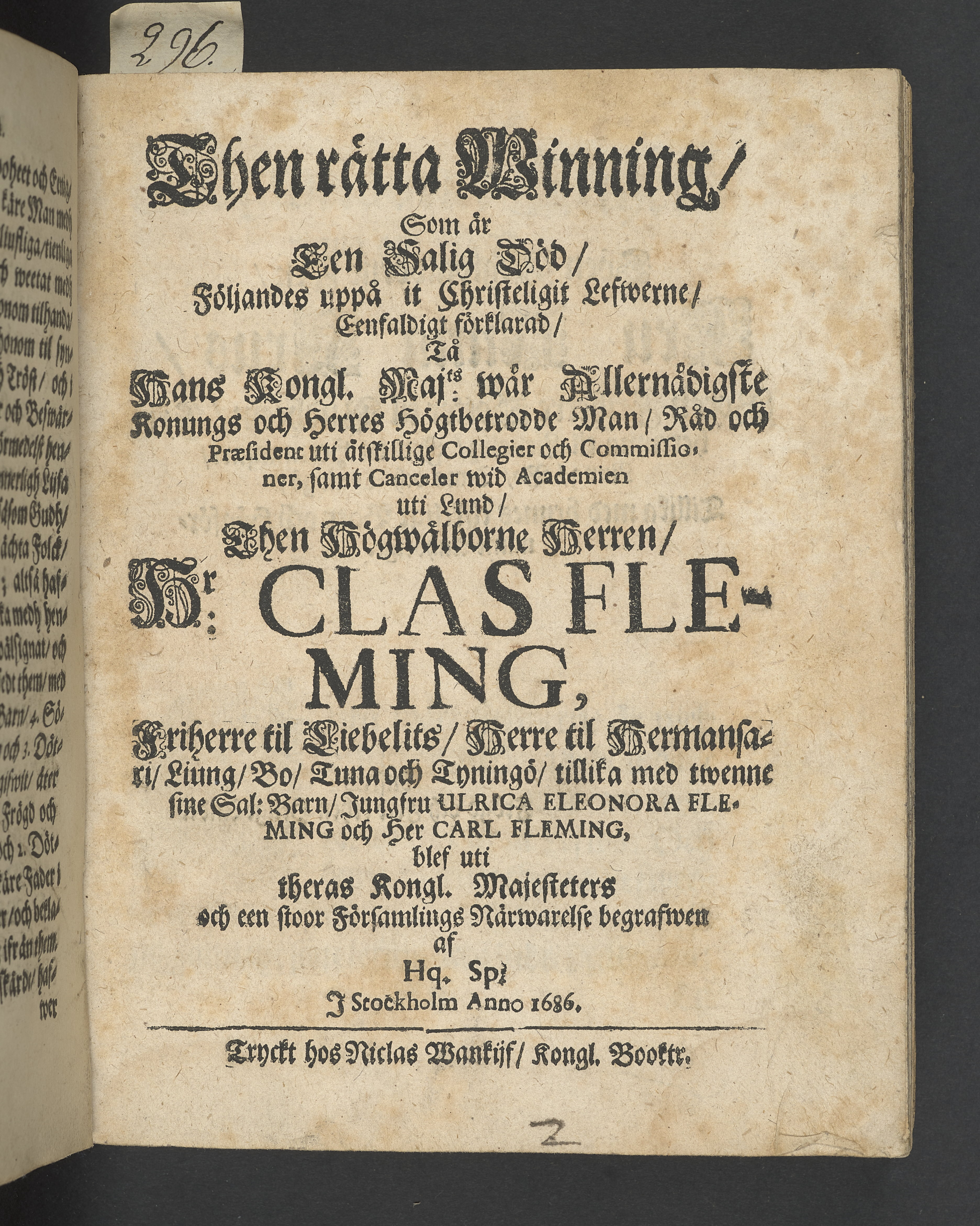 Then rätta winning, som är een salig död, följandes uppå it christeligit lefwerne, eenfaldigt förklarad, tå ... H:r Clas Fleming, friherre til Liebelits ... tillika med twenne sine sal: barn, jungfru Ulrica Eleonora Fleming och her Carl Fleming, blef ... begrafwen af Hq. Sp: i Stockholm anno 1686