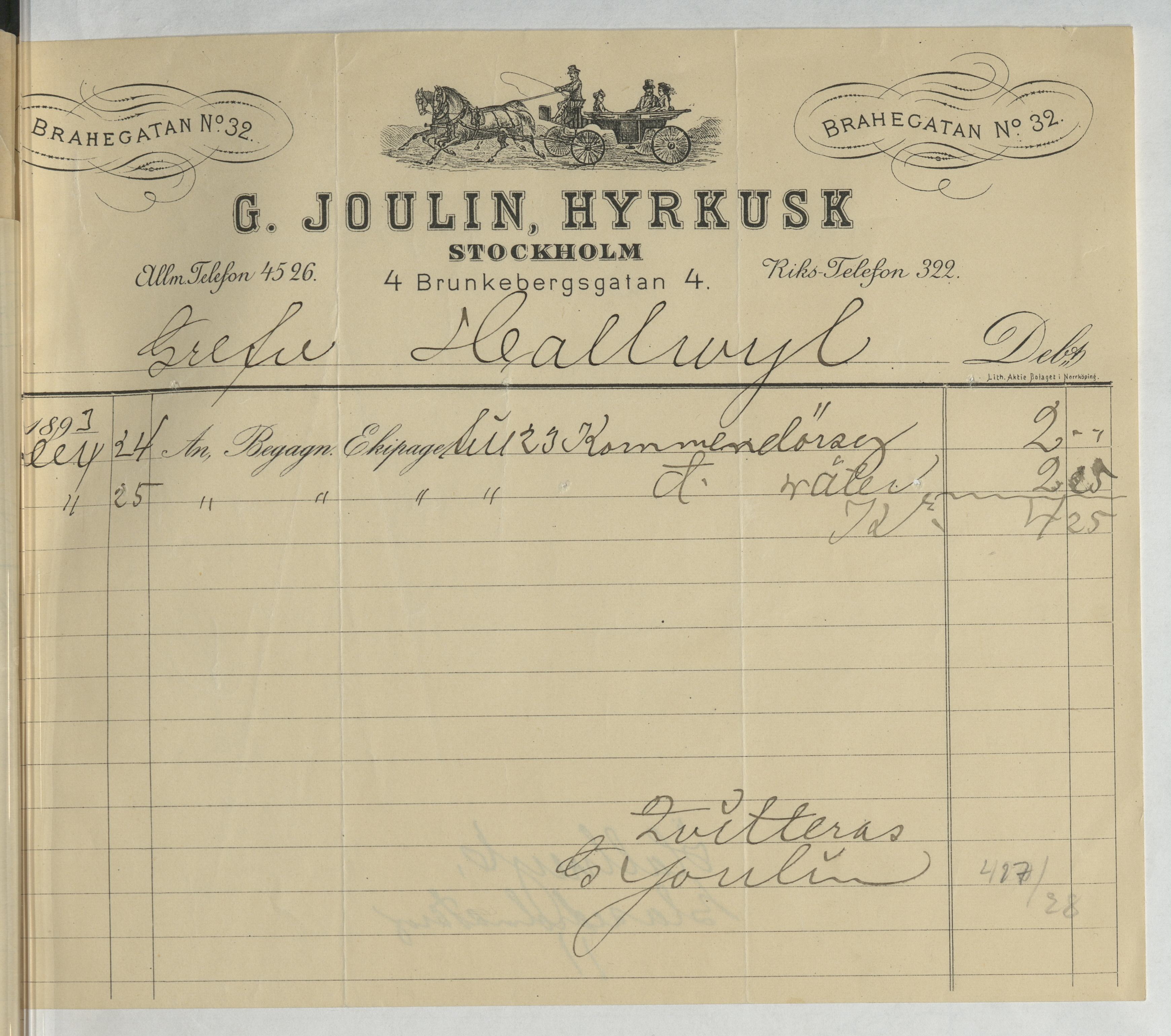 Kvitto från G. Joulin, Hyrkusk. Stockholm, 1893.