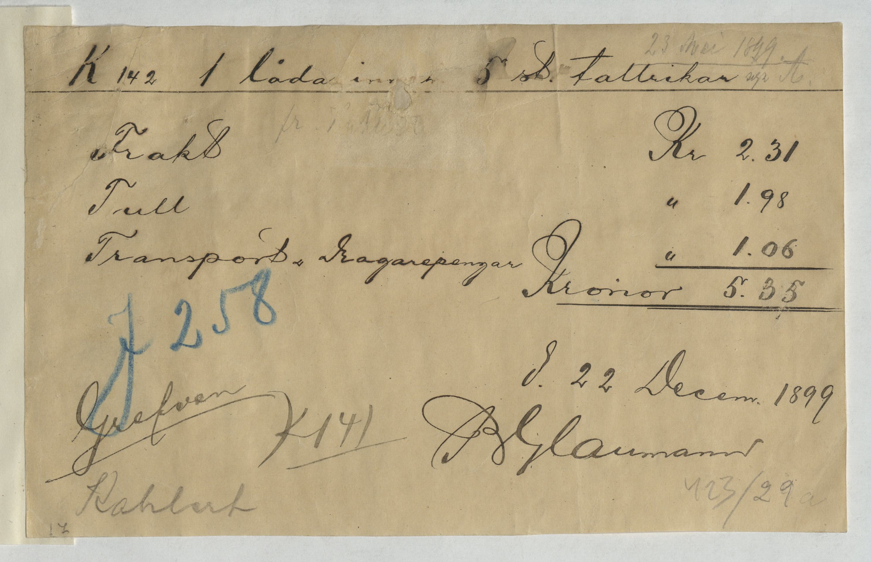 Kvitto gällande frakt- och tullavgifter för varor från Eduard Kahlert. Troligen fem stycken tallrikar. December 1899.
