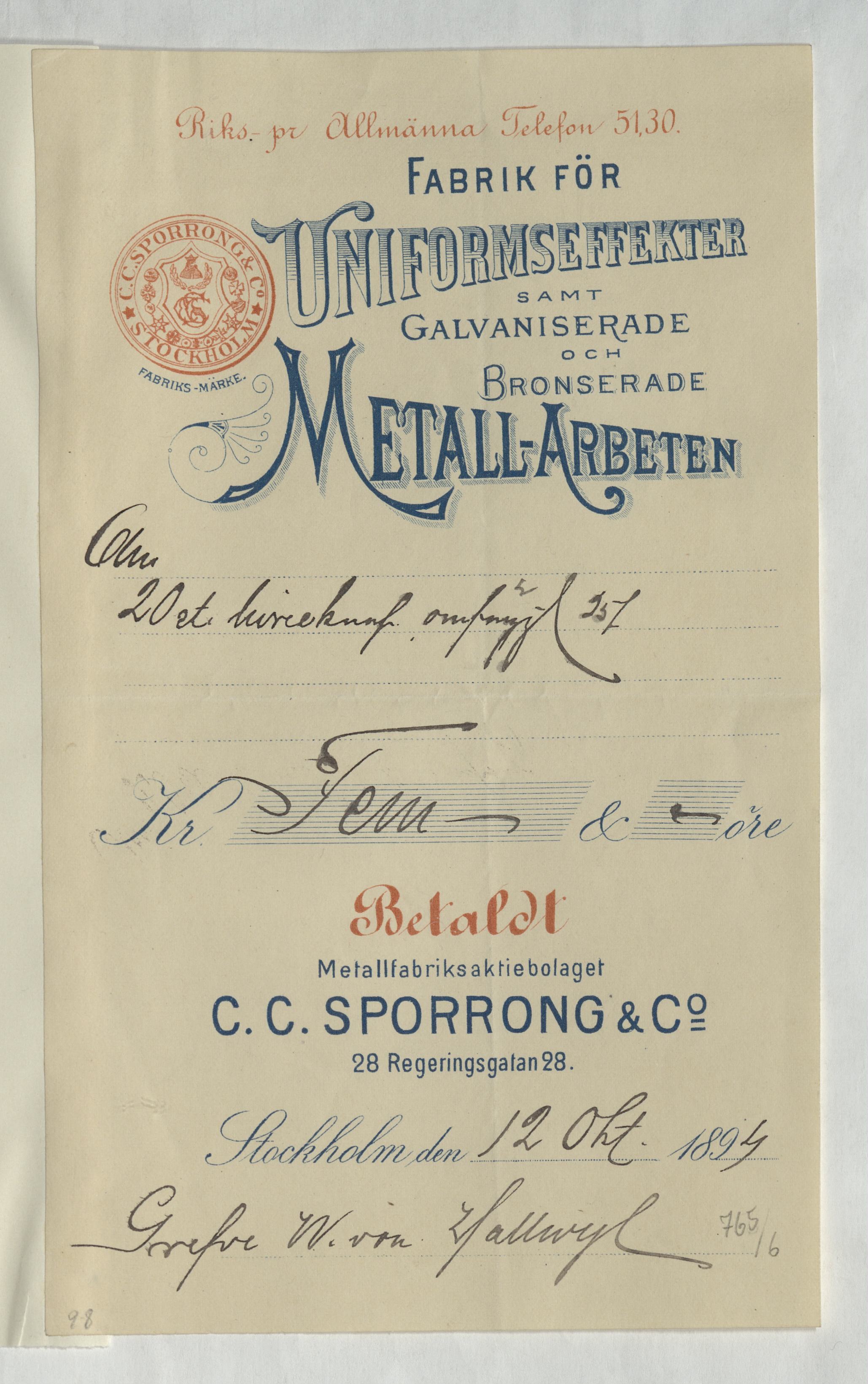 Kvitto från C. C. Sporrong & Co. Gällande omförgyllning av livréknappar. Stockholm, 1894.