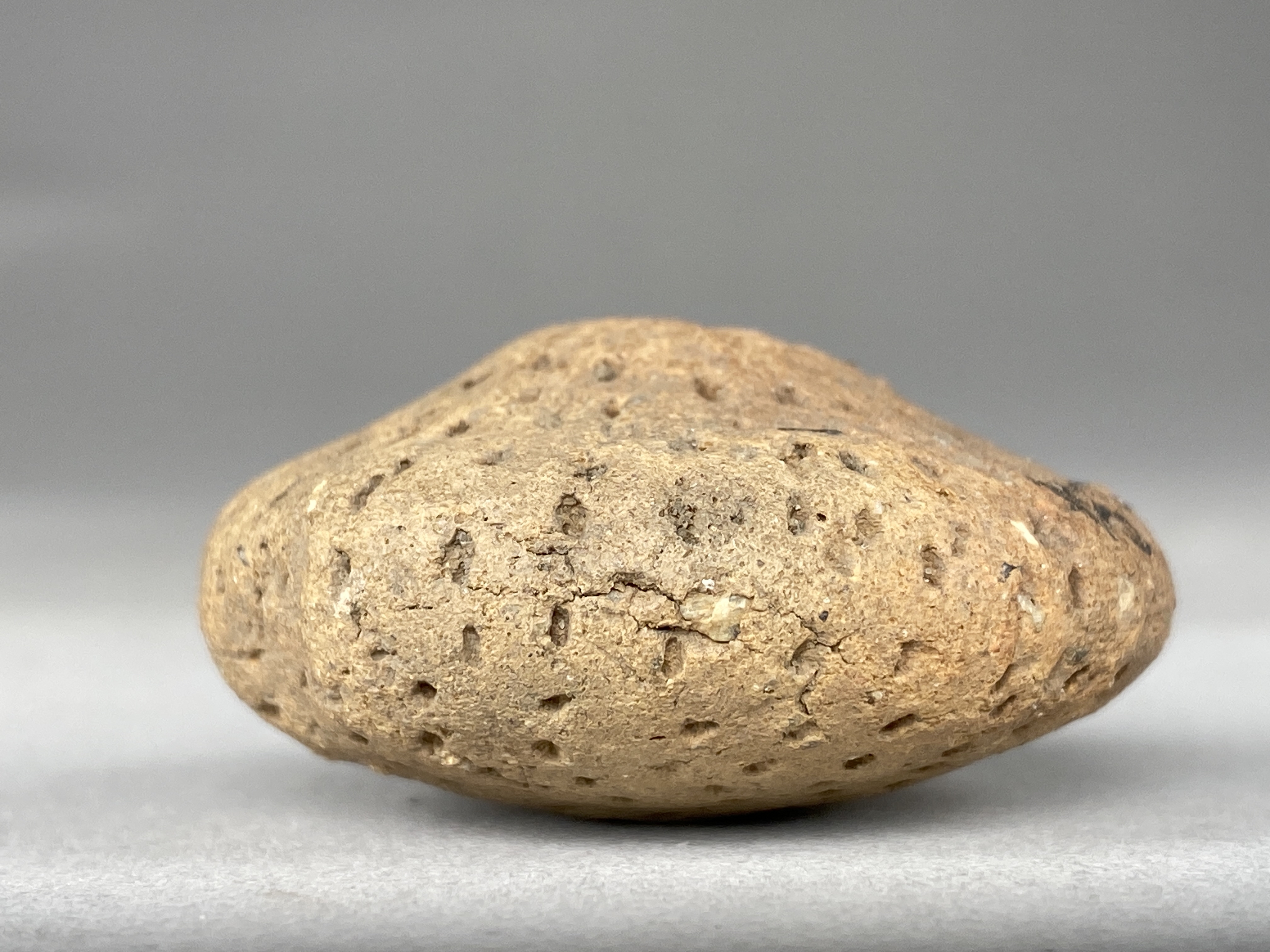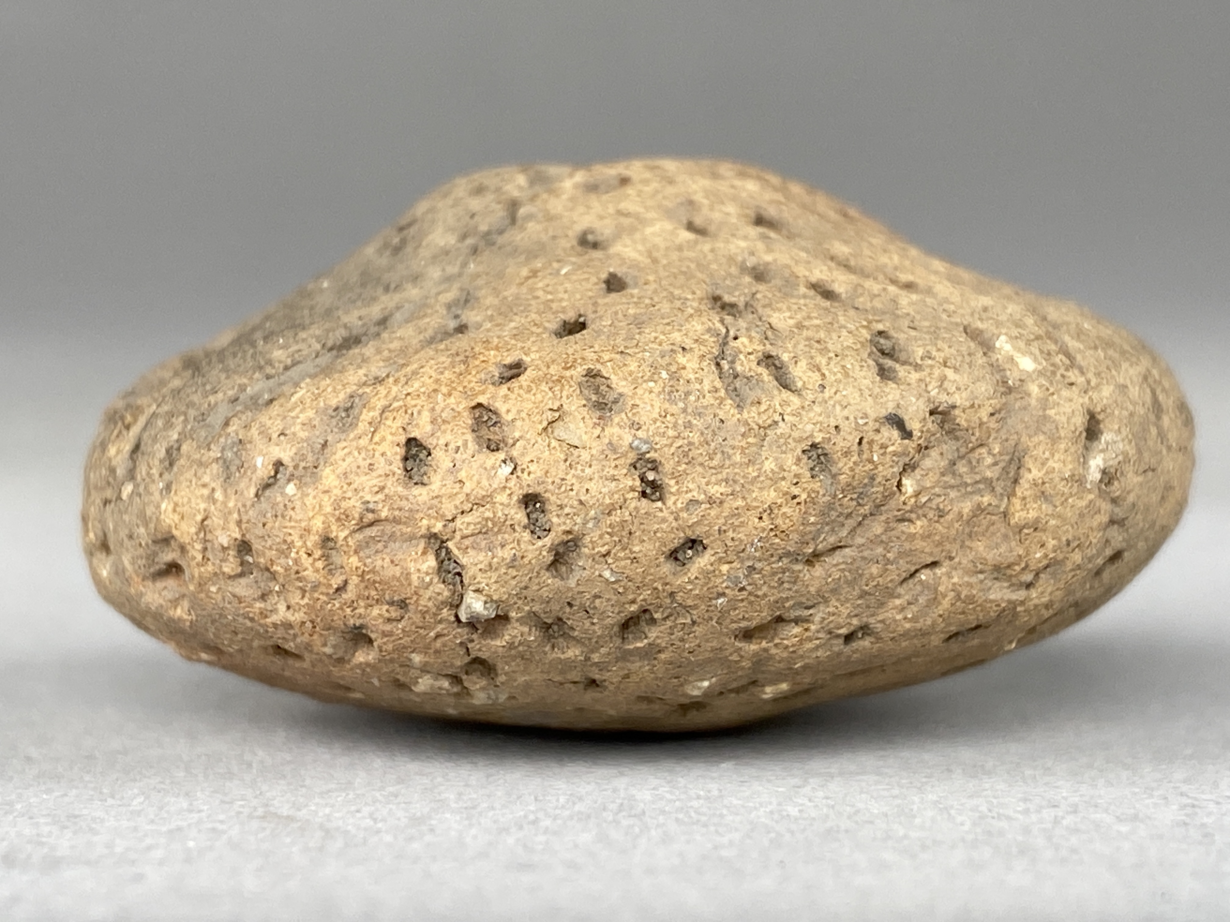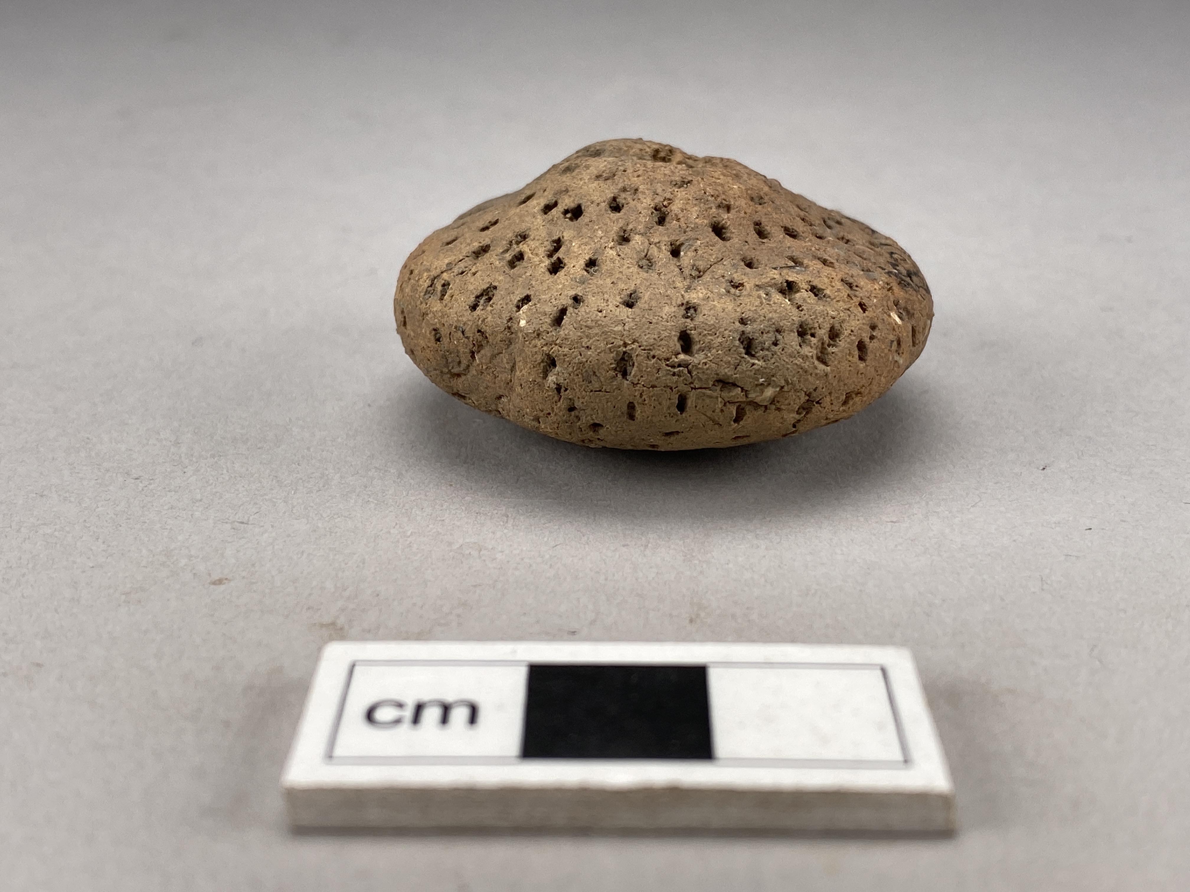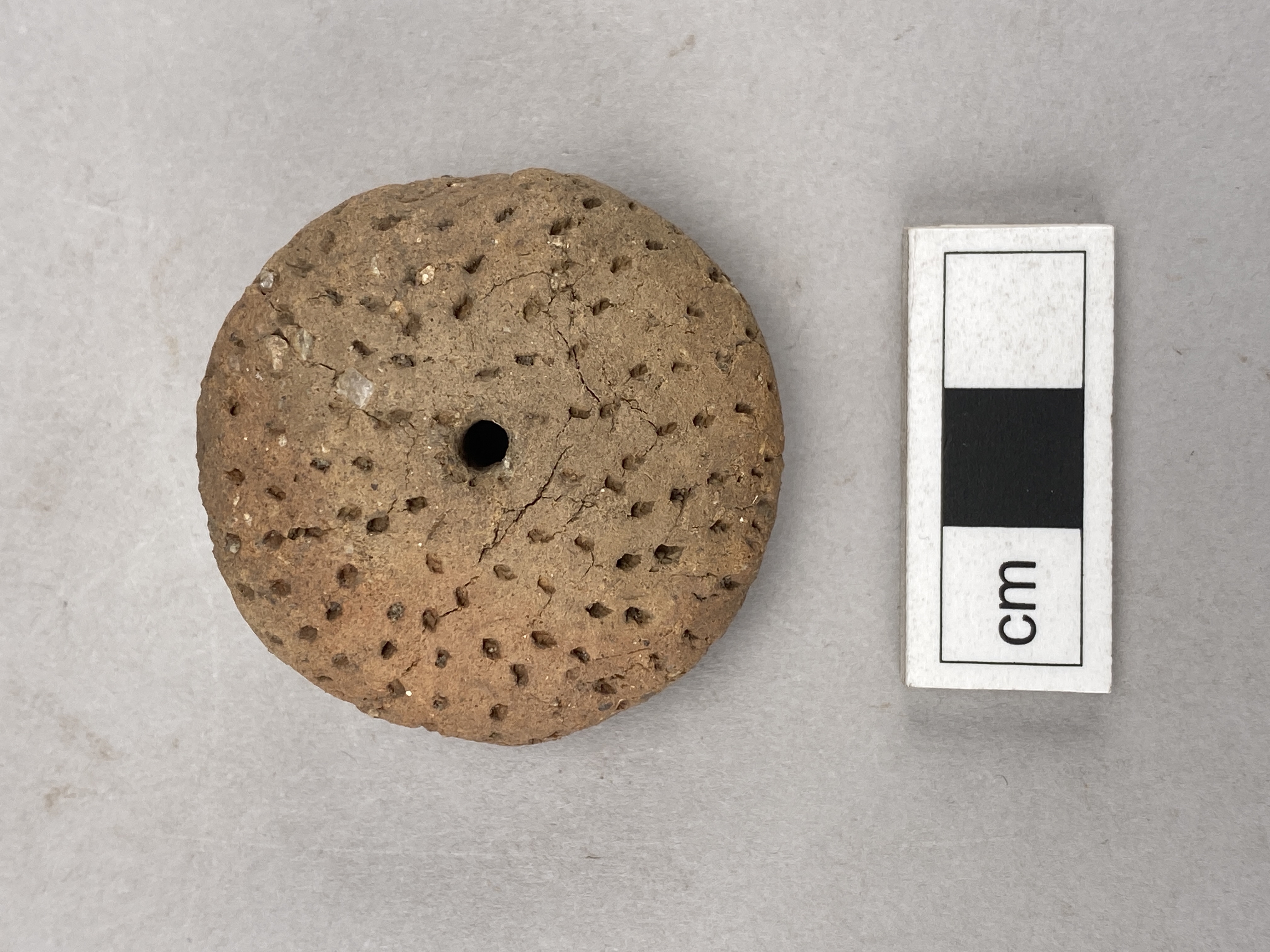 Rund pärla med genomgående hål. Svagt rundad på ena sidan och lätt koniskt på den andra. Yttäckande dekor av små grunda intryck. Fast bergartsmagrat gods. Lätt diskusformad.