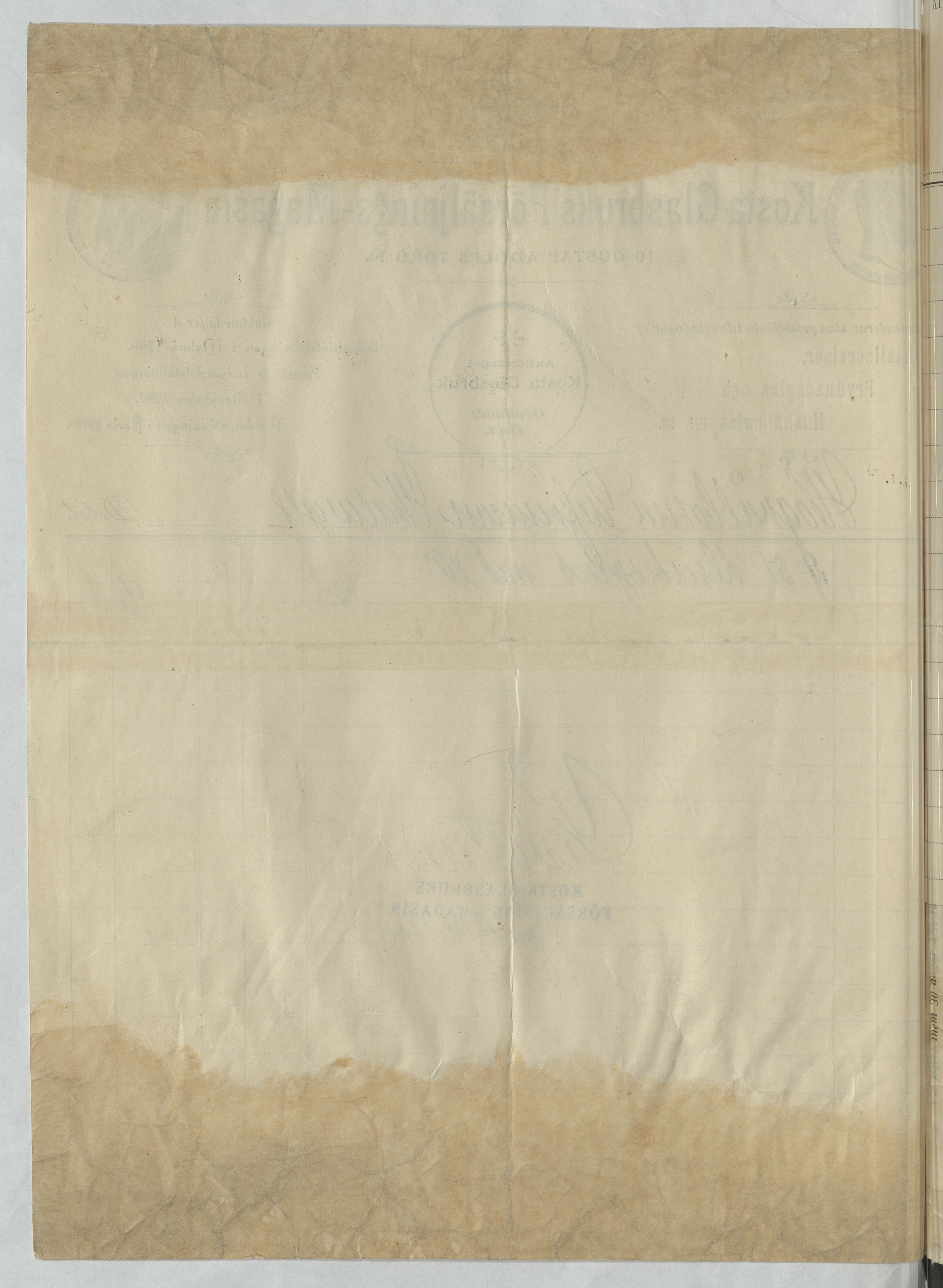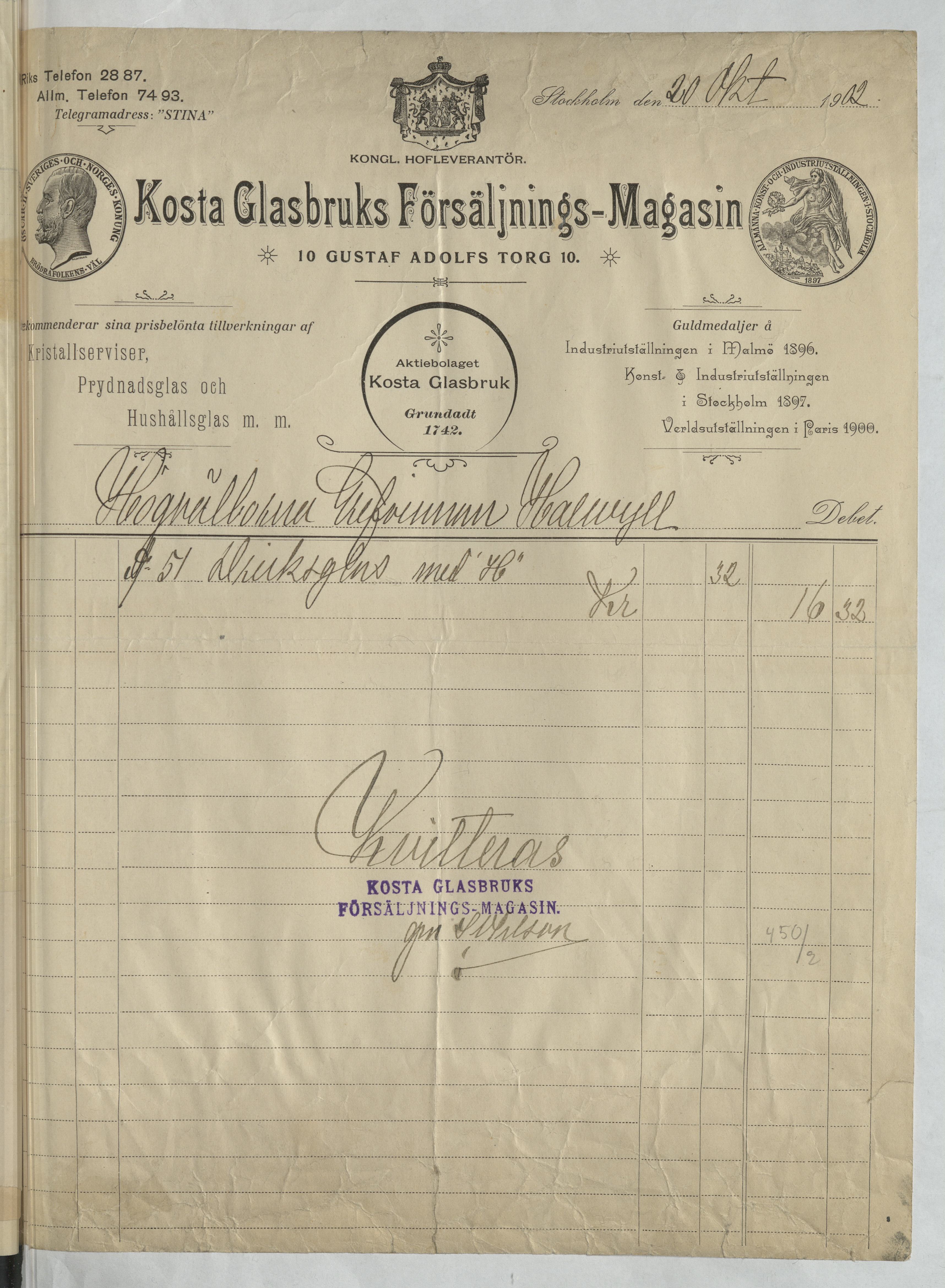 Kvitto från Kosta Glasbruks Försäljnings-Magasin. Stockholm, 1902.