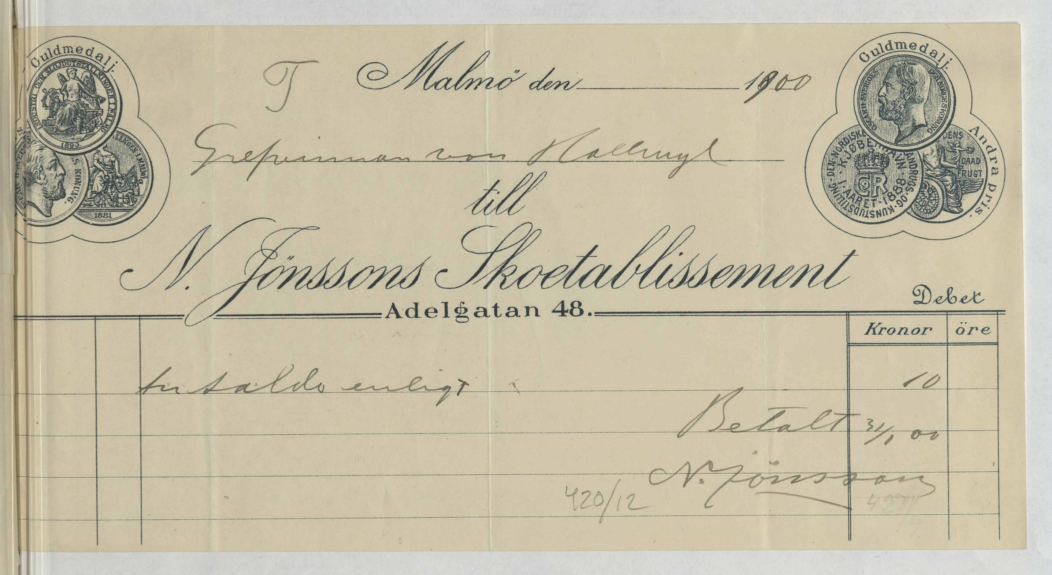 Kvitto från N. Jönssons Skoetablissement. Malmö, 1900.
