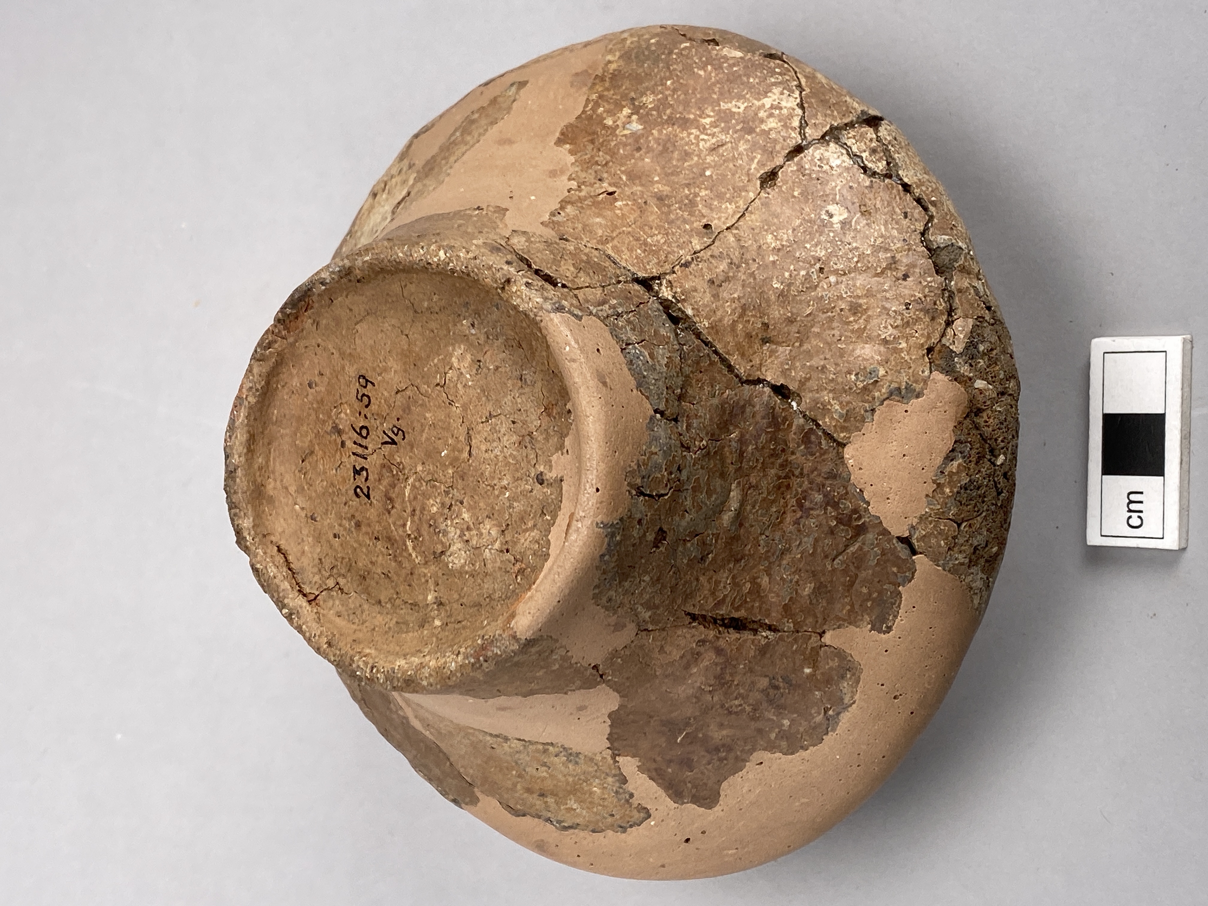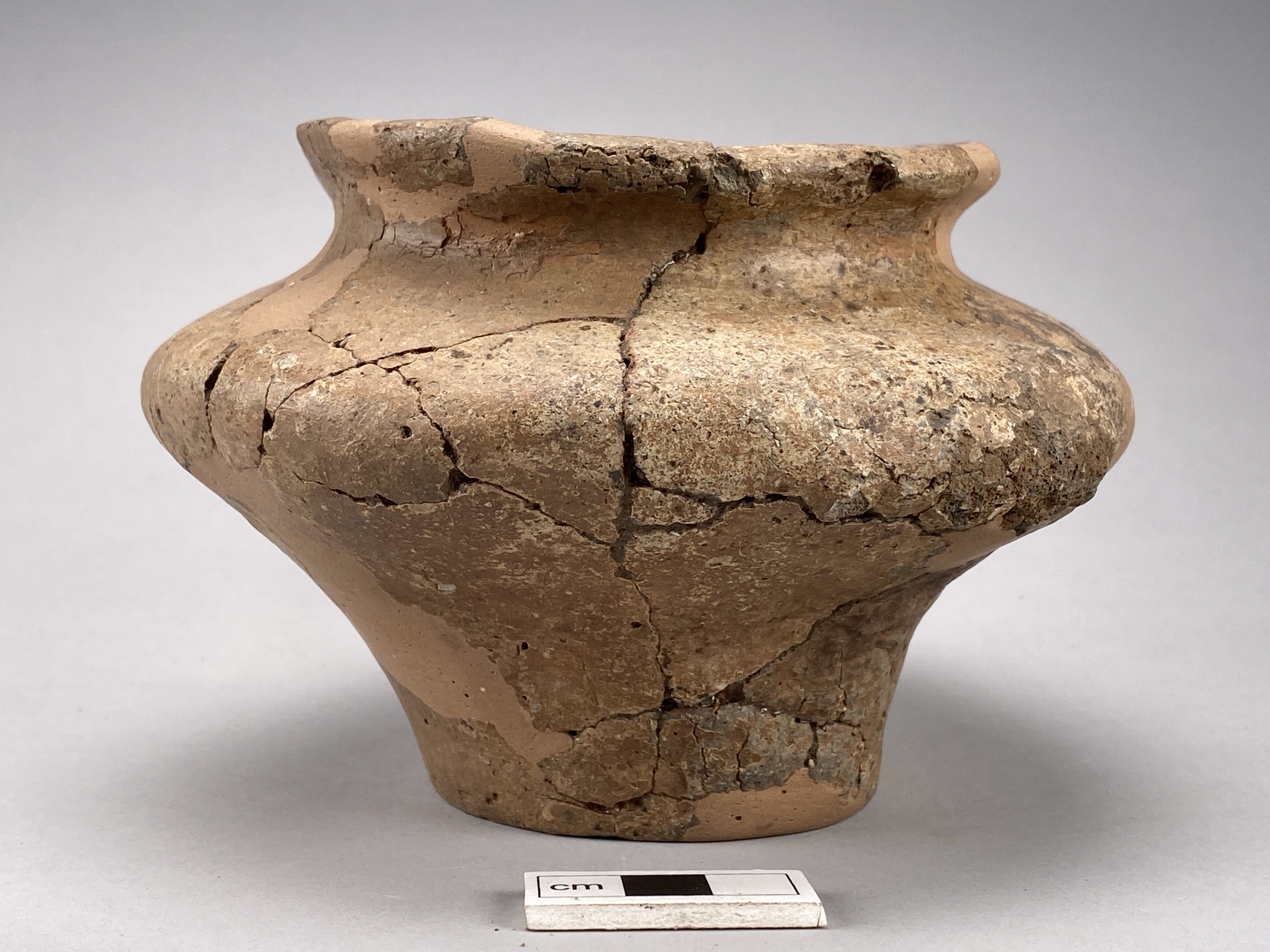 fint, oxiderat bränt pokalkärl. starkt indraget mynningsparti, utvidgad skuldra och indraget fotparti. Bottens undersida är kant längs foten.