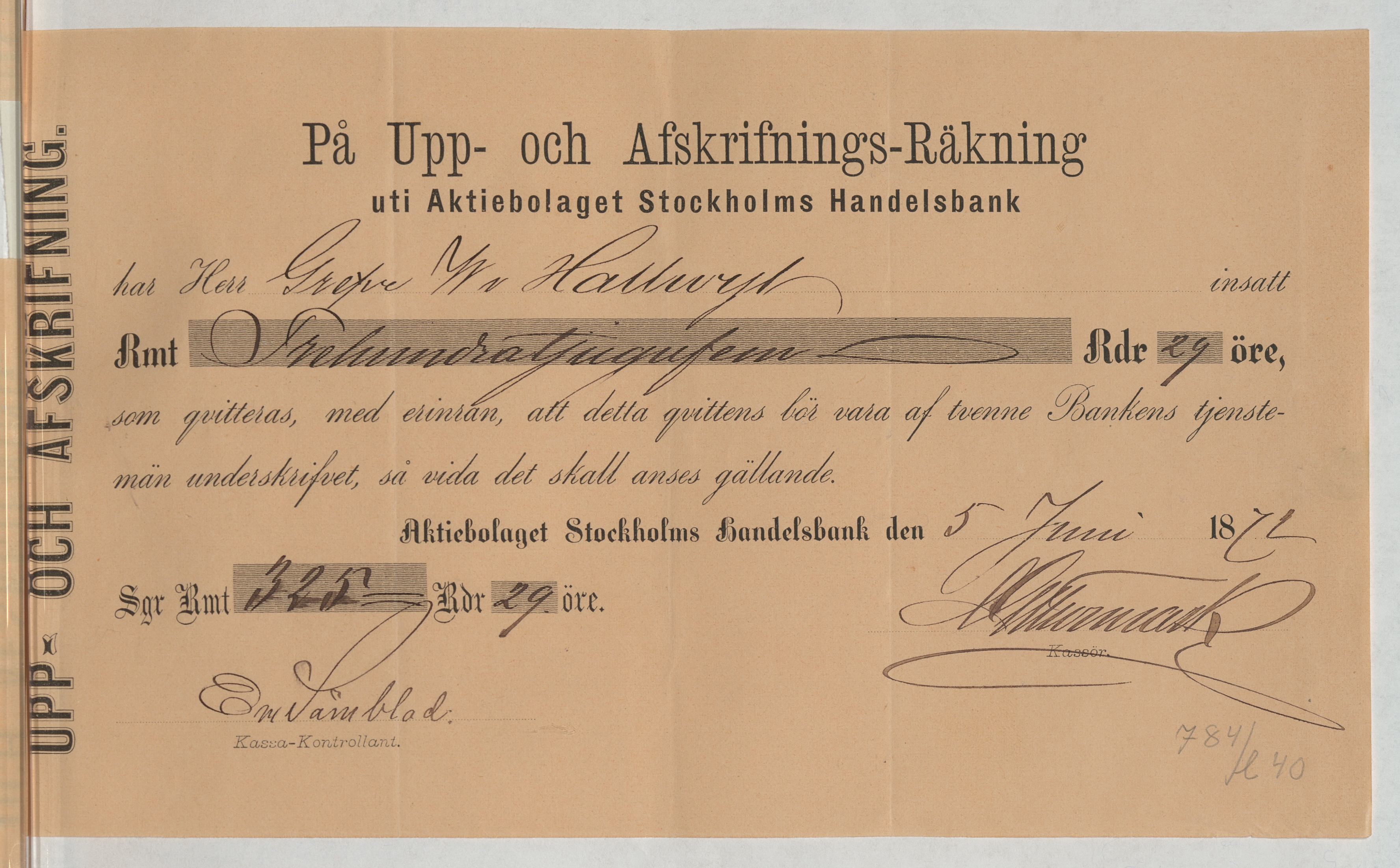 Kvitto från Aktiebolaget Stockholms Handelsbank rörande Upp- och Afskrifnings-Räkning