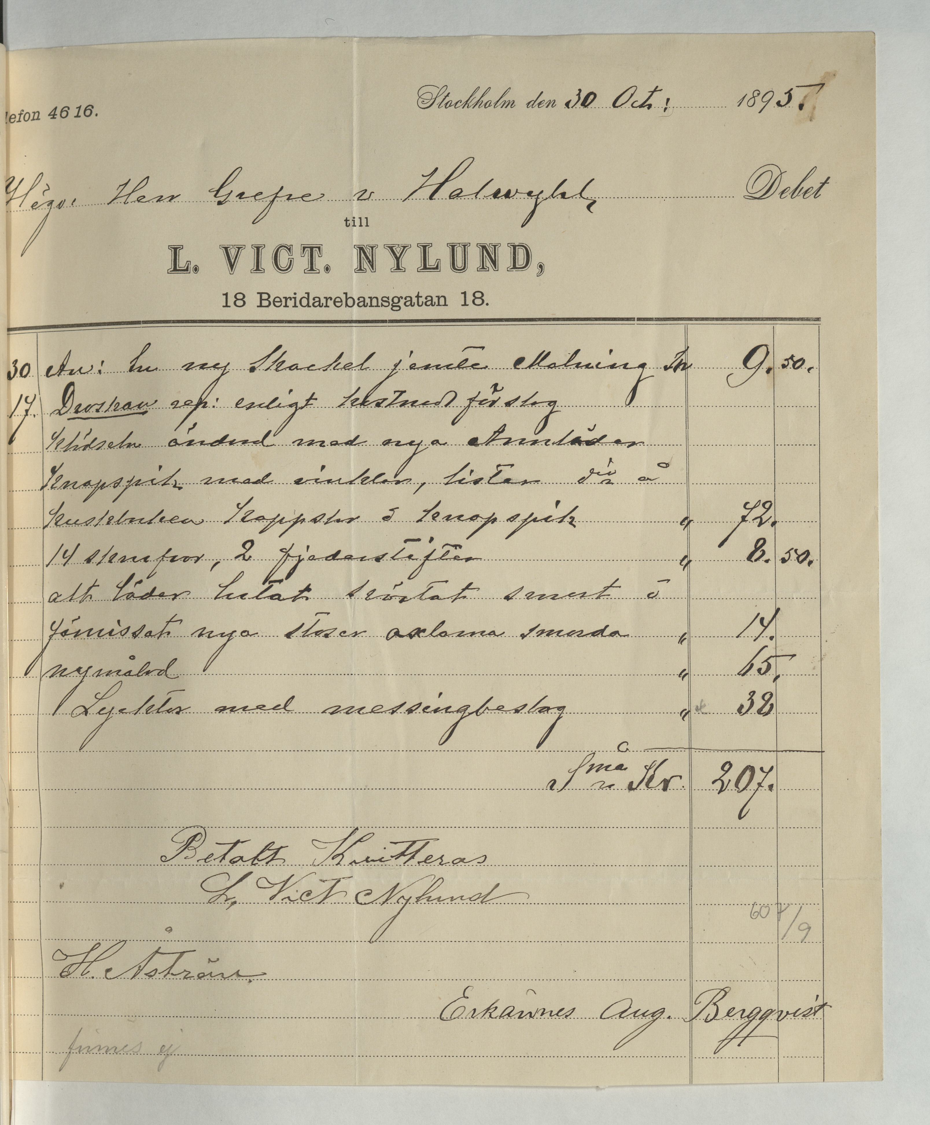 Kvitto från Victor L. Nylund, Sadelmakare, på en summa av 207Kr. Stockholm 30 oktober 1895.