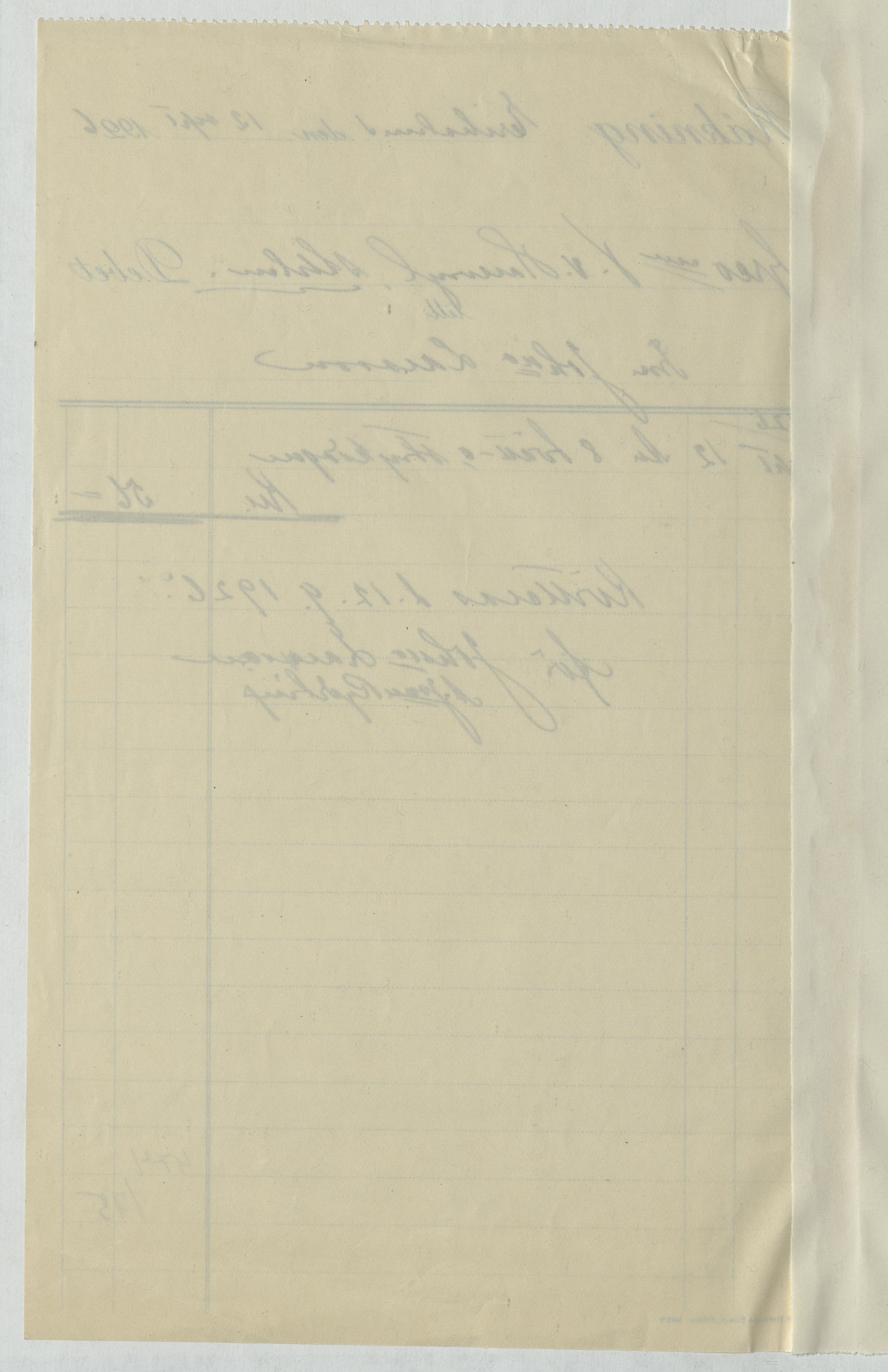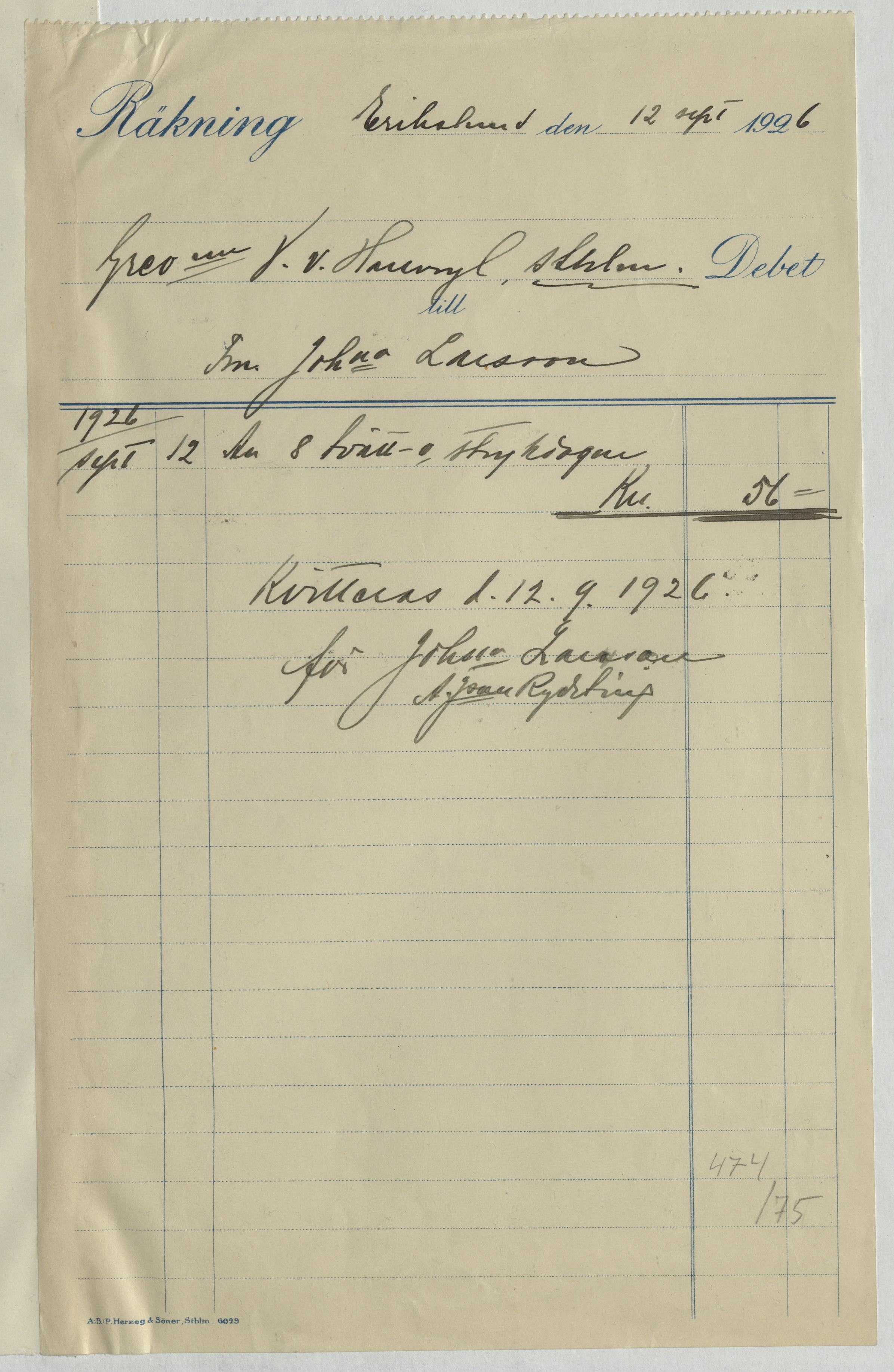 Kvitto från Johanna Larsson i Erikslund. Gällande 8 tvätt- och strykdagar. Erikslund, 1926.