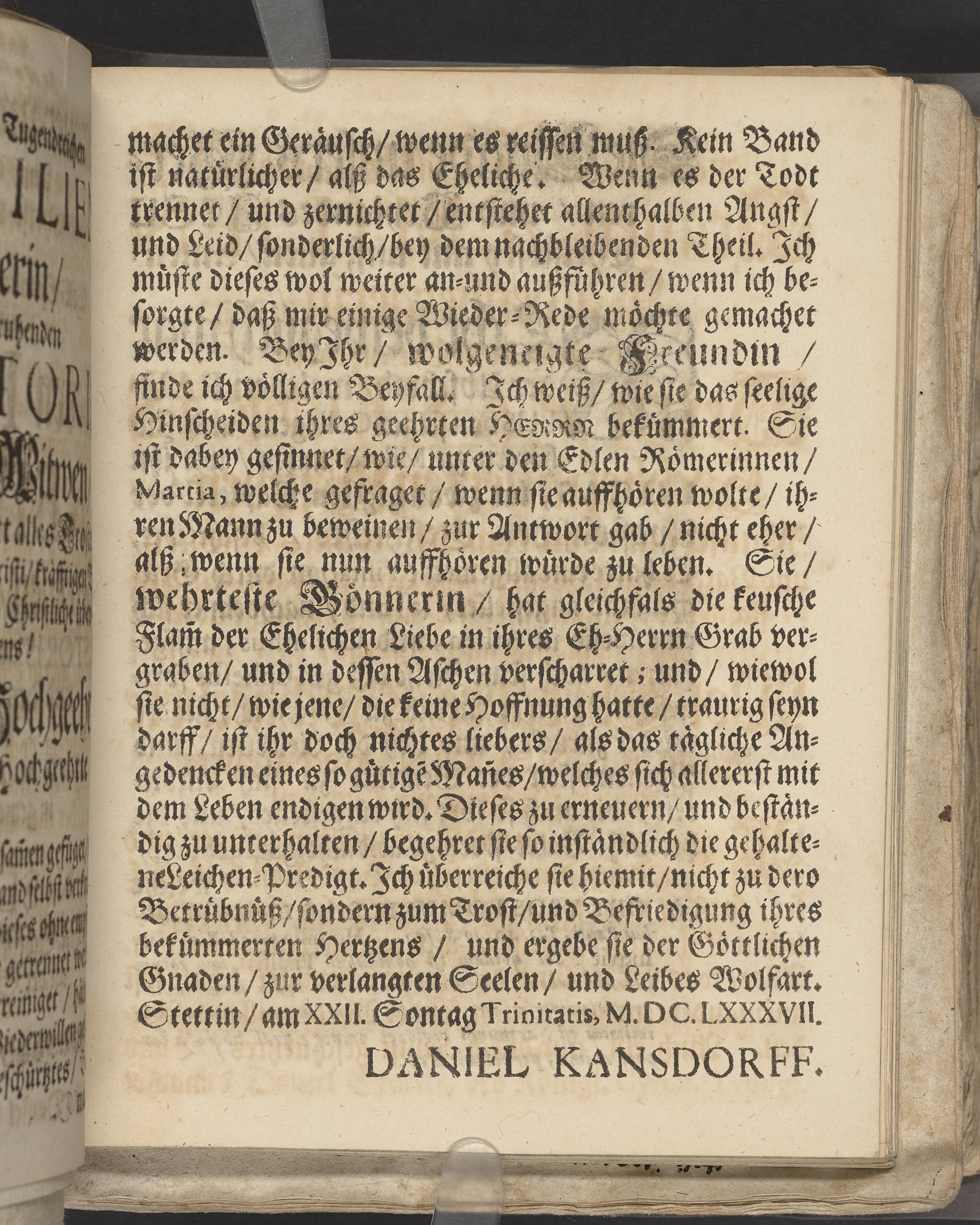 Längst upp på titelsidan anteckning om födelse- och dödsdatum för den avlidne. Längst ner på titelsidan ägaranteckning av Eva Bielke (Eva Bielke, f. 1677 d. 1715).