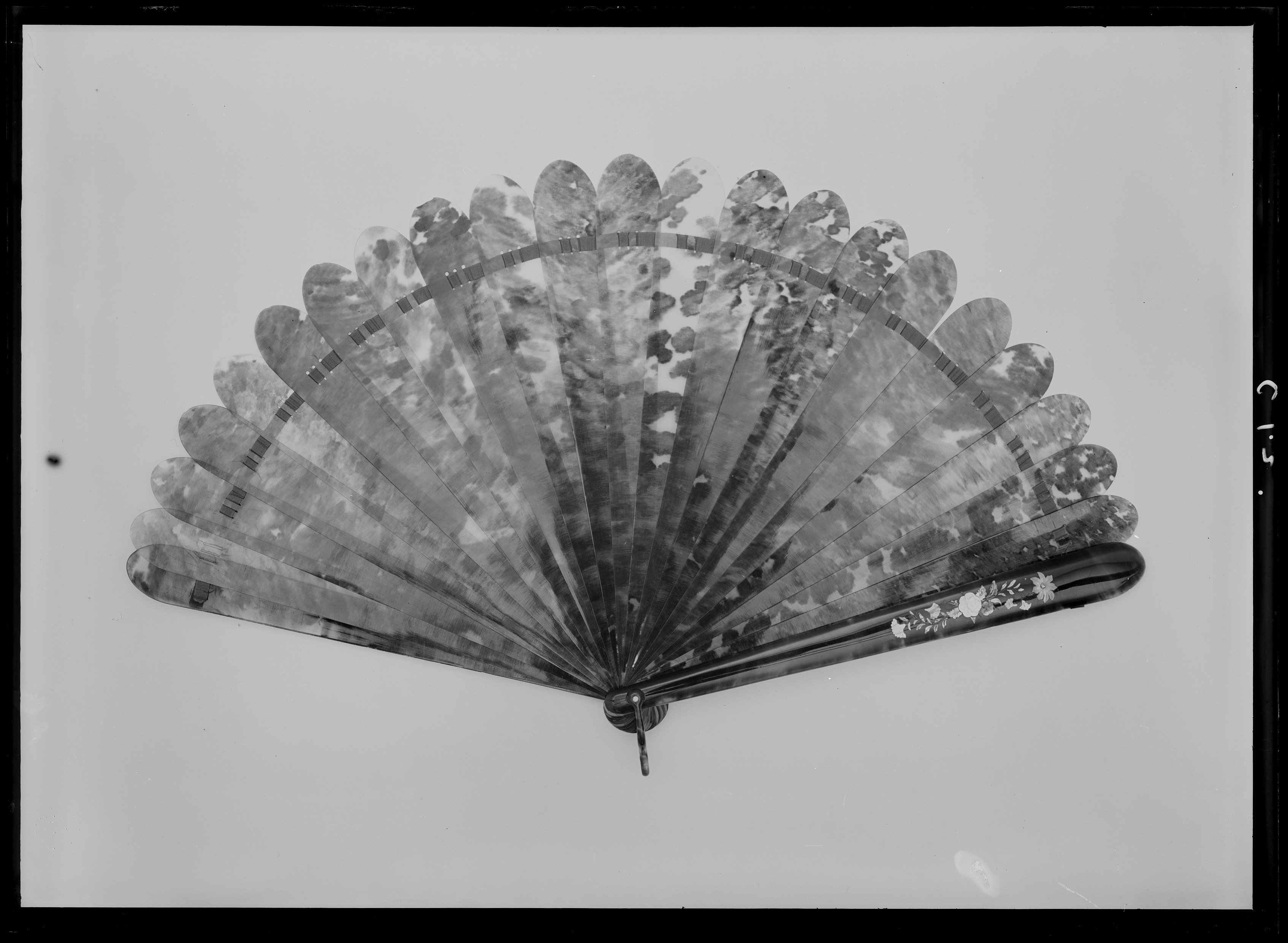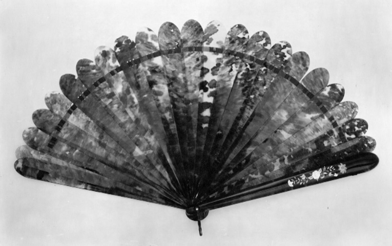 Sammansatt av 23 utåt breddade blad av sköldpadd med rundade ändar, sammanhållna i nederänden av silverstift, upptill av brunt sidenband, trätt igenom tre slitsar i bladen. De yttre bladen rundade på utsidan, inläggningar med delvis färgad pärlemor, blomsterranka med gröna blad, vita och blå blommor, bl.a. rosor och åkervinda. I nederänden bygel av sköldpadd.