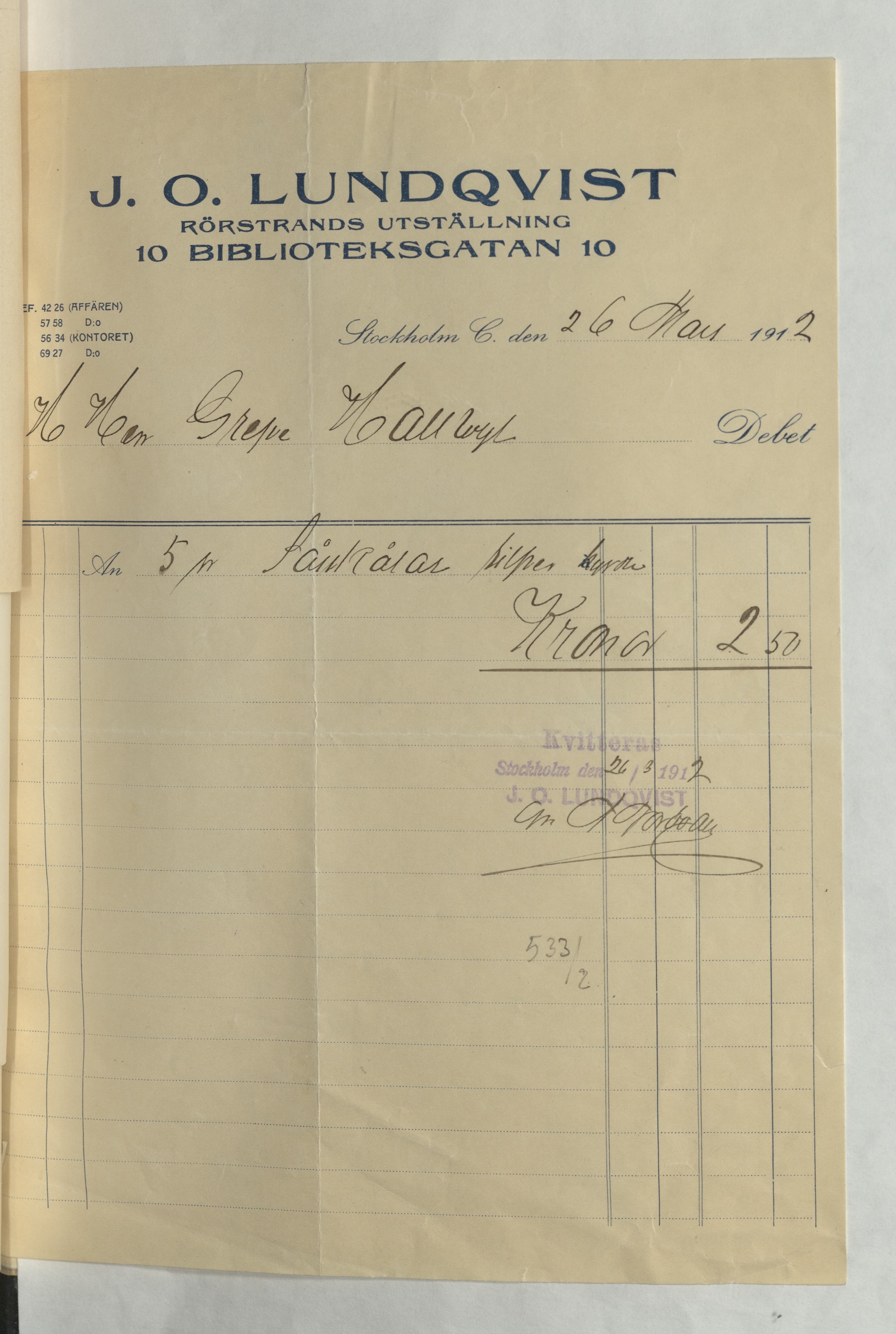 Kvitto till Herr Greve Hallwyl för inköp hos J. O. Lundqvist, Rörstrands Porslins-Magasin, Rörstrandsutställning för en summa av 2:50Kr. Stockholm 26 mars 1912.