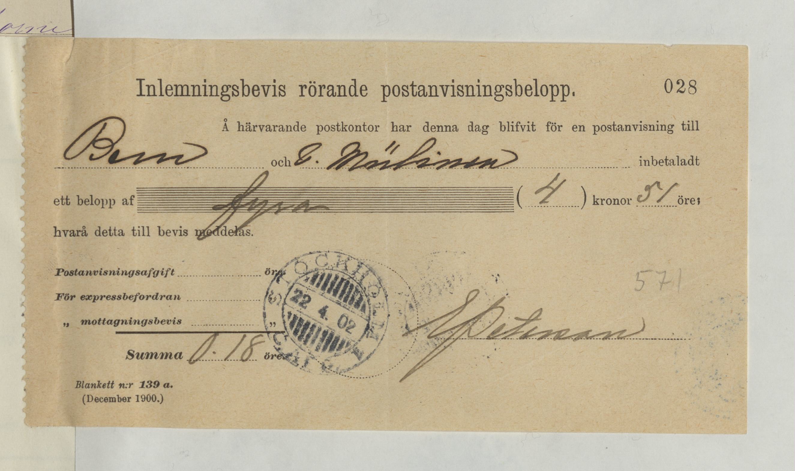 Inlämningsbevis rörande postanvisning till I. von Mülinen, Bern. Inbetalat ett belopp av 4:51Kr. Stockholm 22 april 1902.