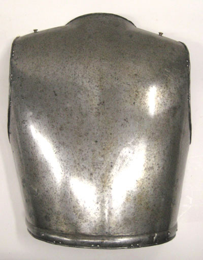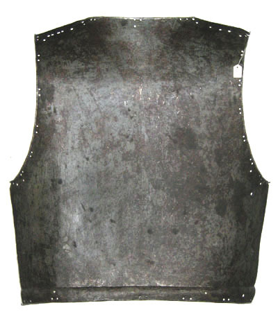 Driven stålplåt i ett stycke. Utsidan svartfläckig och insidan brunsvart med sliten gråaktig bemålning. Rak, stram form. Framåtdragena axlar, B 70 mm. Rundat urtag för nacken, kanten omvikt utåt och uupdriven till en bakåt sluttande krage. Rundade långa urtag för armarna, kant som ovan. Försänkt ränna mellan skulderbladen. Längs nedre kanten en driven svagt välvd bård, B 18 mm. Kanten omvikt utåt. Parställda hål i rad längs nacke, armar och nedre kant. Över axlarna flera hål i rad och utstående nit av gulmetall.