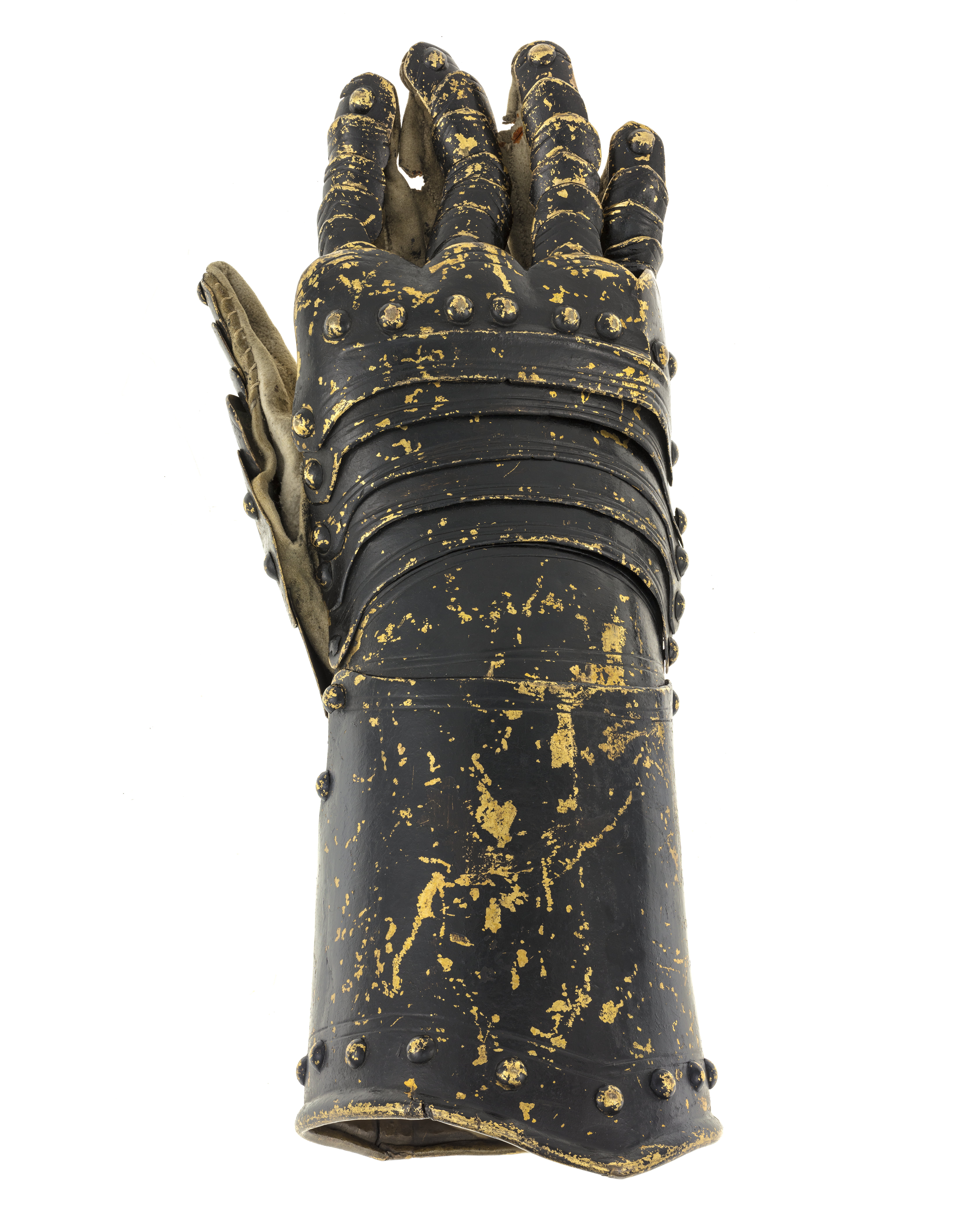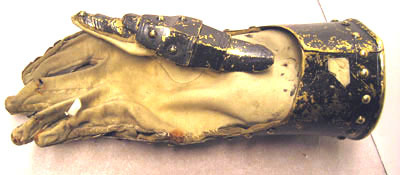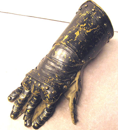 Höger rustningshandske tillverkad för Pfalzgreve Johan Casimirs begravningsrustning 1652 och omgjord för Johan Gyllenstierna och Karl X Gustavs begravningsrustning, Stockholm 1660.