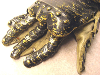 handskar af messing, svarlackerade, invändigt försedda med skinnhandskar - högerhandsken i 41 delar och vensterhandsken i 39 -