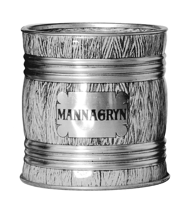 BURK till mannagryn Av bleckplåt. Tunnformig, med svagt bukig mitt samt med trycklock. Burken utvändigt lackerad i ekimitation i form av en laggad tunna med två grupper guldfernissade stavformiga band, tre ivardera gruppen, på nedre bandgruppen i svart: "Burken till form och färg lagligen skyddad. A. B. Bleckvarufabr. Malmö." mellan bandgrupperna en utspard, liggande avlång etikett med ingripna rundade hörn, på denna isvart mot guldfernissad botten: MANNAGRYN Lock plant, med rakt uppstående inutigående kantfals med rakt utstående kantfläns. Höjd: 11,4 cm.; diameter: 11,3 cm. Svensk tillverkning.