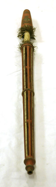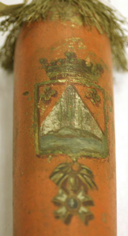 Lans av trä, bestående av kolv, handtag, framdel och holk. Lansen är målad i rött och silver. Bakåt avsmalnande, cylindrisk kolv med rundade ändar. Målad i röd grundfärg och dekorerad med friherrliga ätten Cederströms hjärtsköld. Hjärtskölden består av en i rött fält spets av silver, belagd med tre gröna cederträd på ett grönt berg i havet, åtföljd av två fyrbladiga rosor av guld. Skölden krönt av friherrlig krona. Under skölden hänger svärdsorden. Kolven är i övrigt dekorerad med åtta strödda, fyrbladiga rosor i guld. Handtag klätt med vit siden. I handtagets båda ändar finns fransar av tvinnad guldtråd. Vidhängande rektangulär lapp med text: "Gripsholm 1945 // nr II: 9 // Fr T. G. Cederström // Drottningholm // 1799 el. 1800". Främre delen genombruten, svagt konisk med åtta längsgående ribbor, målade varannan i rött, varannan i silver. I ändarna och på mitten svarvade ringar. Förstärkningsstycken på varje halva i form av utsparade kulor, något försänkta under ribborna. Balusterformig, svarvad holk i rött och silver. Längst fram är det omålat, där en holkring troligen suttit. Framringen genomborrad av ett runt hål för fästning av spetsen.