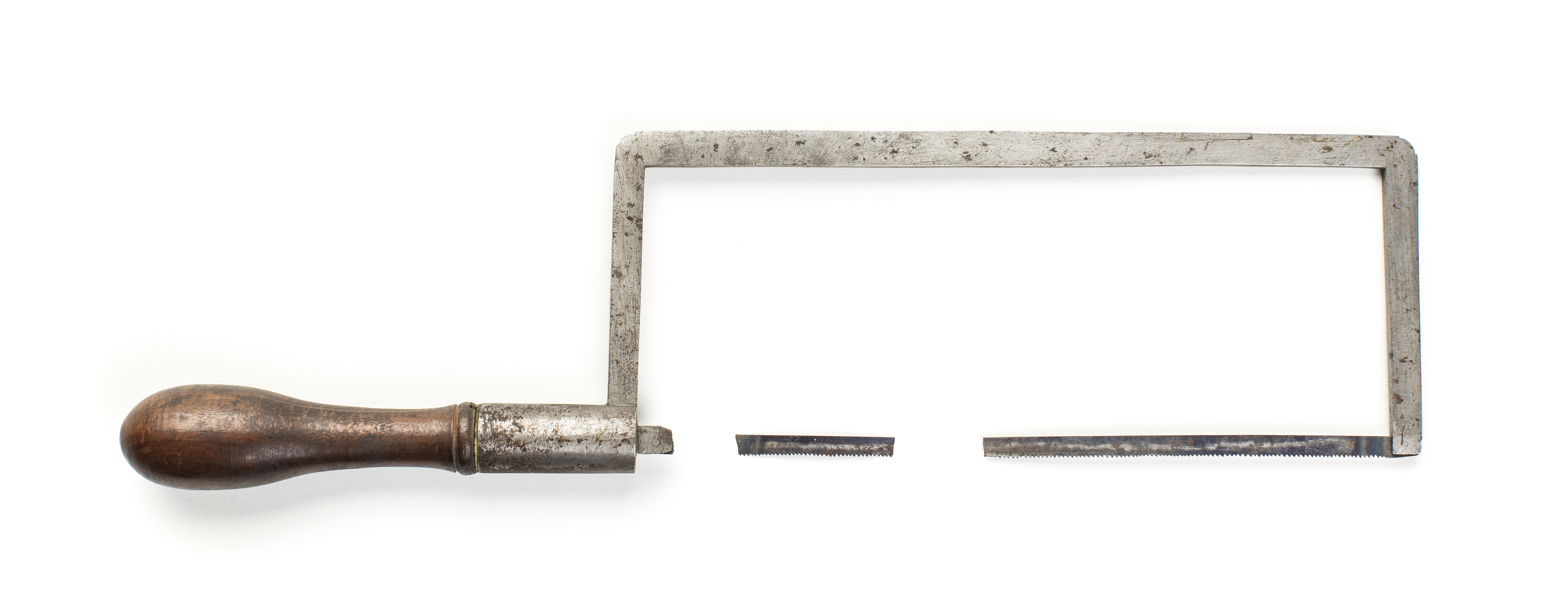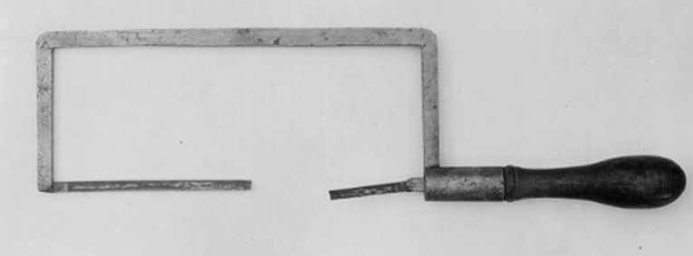 Bågsåg med båge med räta, på utsidan rundade hörn och rektangulärt tvärsnitt. I ena änden finns en slits för fastsättning av sågbladet och i den andra en hylsa, i vilken det sitter en fyrsidig axel med en slits i vilken bladets andra ände är fastnitad. Axeln, vars andra hälft är gängad, går axialt på hylsan och i skruven gängas handtaget som är svarvat, kägelformigt och i fäständen försett med en mässingshylsa som skruvas in i hylsan på bågen. Invid hylsan är skaftet dekorerat med en vulst genom vilken en mässingsstav är stucken. Staven har ett gängat hål placerat axialt i skafet och i detta skruvas axeln . Blånat blad från ca 1900. Tandavstånd 1,2 mm.