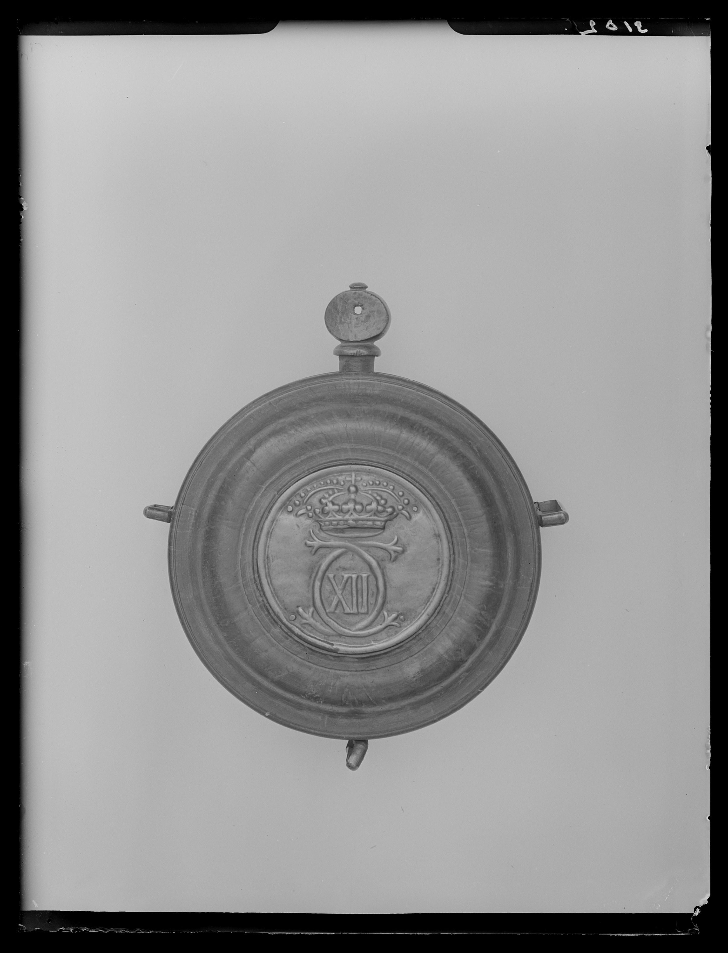 Dosformig krutflaska av svarvad björk(?). Plan baksida, vulstformig framsida med plan mittplatta täckt av en pressad mässingsplåt med Karl XII:s krönta spegelmonogram. Tre rembyglar av mässing. Pipskoning av horn, övre delen saknas. Svarvad propp av trä med skivformigt huvud, h: 75 mm, liten knopp upptill.