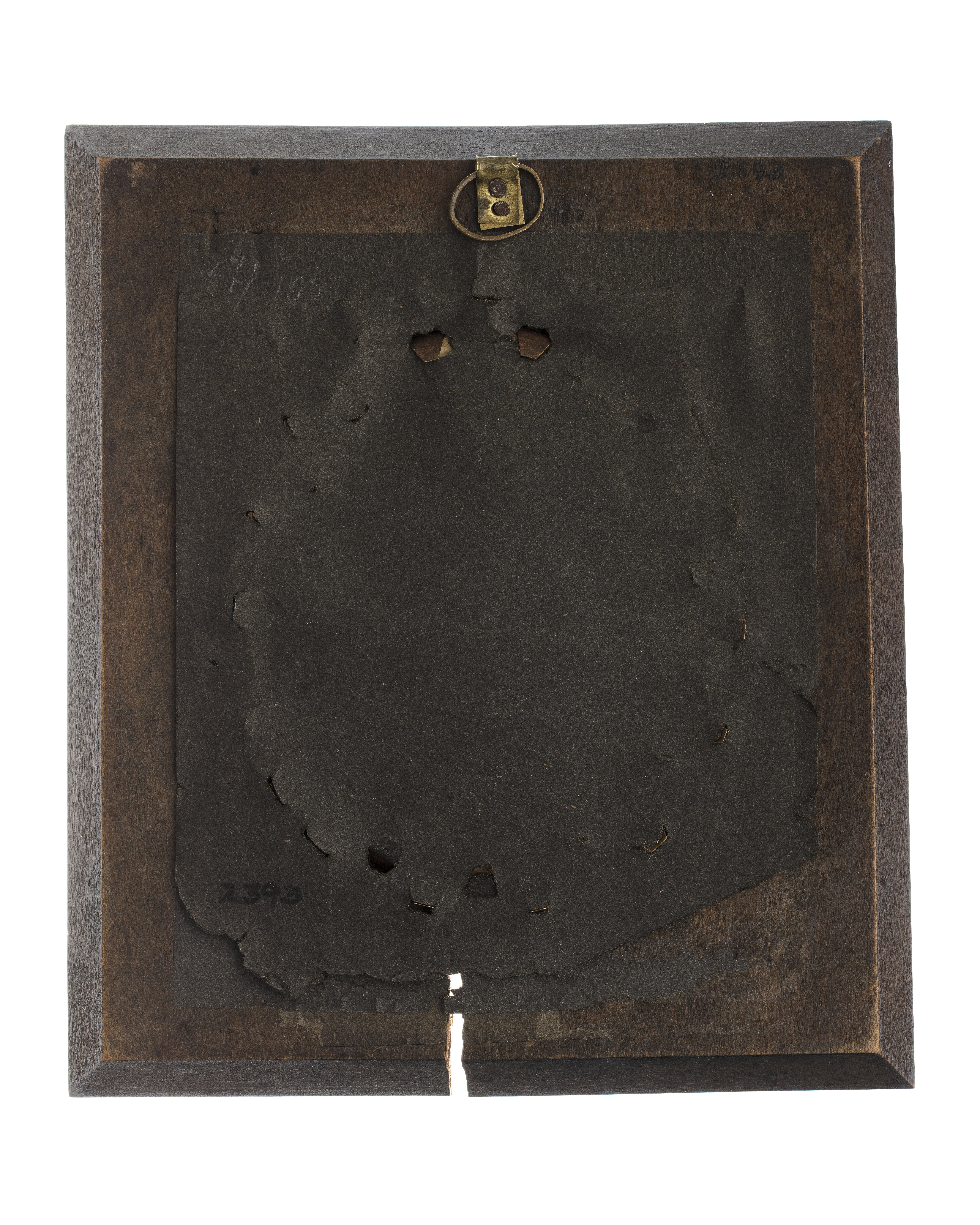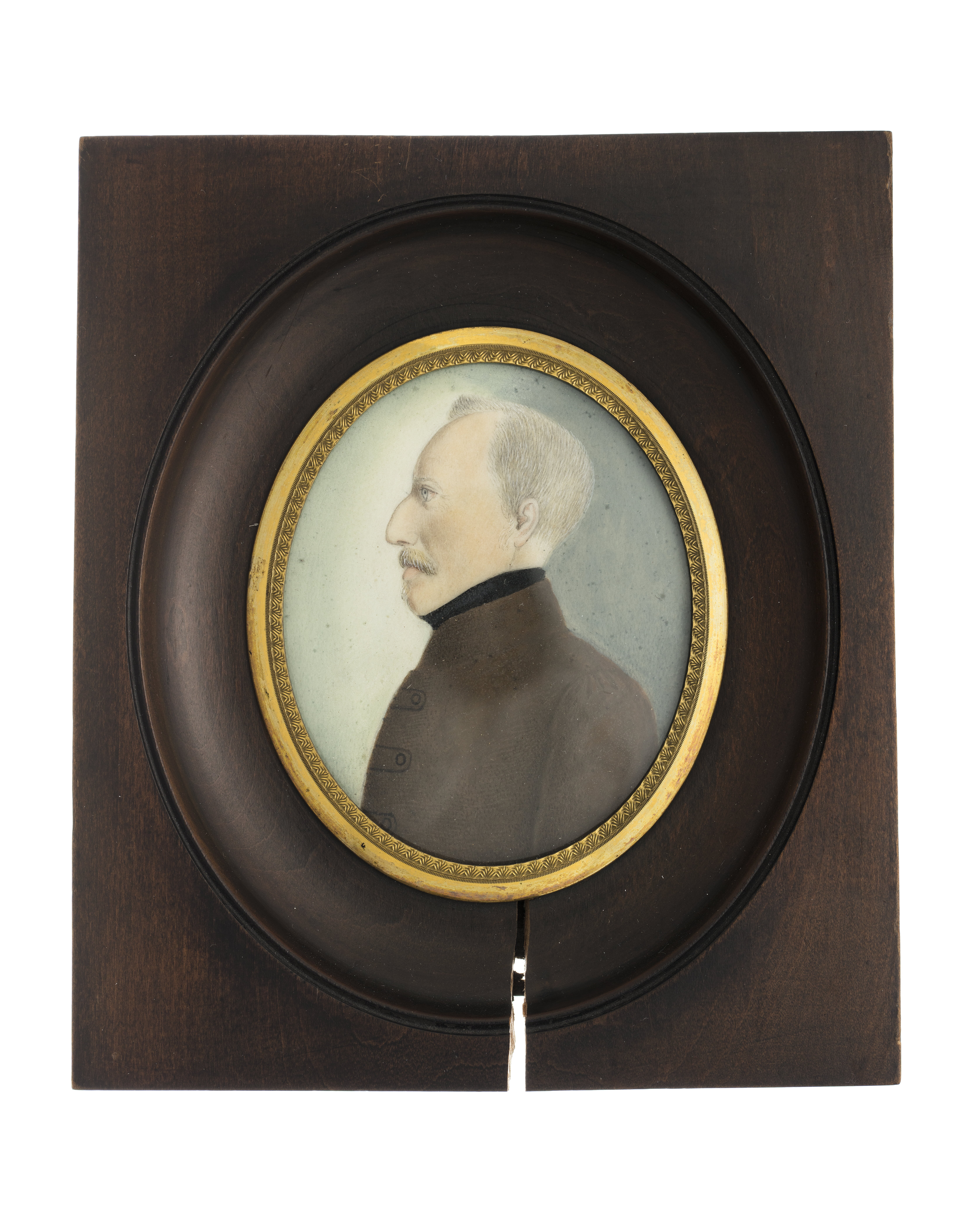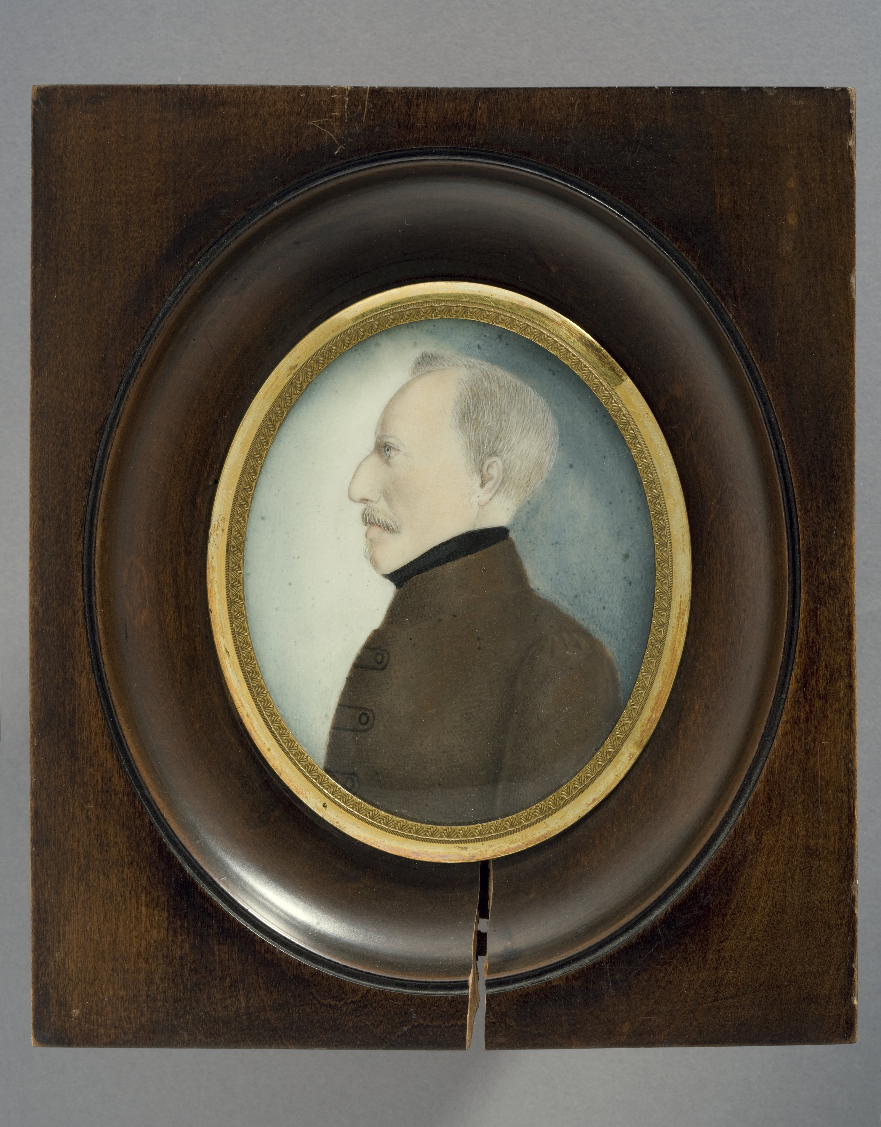 Oval akvarell på papper. Bröstbild, profil vänster, gråhårig, mustasch och litet skägg, grå rock, svart halsduk. Grågrön bakgrund. Rektangulär prydnadsram av mahogny med stor, oval fördjupning, glas med mässingsfattning. På baksidan klistrat svart, numera sönderrivet papper, upphängning med mässingsring.