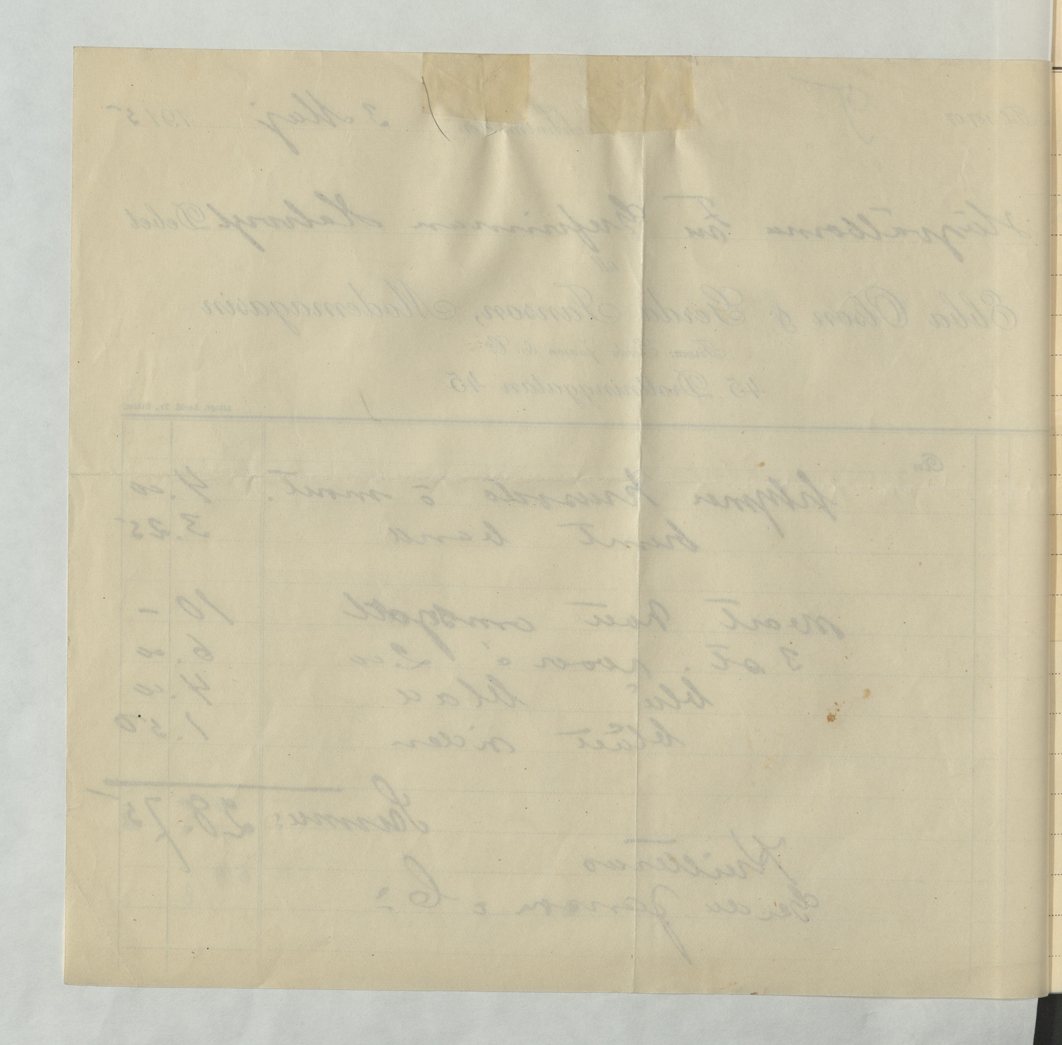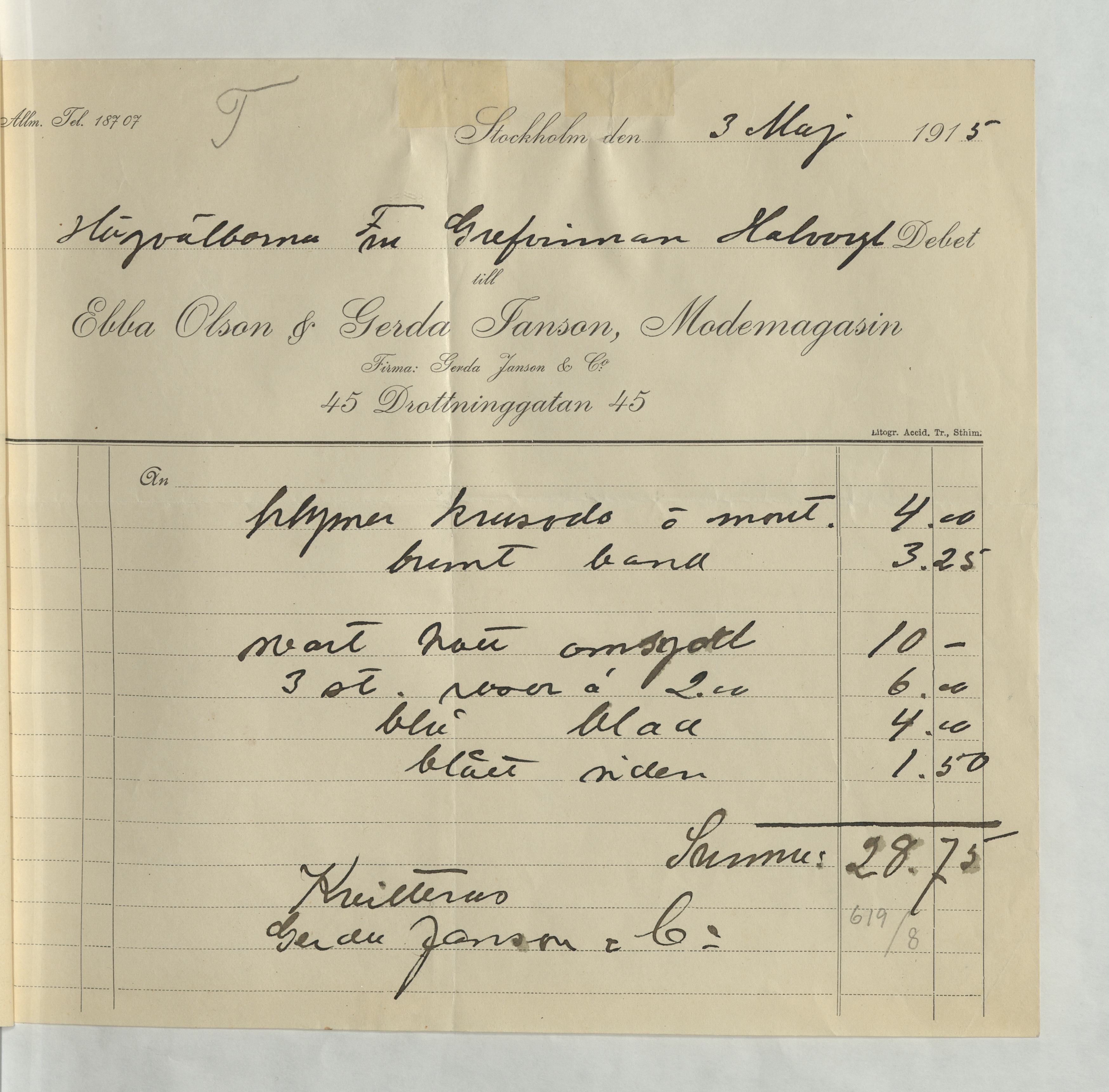 Kvitto från Ebba Olson & Gerda Janson, Modemagasin. Inköpt bl a blått band, blått siden och att man fått en svart hatt omsydd, för en totalsumma av 28:75Kr. Betalt Stockholm 3 maj 1915.