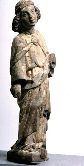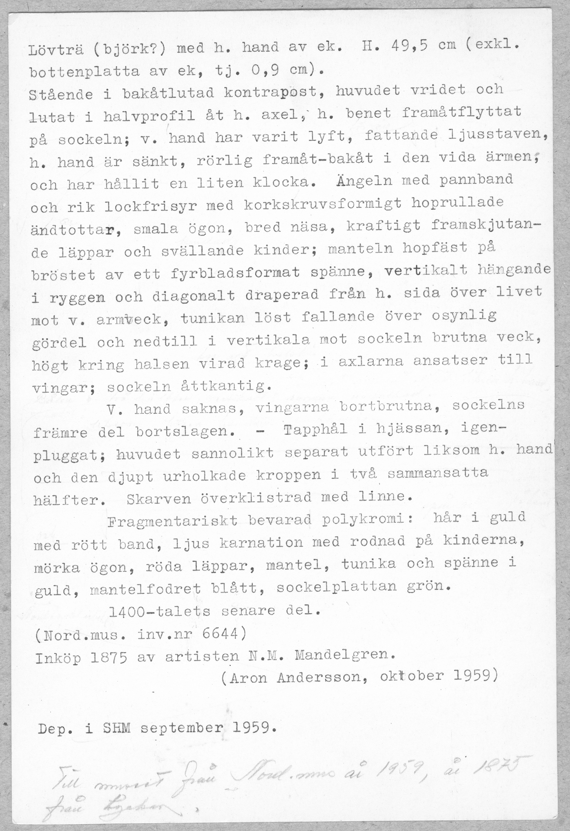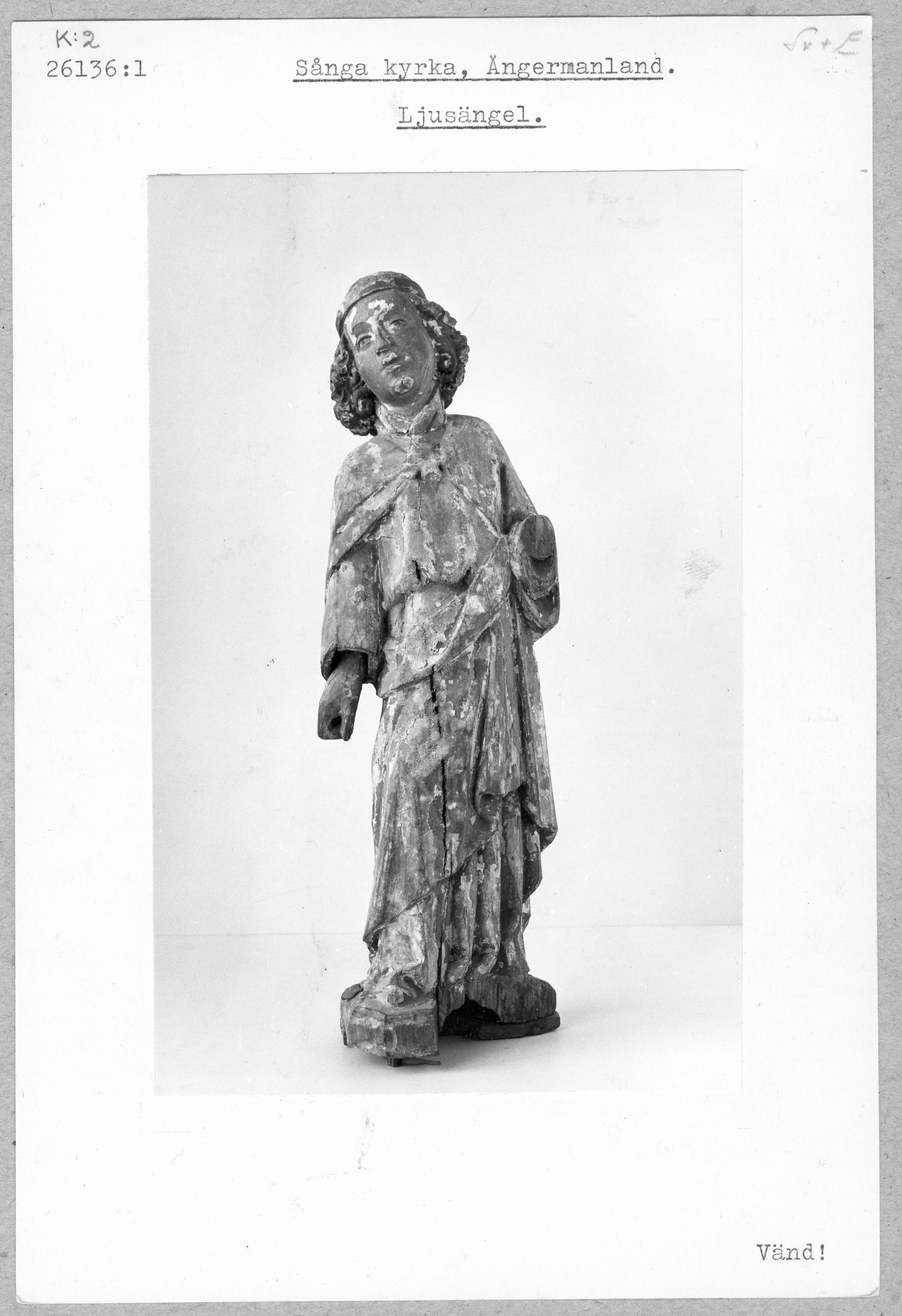 Kondition: vingar och vänster hand med ljushållaren bortbrutna, sockelns främre kant skadad. Färg: betydande fragment bevarade.