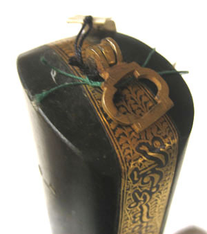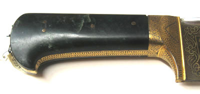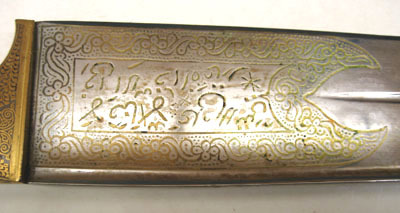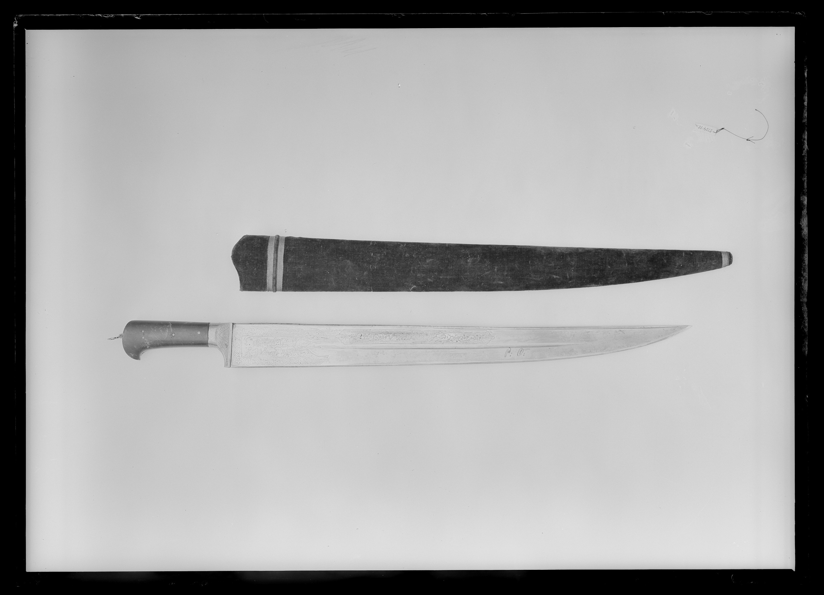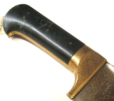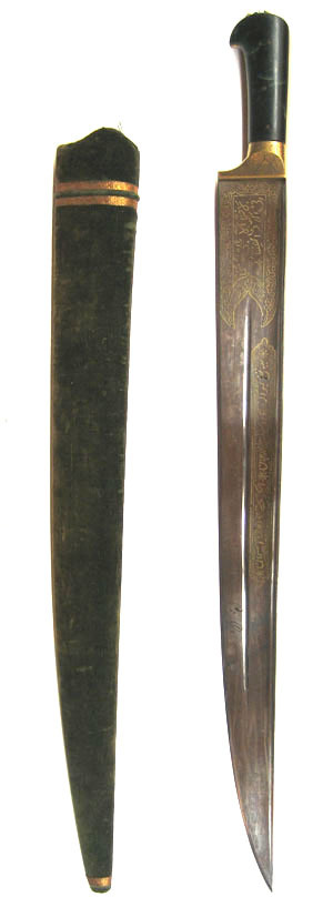 Fäste cylindrisk, något smalnande mot klingan med framskymtade näbb upptill, klätt med pånitade plattor av grön nefrit. På fram- och baksidan skenor av stål med ranka, på ryggen persisk eller arabisk inskrift av påslaget guld. Övergången mellan fästet och klingan beslagen med arabesker av påslaget guld. Kraftig, b: 49 mm, rak klinga av polerat stål, eneggad med förstärkt rak rygg, b: 8 mm. En hålkäl mitt på klingan som smalnar mot spetsen. Nära fästet och längs ryggen fält med etsade och förgyllda persiska eller arabiska inskrifter (se inv.1867). Märkt:"P:O:".