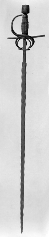 Eftergjord, imiterande typ från c.1600. Bygelfäste av mörkanlöpt stål. Knapp cylindrisk med ovalt tvärsnitt och plan (deformerad) översida, ornerad i låg relief runt livet med två motställda kvinnofigurer, varemellan ytornering av två stående fält med tre rosetter, den mellersta rund. Samtliga byglar platta och på utsidan med snedräfflat ytmönster; på insidan av handbygeln och nedre bygeln punsat ytmönster av rankor. Handbygel bågformig, överdelen nående nära knappens hals. Från handbygelns överdel utgår åt vardera ut- och insidan en nedåt- bakåtböjd sidobygel. Den förra övergående i en nästan rund nedre bygel, vars ändar är fästade vid de stora fingerbyglarnas nedre ändar, vid dessa en rakt utstående rundoval tvärbygel. Den senare förgrenande sig i höjd med krysset i tre bakåtböjda spänger, anslutande till fingerbyglarnas nederdel. Kavel med längsgående och vinkelställda räfflor och lindad med tvinnad tunn mässings- och silvertråd, upptill och nedtill kraftiga släta ringbeslag av mörkanlöpt stål. Klinga rak, tvåeggad, slipad med vågformiga eggar (flammig) och med en 120 mm lång, 16 mm bred ricasso ornerad med längsgående räfflor, på den smala fram- och baksidan en graverad enkel ranka.