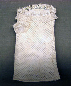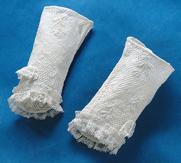 Vit halvvante i Marseillesöm på gasväv i linn/bomull. Rombmönster med blommverk spridda över hela vanten. På halvvantens översta kant är en spetskant i linne samt vid tummhålet.