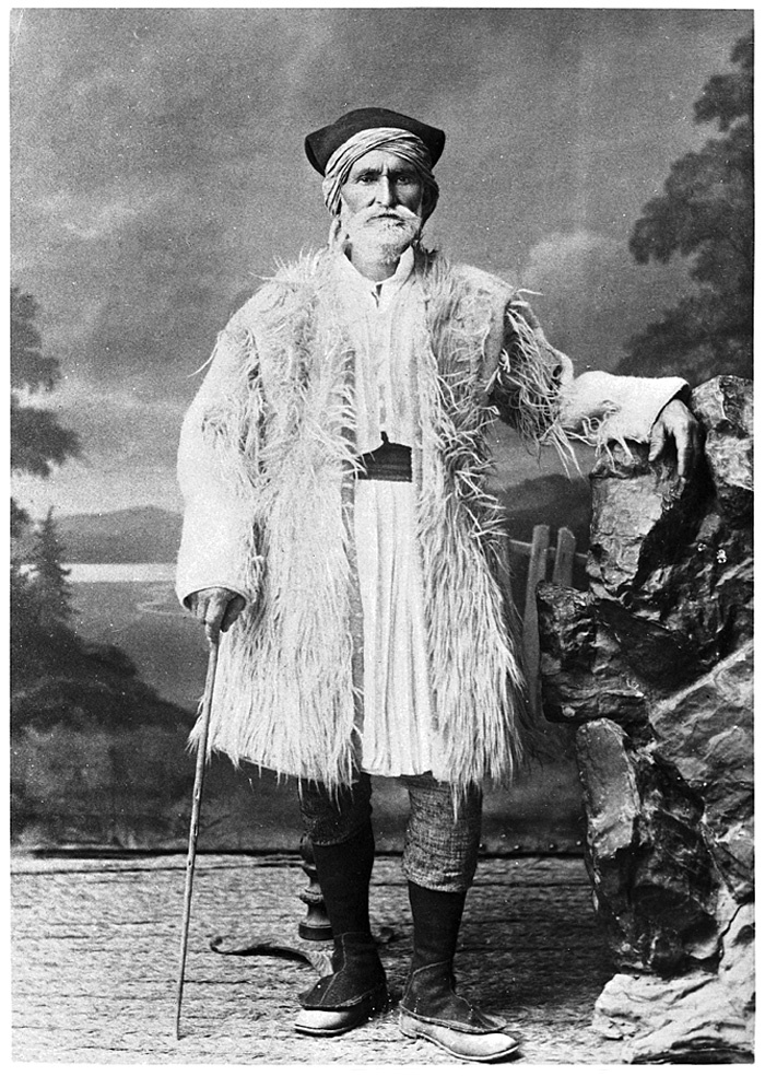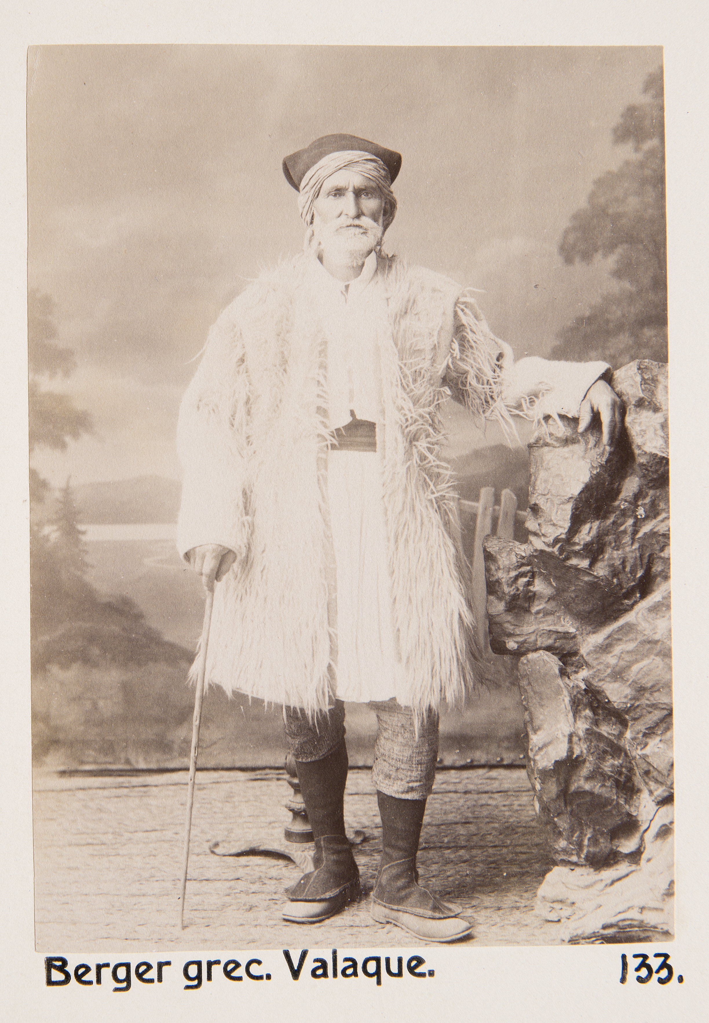Grekisk herde. Text på originalet: Berger grec. Valaque. Foto från resa genom Grekland, Makedonien och Serbien, 15 mars-6 juni 1896. Fotografierna LXVI:K.18.-147. är köpta av Wilhelmina von Hallwyl, f. Kempe på Korfu samt i Patras, Nafplion, Aten, Thessaloniki och Belgrad. Med på resan var maken Walther von Hallwyl och fröken Ida Uhse. Uppgifterna kommer från Ida Uhses reseanteckningar.