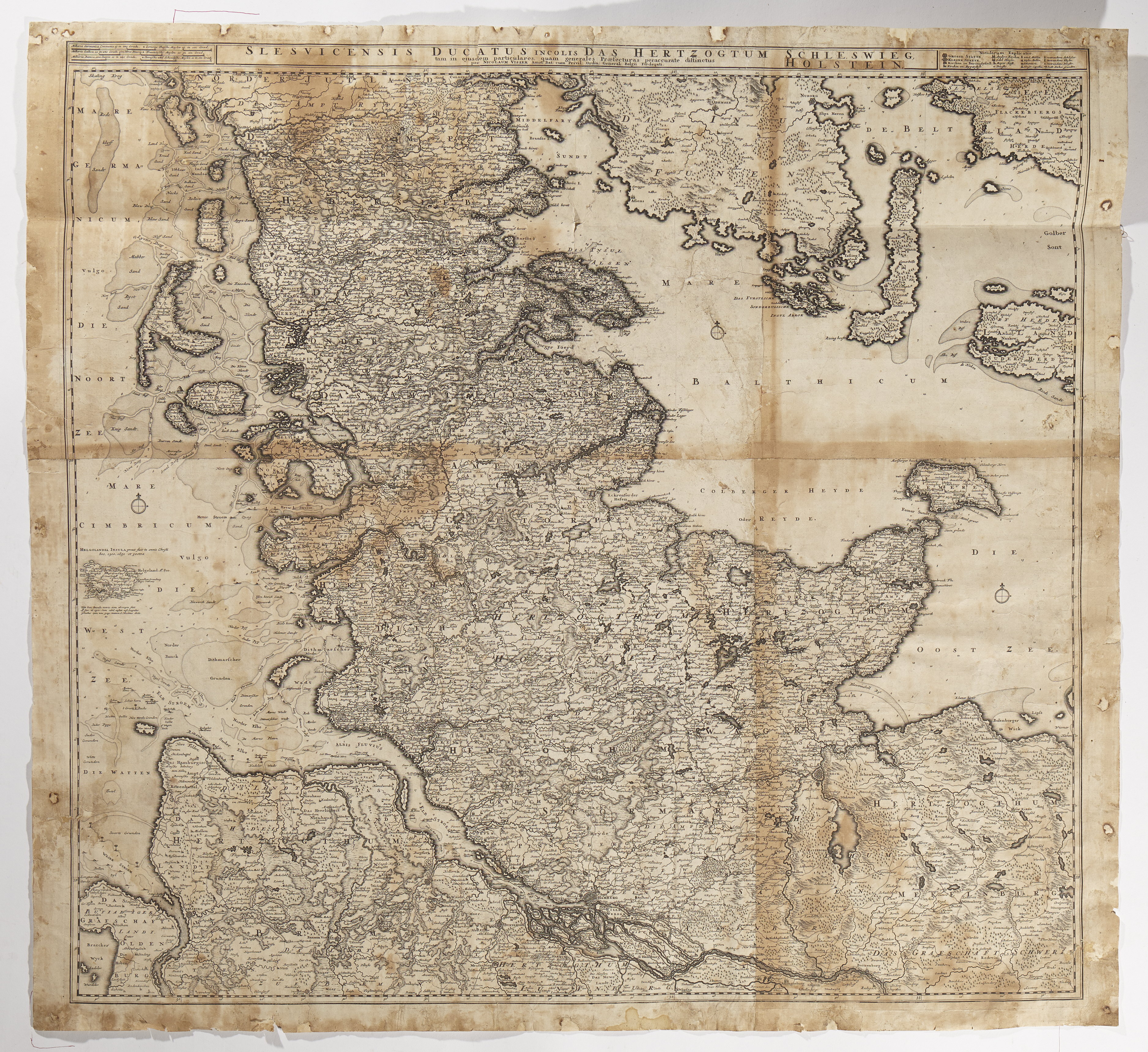 Koppartryck på papper. Rubrik: ”Slesvicensis ducatus incolis Das Hertzoghum Schleswieg, Holstein, tam in ejus dem particulares, quam generales...per Nicolaum Visser Amst:Bat: cum Privil: ordin: general Belgii Folderati” samt skala och föklaringar. Hopklistrad i fyra delar.