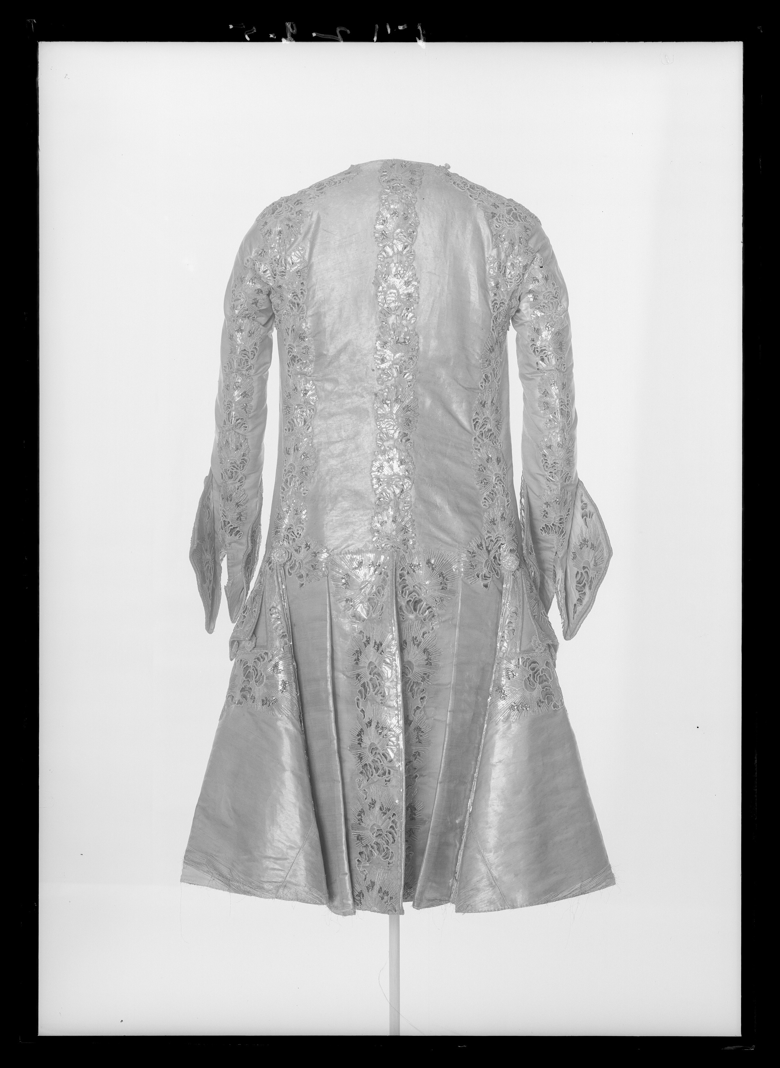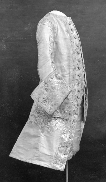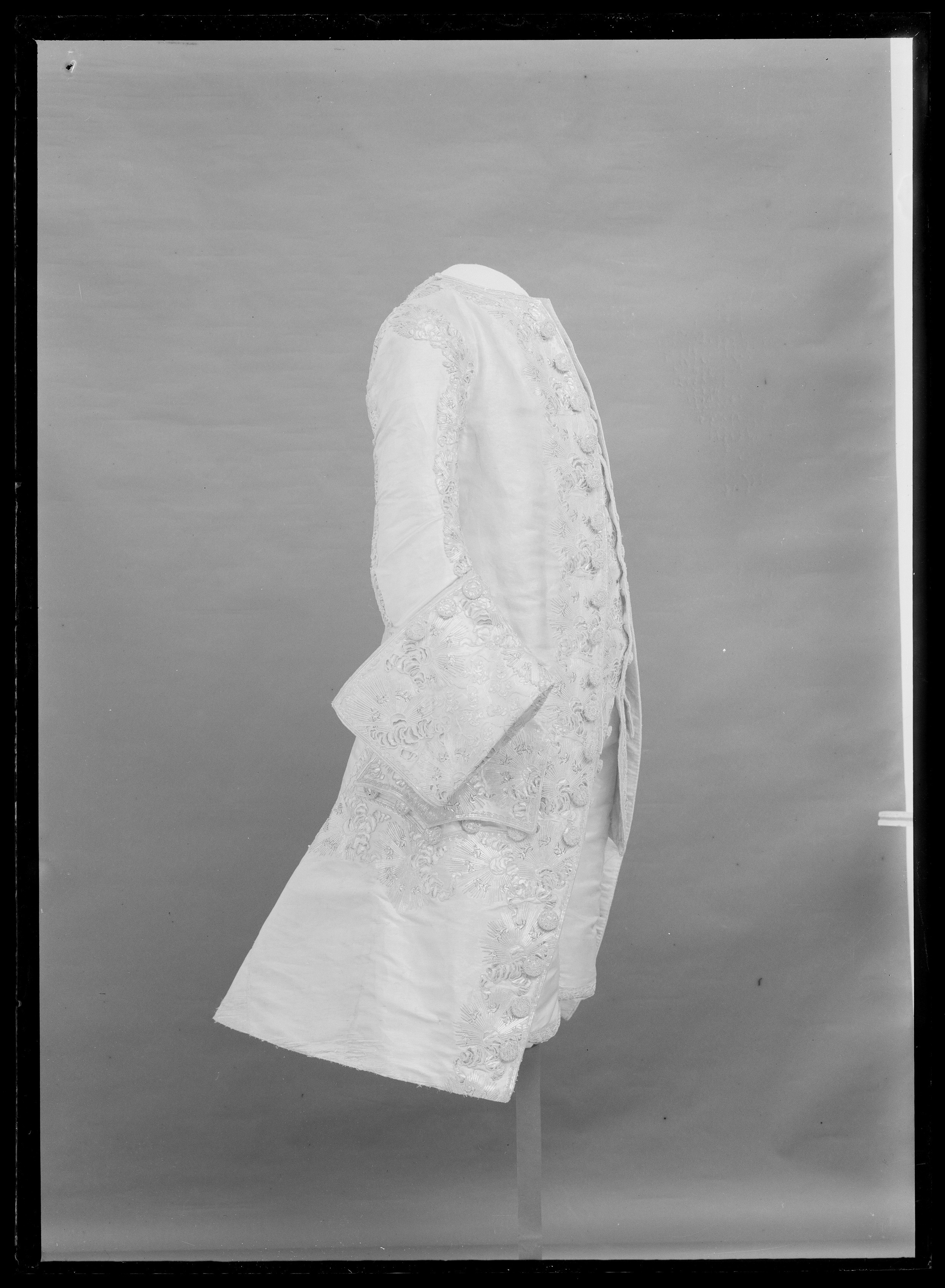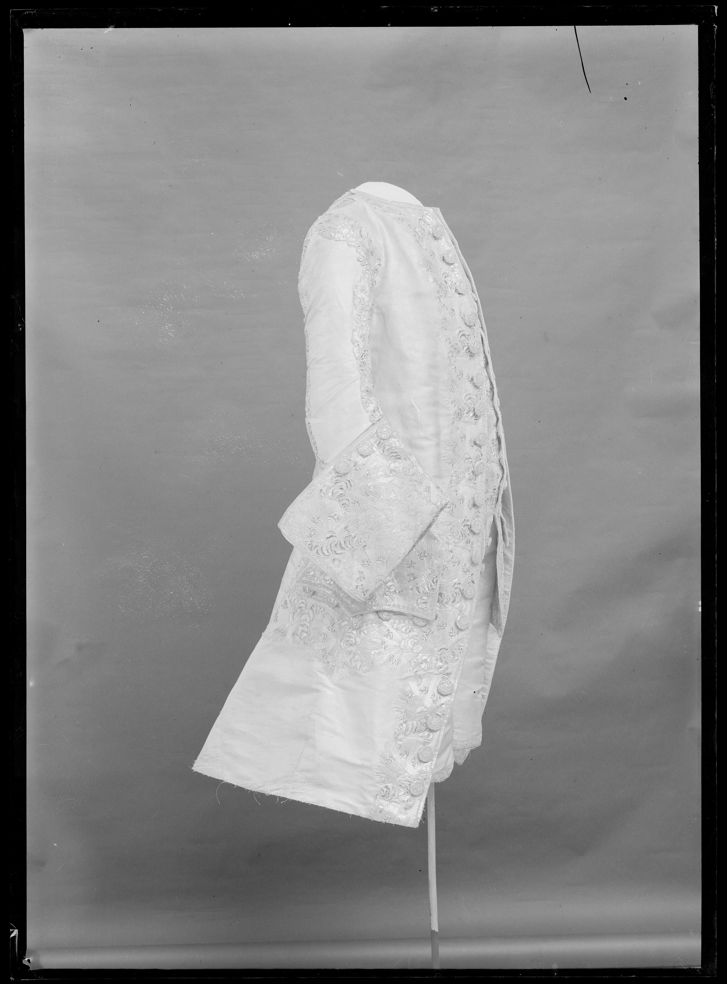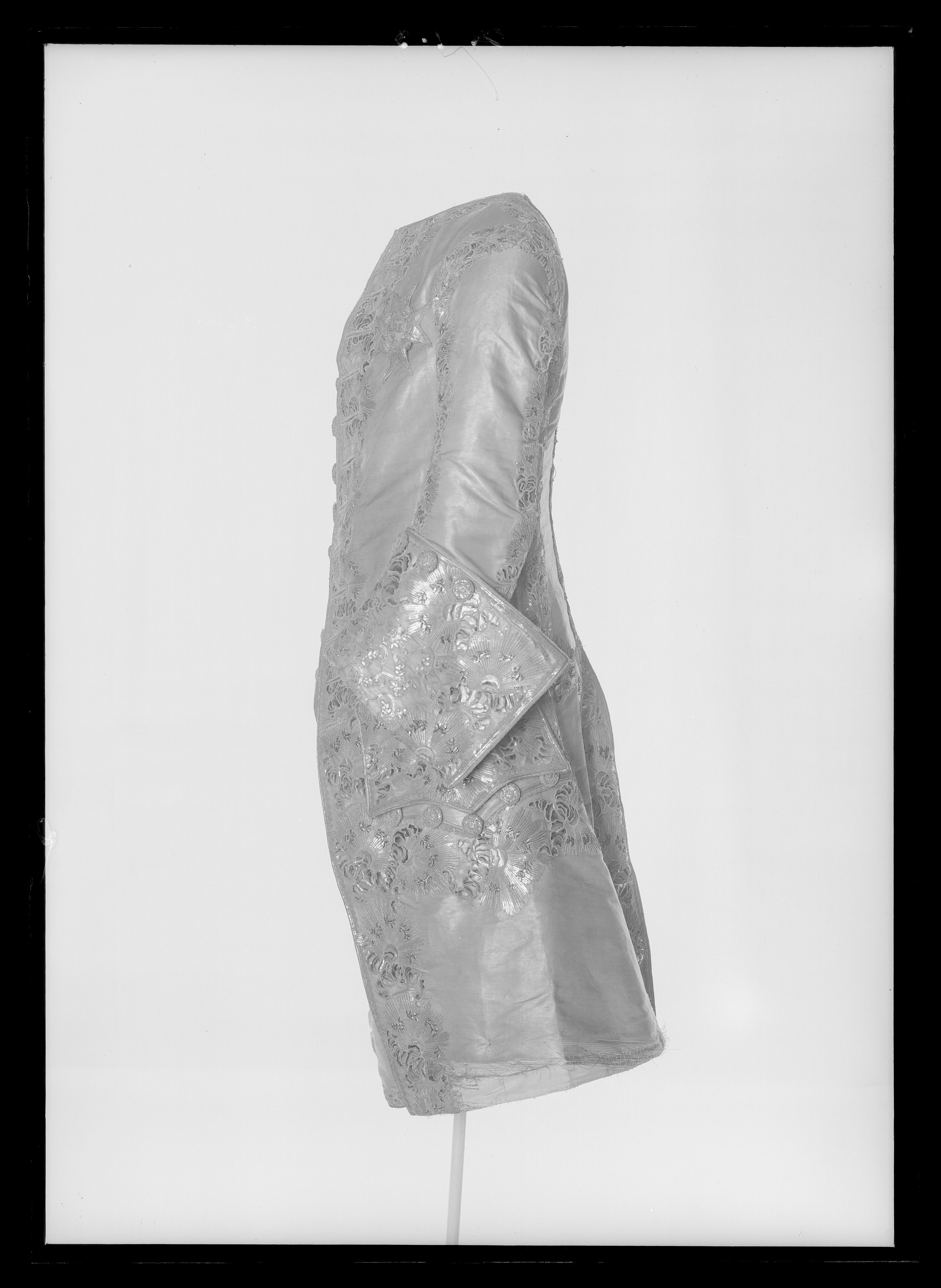 Använd vid bröllopet med Sofia Magdalena den 4 november 1766. Rock i silvertyg med svagt böjd framkant, vida skört med veckade sidsprund, snäva ärmar med mycket breda ärmuppslag eller manschetter. Den är mycket rikt dekorerad längs alla kanter med ett applikationsbroderi i blå metallfolie och guldtråd samt paljetter. Broderiet är av en typ där de olika dekorelementen kunde kombineras ihop på ett sätt som passade plagget och appliceras på plagget. Motivet som är detsamma på västen består av moln och strålande solar. Blomkvistar i strålarna. Mönsterrapporten är ca 11 cm och bredden ca 7 cm. Broderiet sitter längs med framkanten, på ficklocken och under ficklocken vid ficköppningen samt längs med sidsömmen, i sidsprunden, längs ärmhålssömmar, ärmsömmar och på manschetterna. I de inre delarna av vecken i sidskörten har broderiet kvar en otrolig gnistrande glans. Broderiet är av två storlekar i t.ex. sidsprundet är mönsterrapporten mindre. Längs med alla avslutande kanter på plagget löper en tunn snedvävd guldlinje samt en paljettrad samt en guldudd i av kantiljer på paljetter. Knappar: Knapparna är brodrade med paljetter och metalltråd som små smycken. Mitt fram sitter 18 knappar (ca 25 mm) den 19:onde saknas. Knapparna är fästade med 5,5-6 cm mellanrum. På ficklocken sitter 5 st (25 mm) knappar. Vänster sidsprund har 2 st (25 mm) knappar och Manchetten 4 st. Knapphålen är 12 och flertalet har nog inte knäppts, raden slutar vid ficklocken. Knapphålen är skodda med guldtråd. Vid höger axelsöm finns knapp och snodd för ordensband. Tygbredd ca 50 cm Vävteknik: kypert, inslag i silke och silverlanomspunnet silke. Foder i silvermoiré gjort på en vävd sidenrips som bl.a. har silverlan som inslag. Ryggen och ärmfodret i sidenkypert. Manchettens insida är i annat tyg, en rips, samma som fodret. Rocken finns uppritad, där de veckade spundens skärning blir tydlig. För att ta vara på det dyrbara tyget förekommer skarvar inne i skörtet. Anm. Broderierna är sannolikt utförda av den franske hovbrodören Léger Trémeau. Den 15 december 1767 levererar han en väst till franske kungen med ett noga beskrivet broderi som mycket väl överensstämmer med broderierna i Gustav III:s bilägersdräkt. Se Fastes de cour et ceremonies royales, s 90-91 Anm. Kraschanen broderad i Christoffer Sergels ateljé. Bilägersdräkten beställdes till Gustavs bröllop med Sofia Magdalena. Dräkten tillverkades i Paris och broderierna ansågs redan då mycket fina. se vidare brev ...(Lena) Redan 1773 finns dräkten i Klädkammaren. Enligt äldre vägledningar av livrustkammaren verkar dräkten ha varit utställd ganska länge under 1800-talets andra hälft och en bra bit in på 1900-talet.