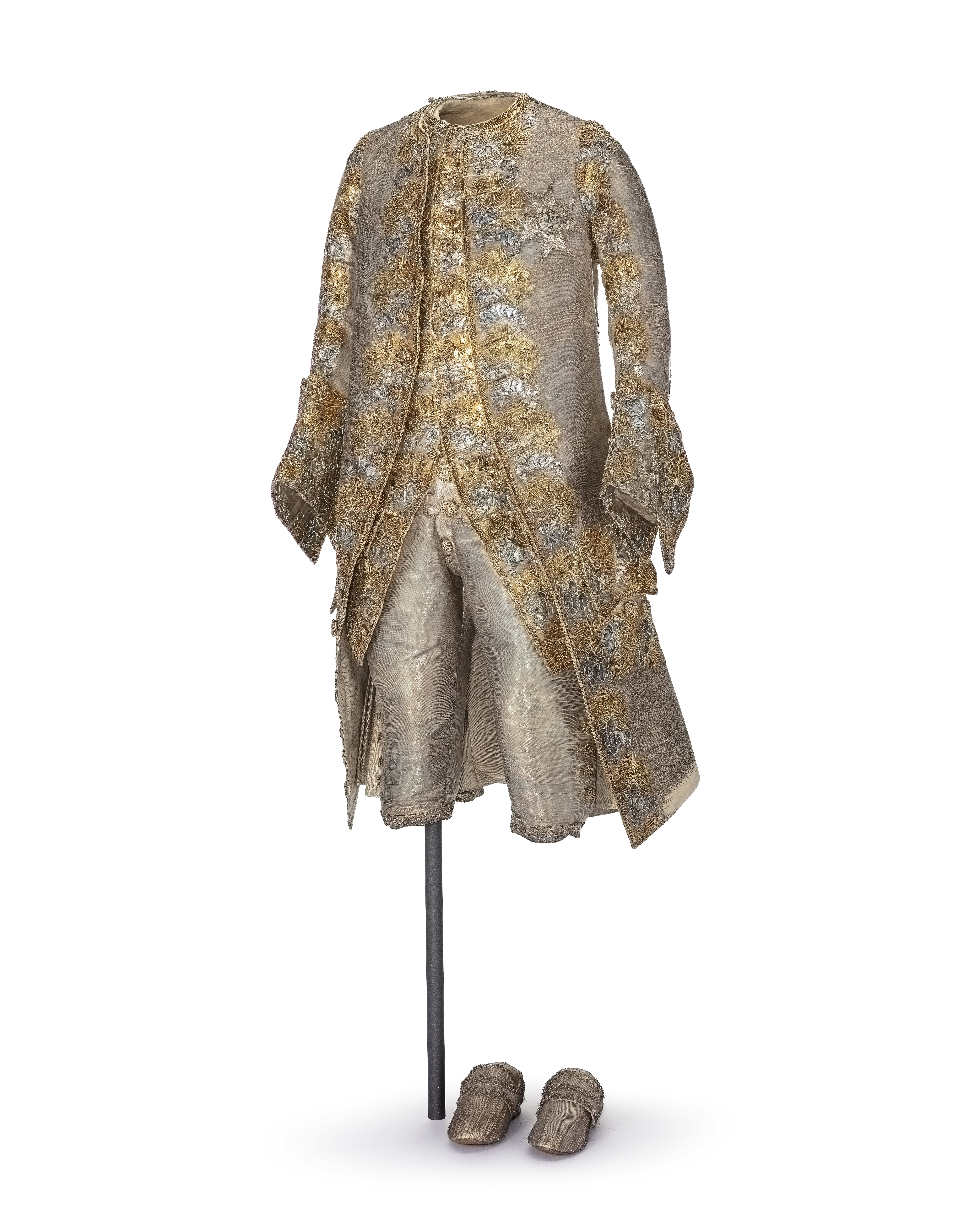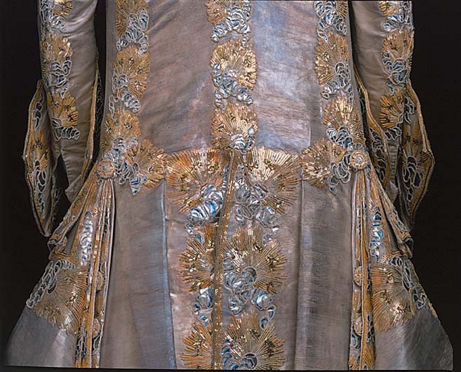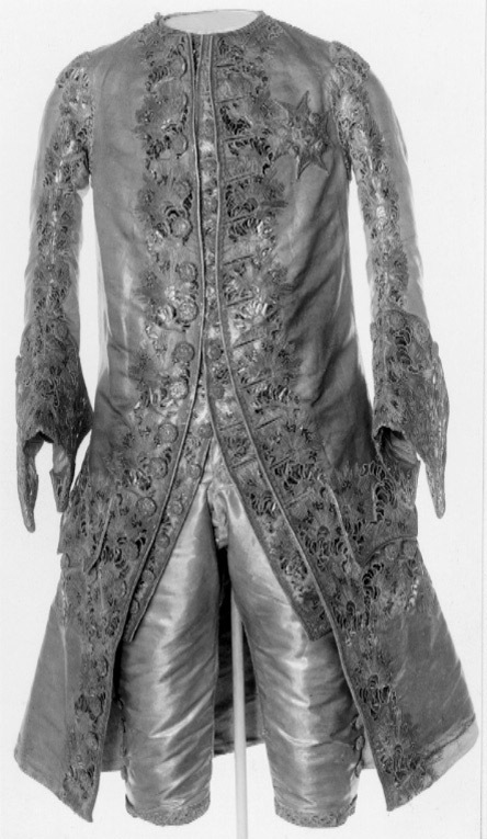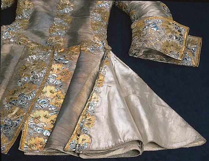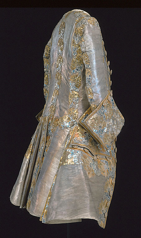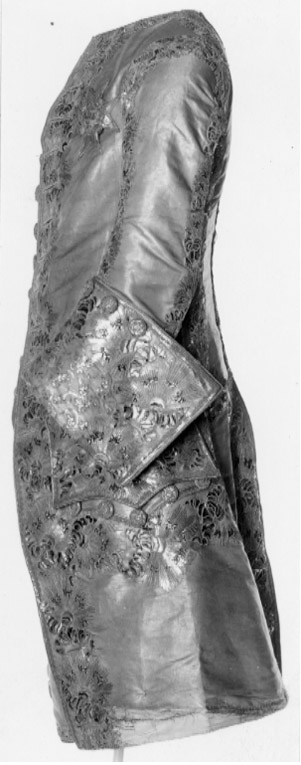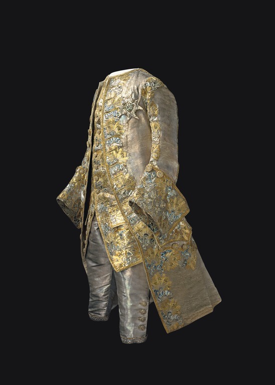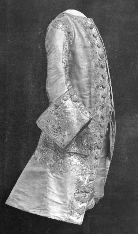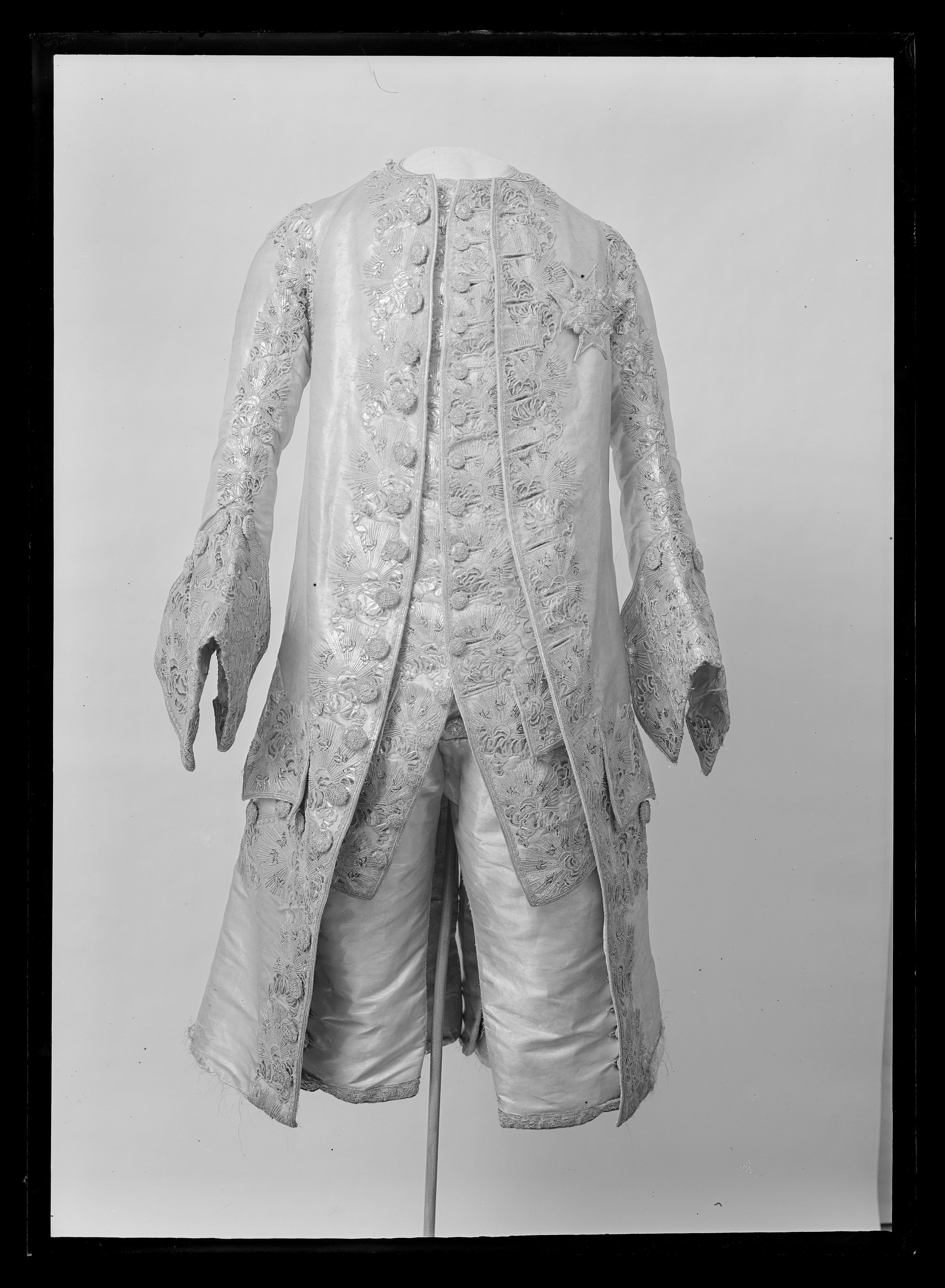 Använd vid bröllopet med Sofia Magdalena den 4 november 1766. Rock i silvertyg med svagt böjd framkant, vida skört med veckade sidsprund, snäva ärmar med mycket breda ärmuppslag eller manschetter. Den är mycket rikt dekorerad längs alla kanter med ett applikationsbroderi i blå metallfolie och guldtråd samt paljetter. Broderiet är av en typ där de olika dekorelementen kunde kombineras ihop på ett sätt som passade plagget och appliceras på plagget. Motivet som är detsamma på västen består av moln och strålande solar. Blomkvistar i strålarna. Mönsterrapporten är ca 11 cm och bredden ca 7 cm. Broderiet sitter längs med framkanten, på ficklocken och under ficklocken vid ficköppningen samt längs med sidsömmen, i sidsprunden, längs ärmhålssömmar, ärmsömmar och på manschetterna. I de inre delarna av vecken i sidskörten har broderiet kvar en otrolig gnistrande glans. Broderiet är av två storlekar i t.ex. sidsprundet är mönsterrapporten mindre. Längs med alla avslutande kanter på plagget löper en tunn snedvävd guldlinje samt en paljettrad samt en guldudd i av kantiljer på paljetter. Knappar: Knapparna är brodrade med paljetter och metalltråd som små smycken. Mitt fram sitter 18 knappar (ca 25 mm) den 19:onde saknas. Knapparna är fästade med 5,5-6 cm mellanrum. På ficklocken sitter 5 st (25 mm) knappar. Vänster sidsprund har 2 st (25 mm) knappar och Manchetten 4 st. Knapphålen är 12 och flertalet har nog inte knäppts, raden slutar vid ficklocken. Knapphålen är skodda med guldtråd. Vid höger axelsöm finns knapp och snodd för ordensband. Tygbredd ca 50 cm Vävteknik: kypert, inslag i silke och silverlanomspunnet silke. Foder i silvermoiré gjort på en vävd sidenrips som bl.a. har silverlan som inslag. Ryggen och ärmfodret i sidenkypert. Manchettens insida är i annat tyg, en rips, samma som fodret. Rocken finns uppritad, där de veckade spundens skärning blir tydlig. För att ta vara på det dyrbara tyget förekommer skarvar inne i skörtet. Anm. Broderierna är sannolikt utförda av den franske hovbrodören Léger Trémeau. Den 15 december 1767 levererar han en väst till franske kungen med ett noga beskrivet broderi som mycket väl överensstämmer med broderierna i Gustav III:s bilägersdräkt. Se Fastes de cour et ceremonies royales, s 90-91 Anm. Kraschanen broderad i Christoffer Sergels ateljé. Bilägersdräkten beställdes till Gustavs bröllop med Sofia Magdalena. Dräkten tillverkades i Paris och broderierna ansågs redan då mycket fina. se vidare brev ...(Lena) Redan 1773 finns dräkten i Klädkammaren. Enligt äldre vägledningar av livrustkammaren verkar dräkten ha varit utställd ganska länge under 1800-talets andra hälft och en bra bit in på 1900-talet.